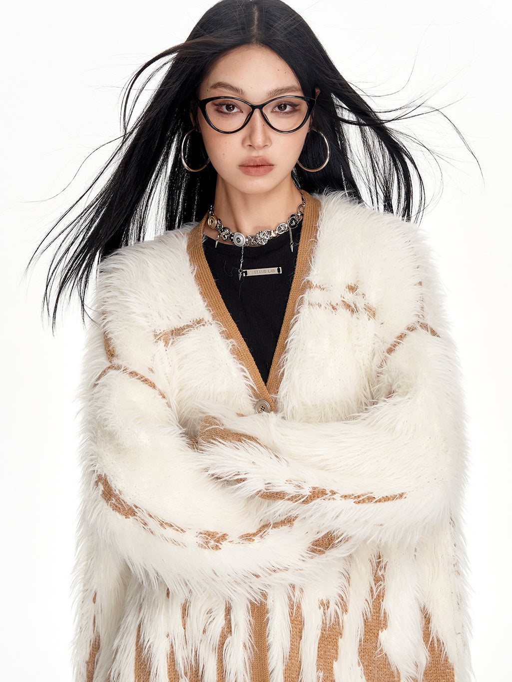 Lockerer, flauschiger langer Cardigan aus Mohairstrick mit V-Ausschnitt