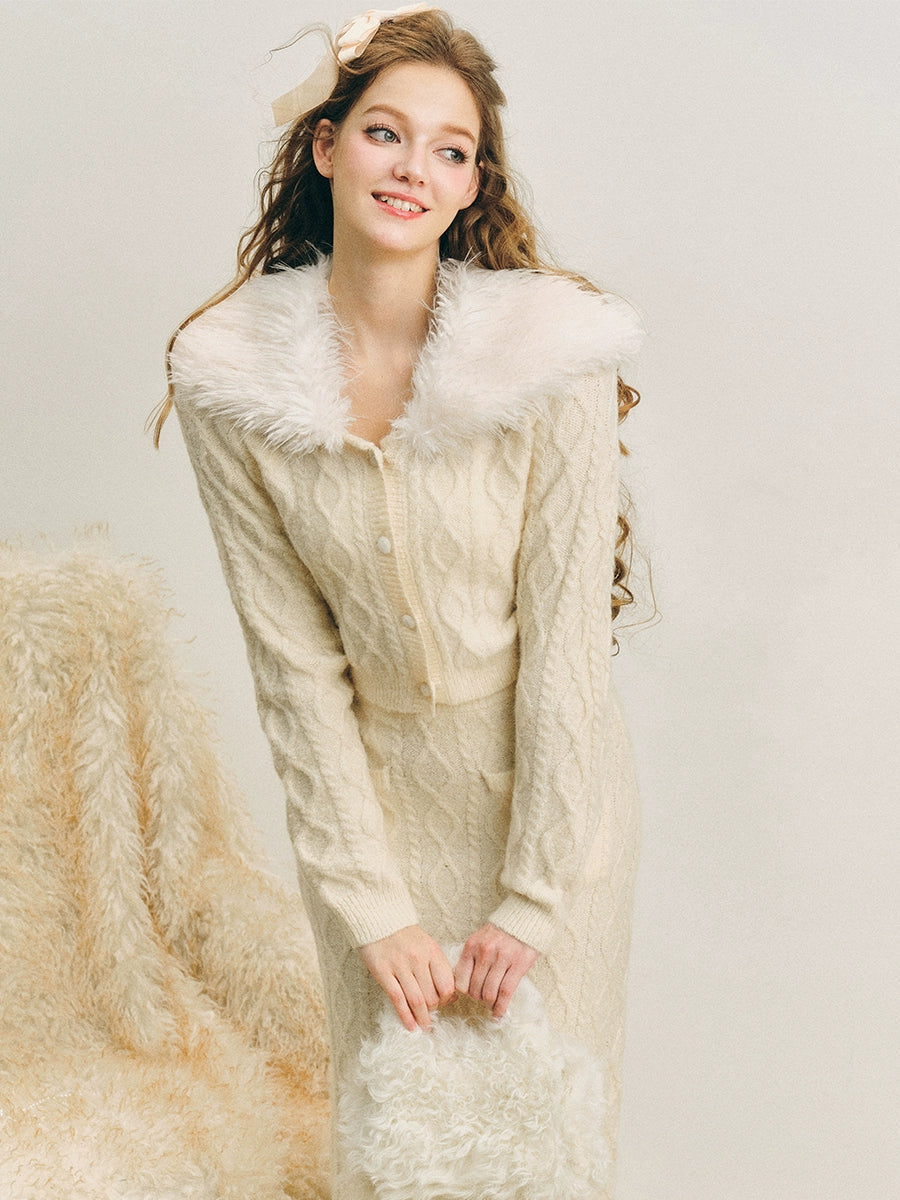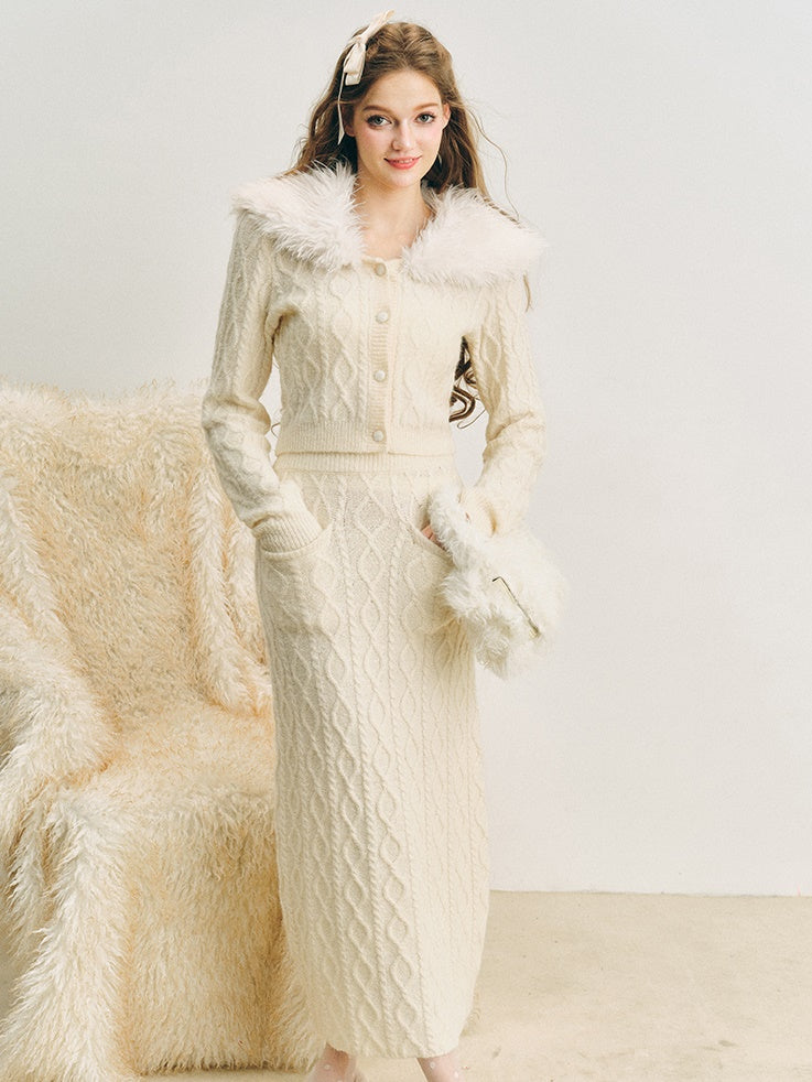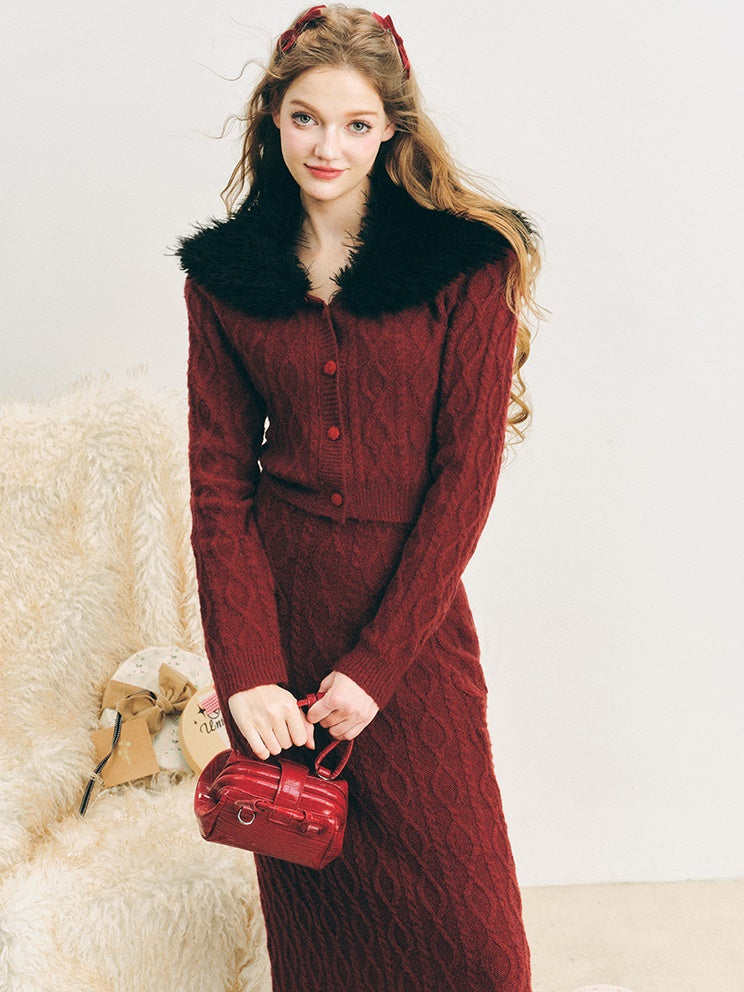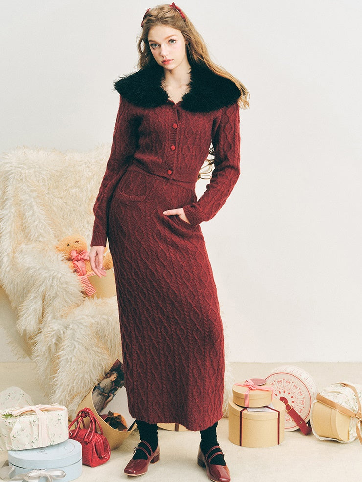 Pelzkragen Twist Strick -Strickjacke & langer Rock