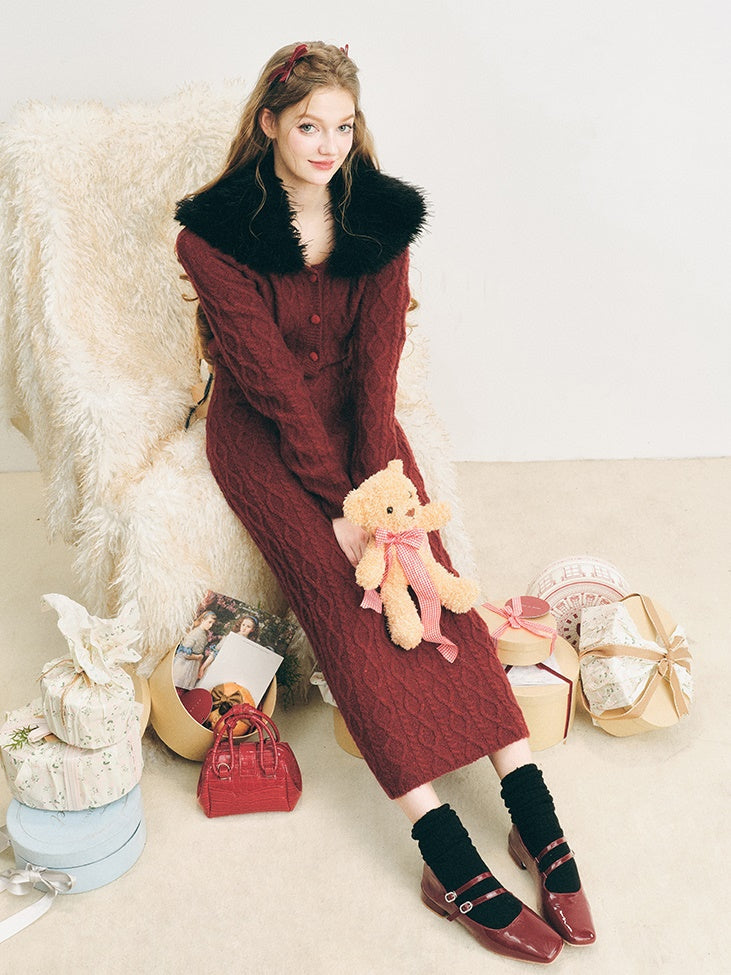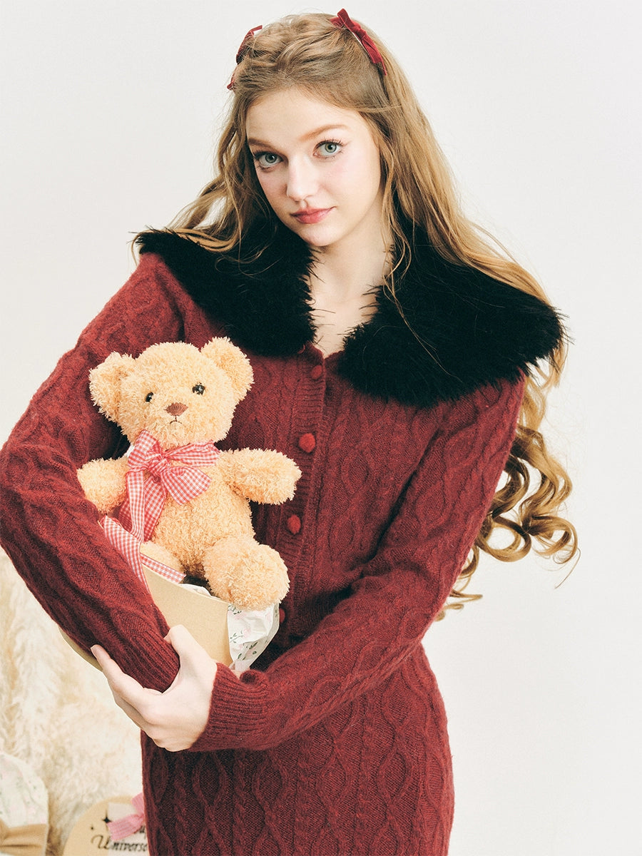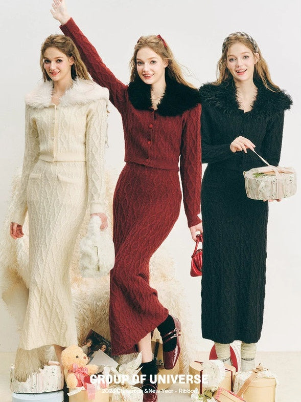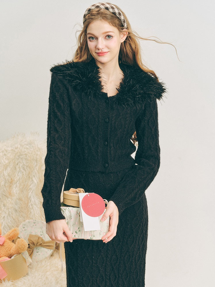 Pelzkragen Twist Strick -Strickjacke & langer Rock