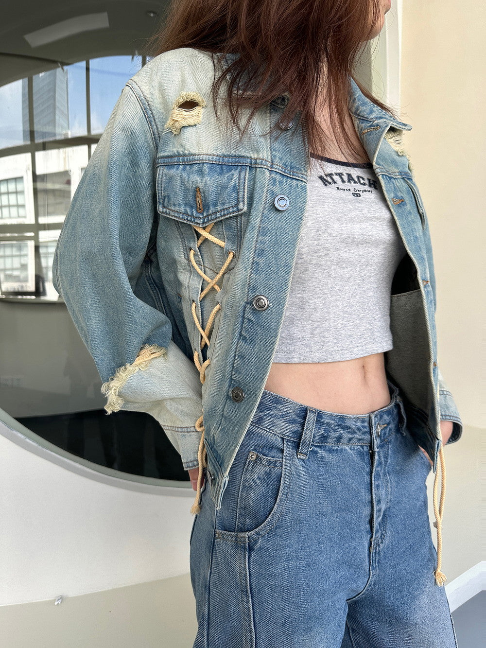 Gewaschener Schnür-up Nichi Vintage Casual Denim-Jacket