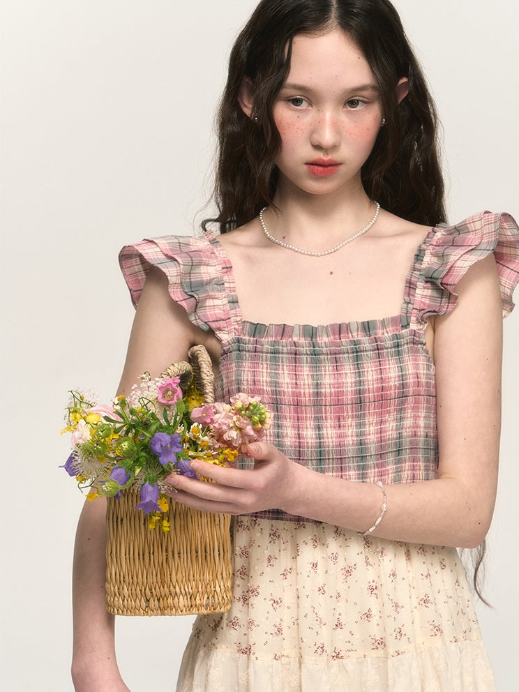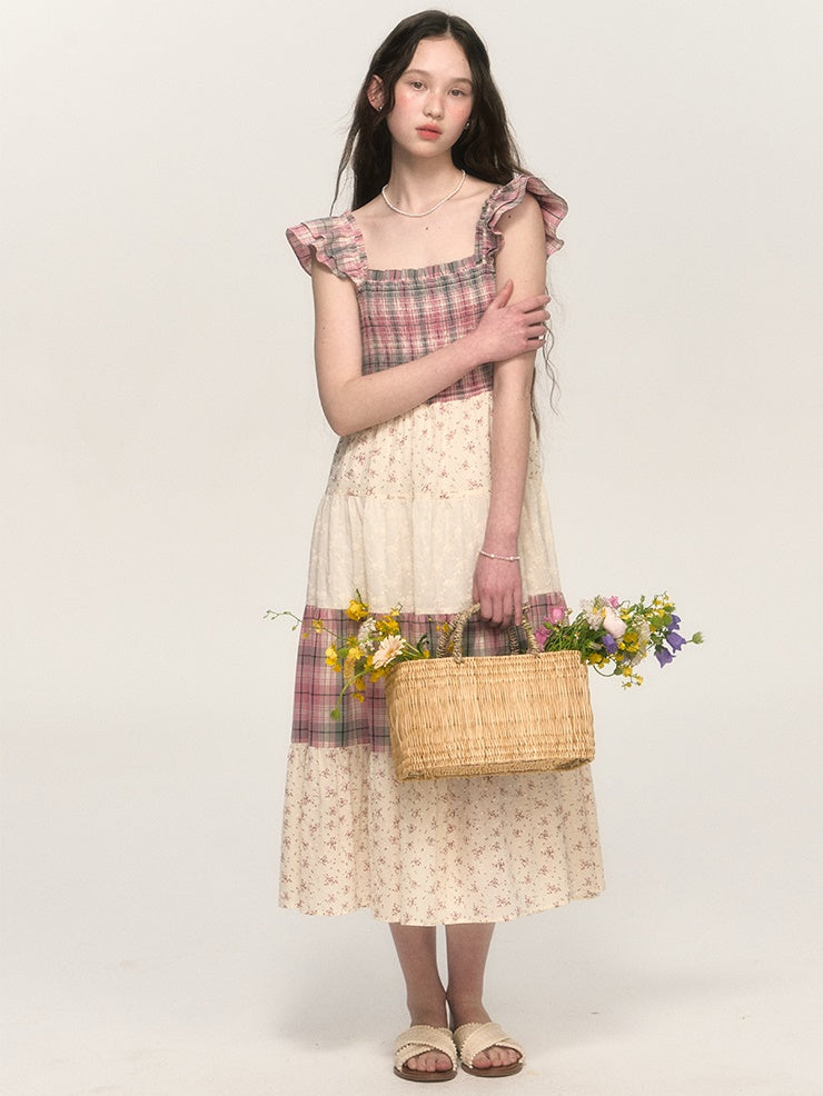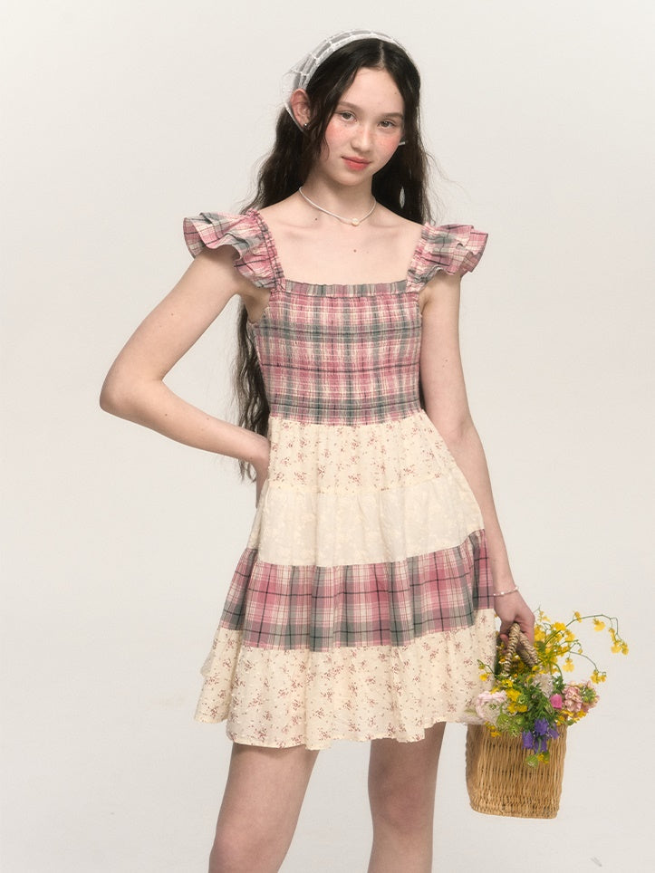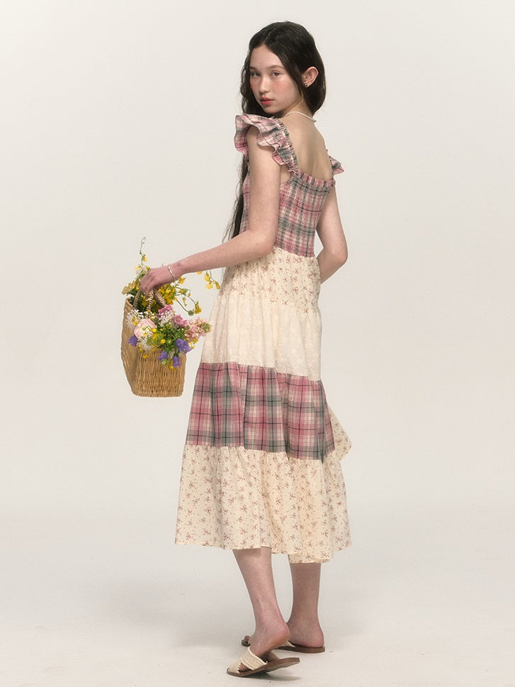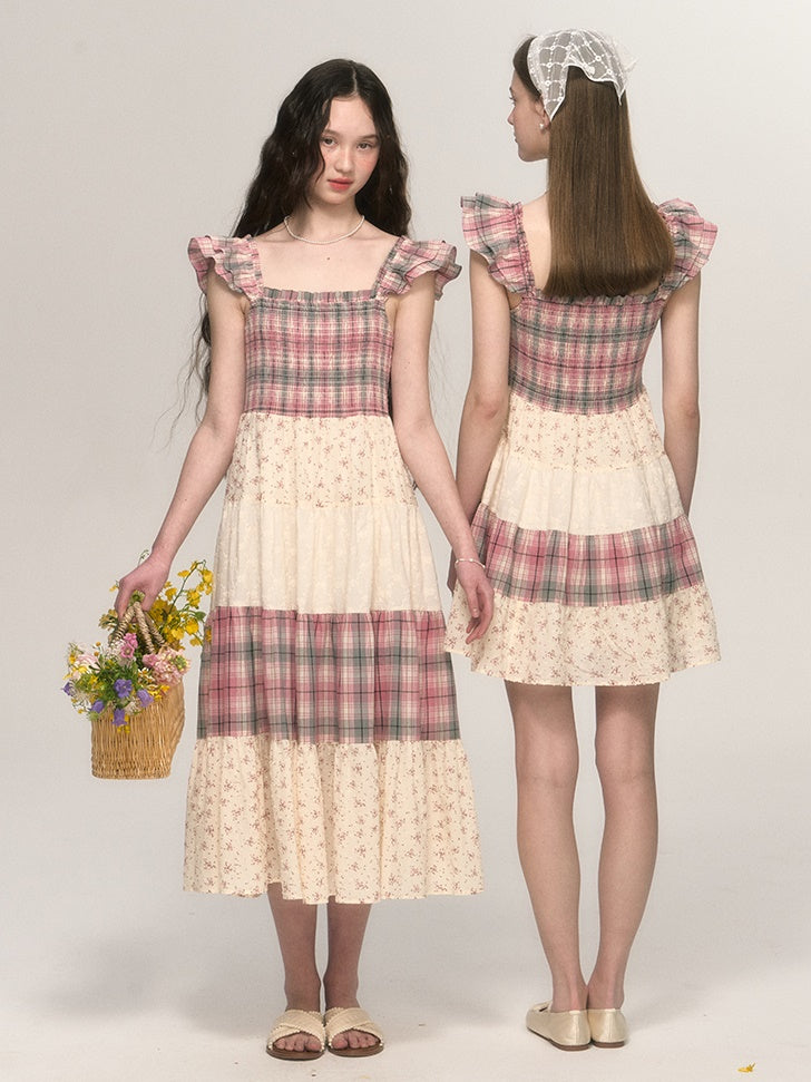 Retro Plaid Floral Lace Patchwork Small Flying Sleeves Dress