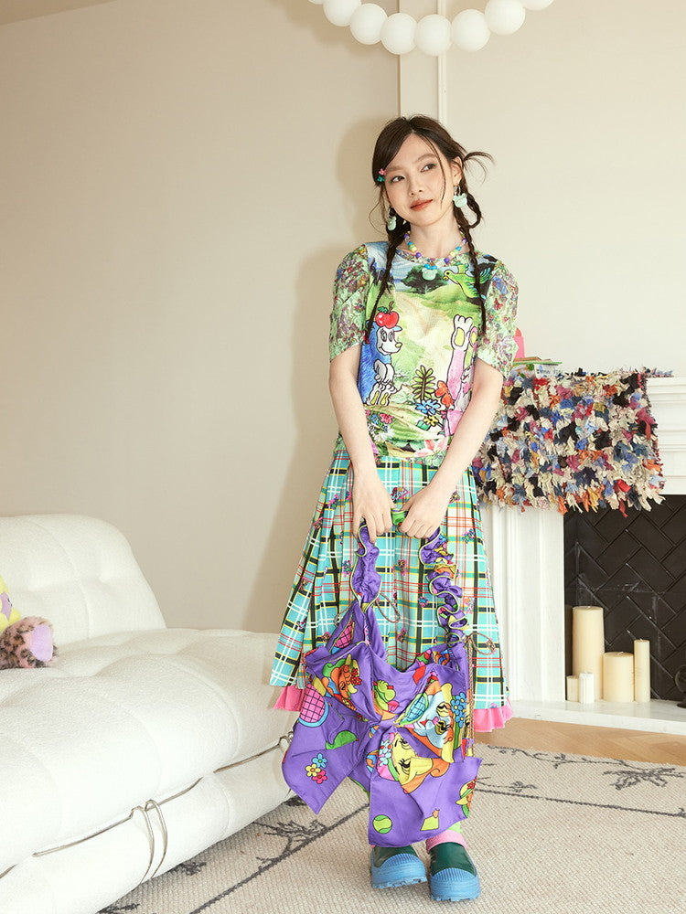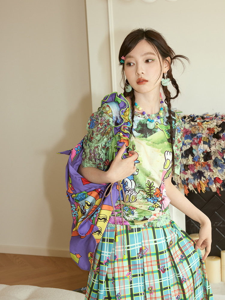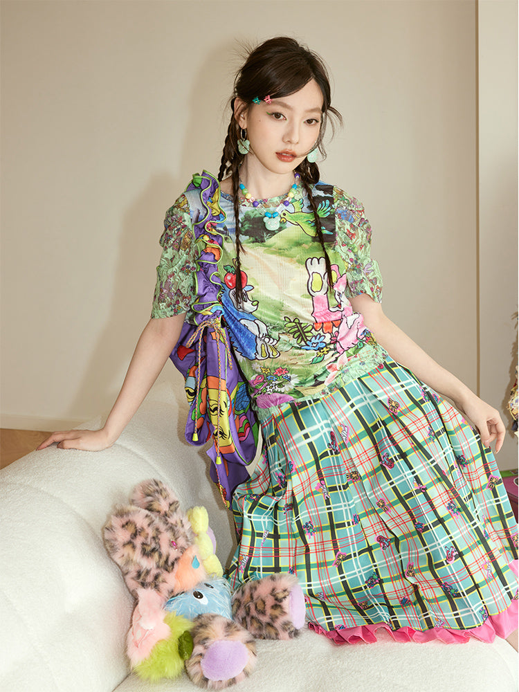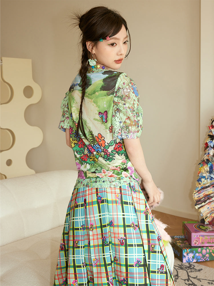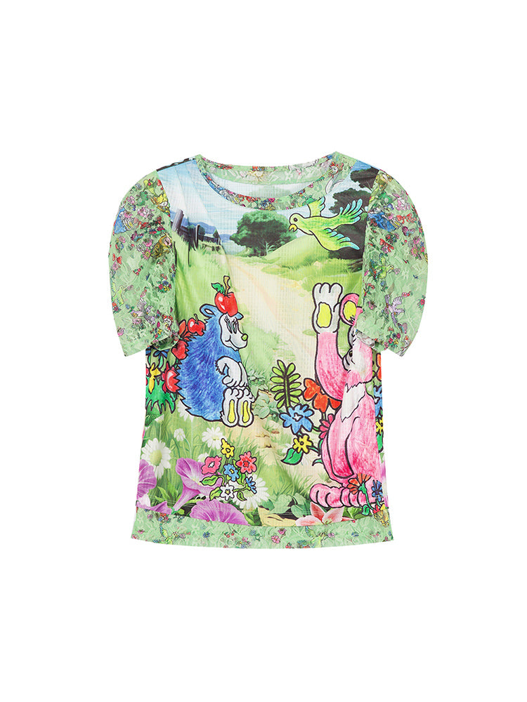 Lace-Sleeve Pop Crew-Neck Fancy T-Shirt