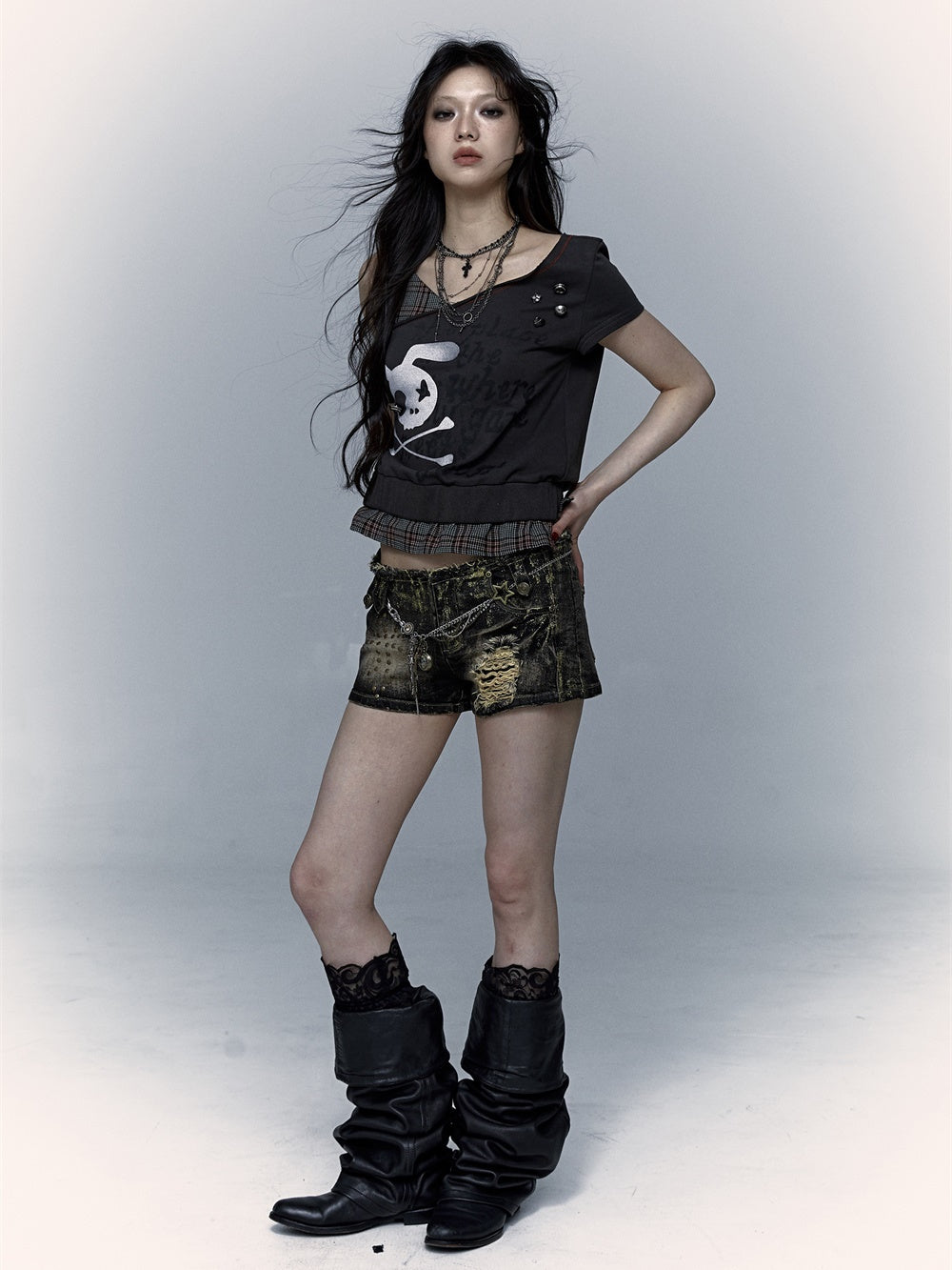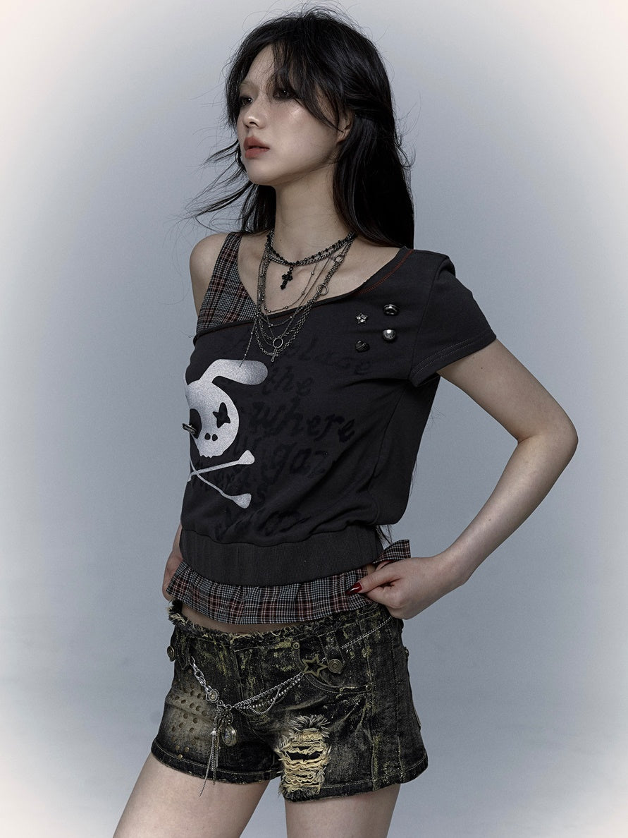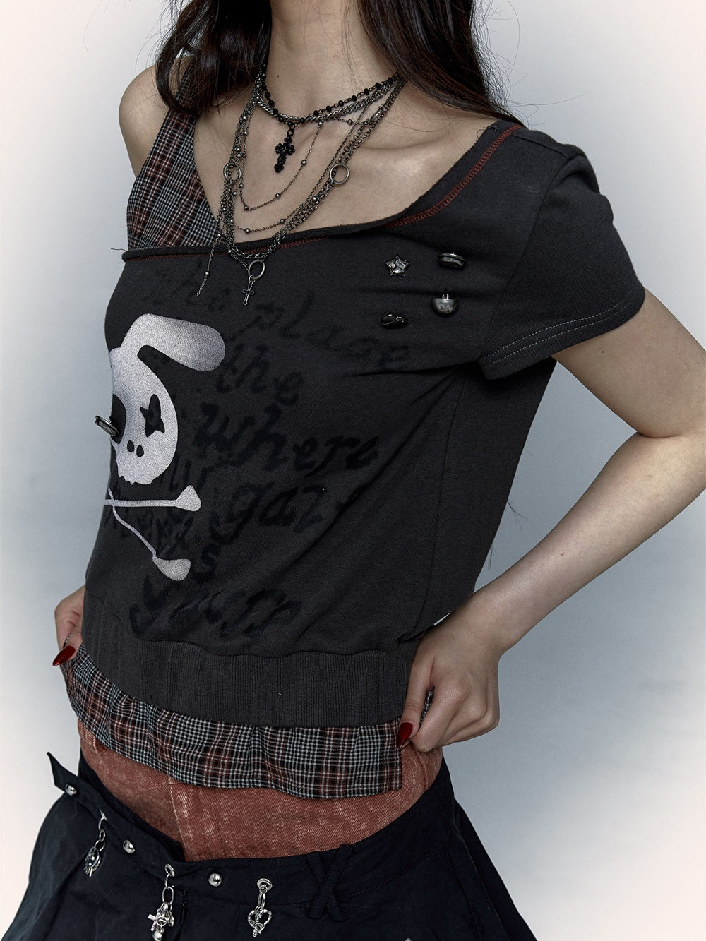 Punk Street Patchwork Plaid Fake Two-piece T-shirt