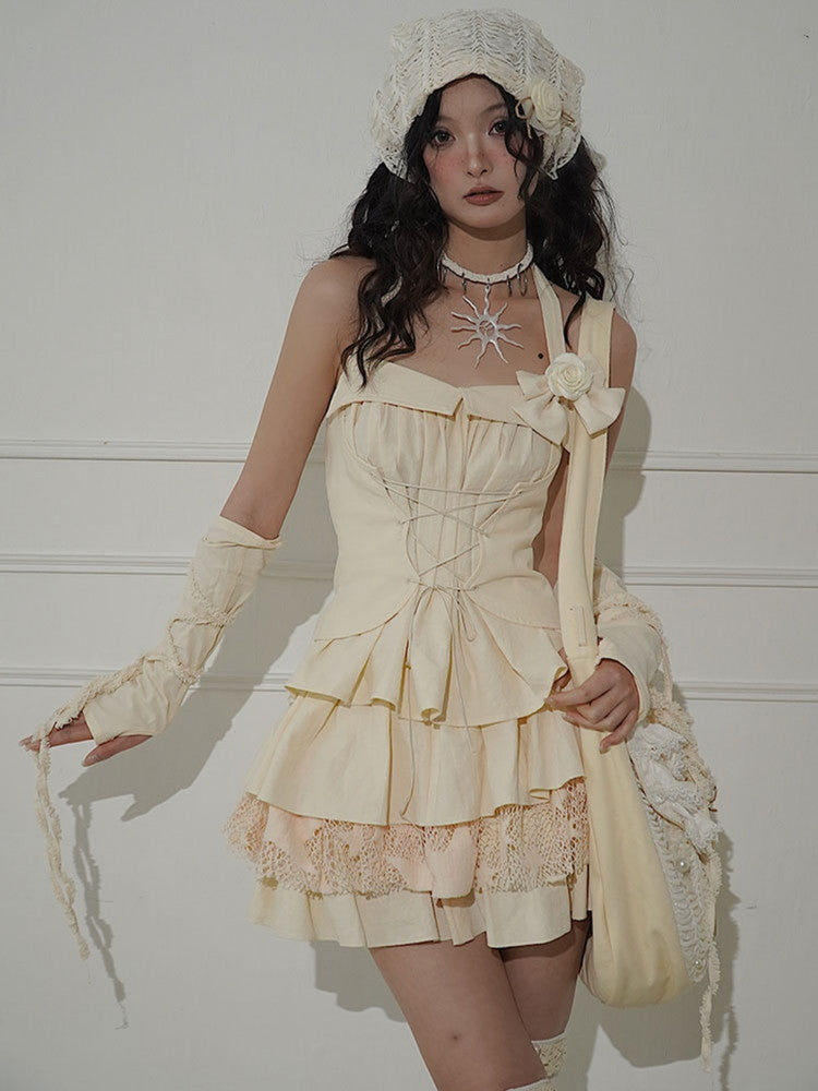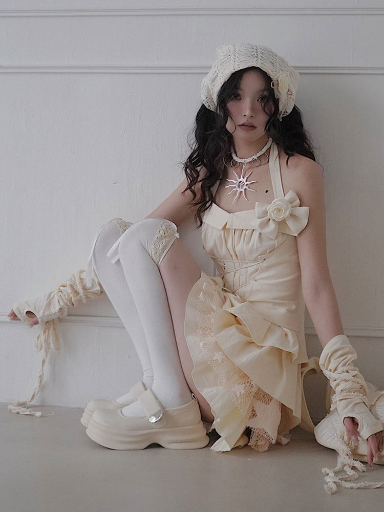 Set-Up Lace-Up Star Tiered Mesh Lace Halter-Neck Tops&Mini-Skirt