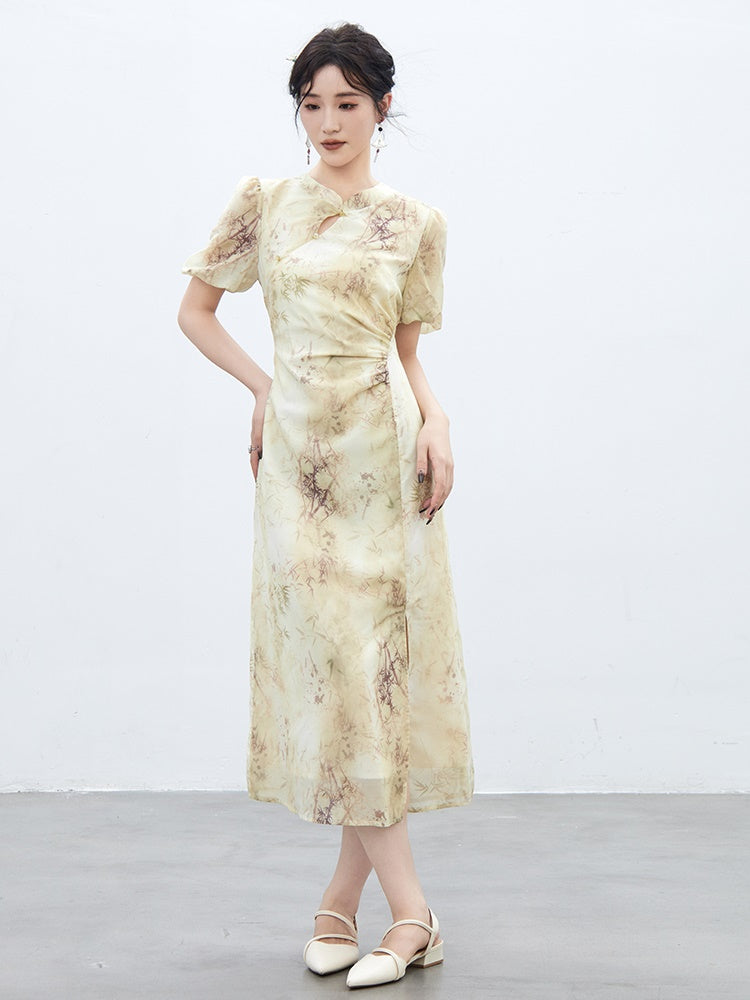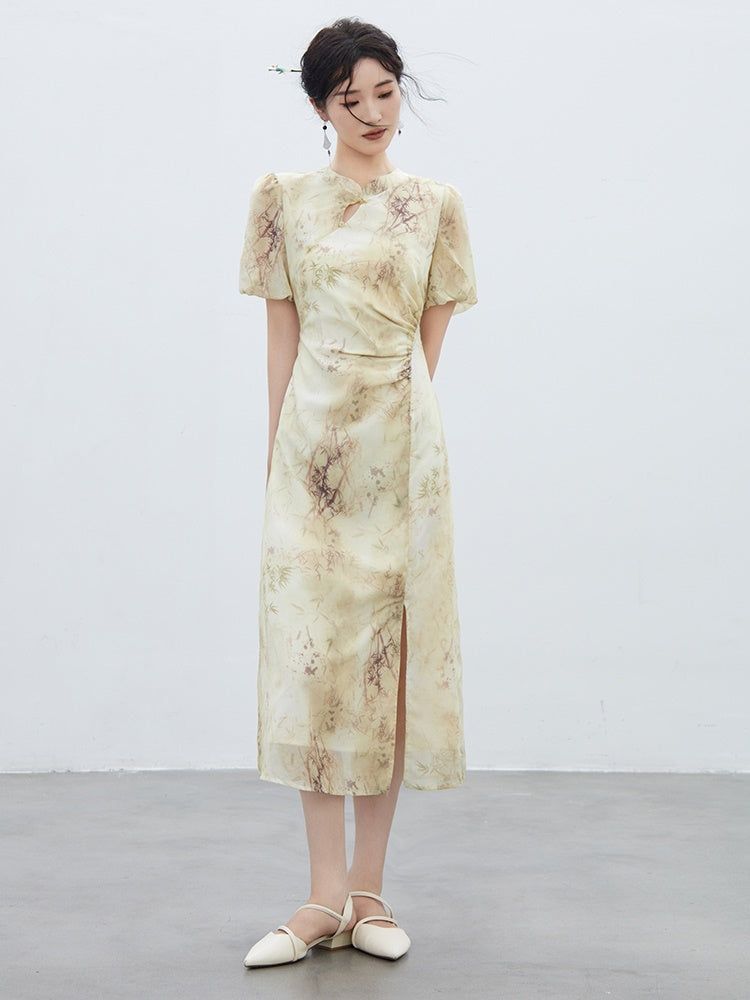 China-Dress Slit Retro Water-Color Slim One-Piece