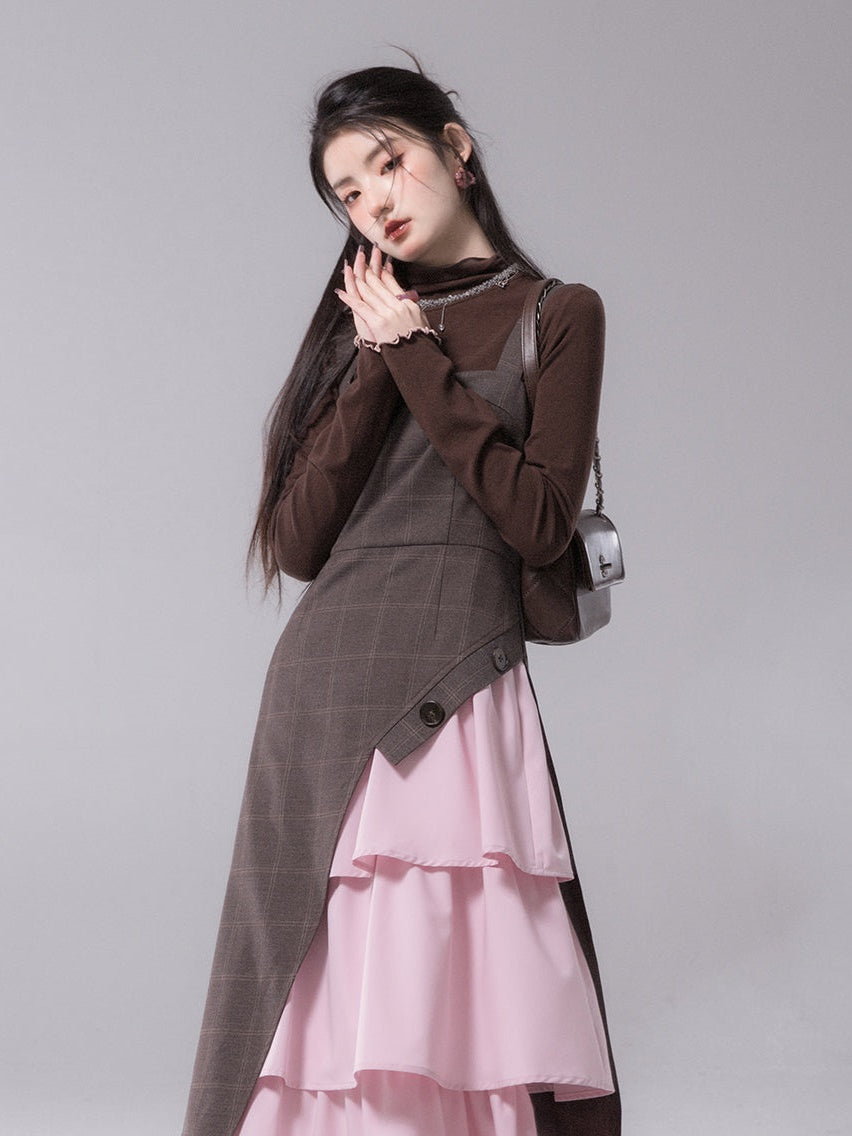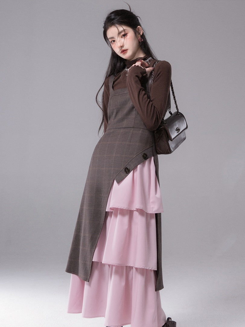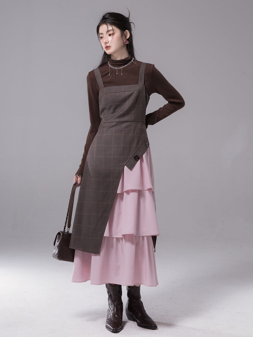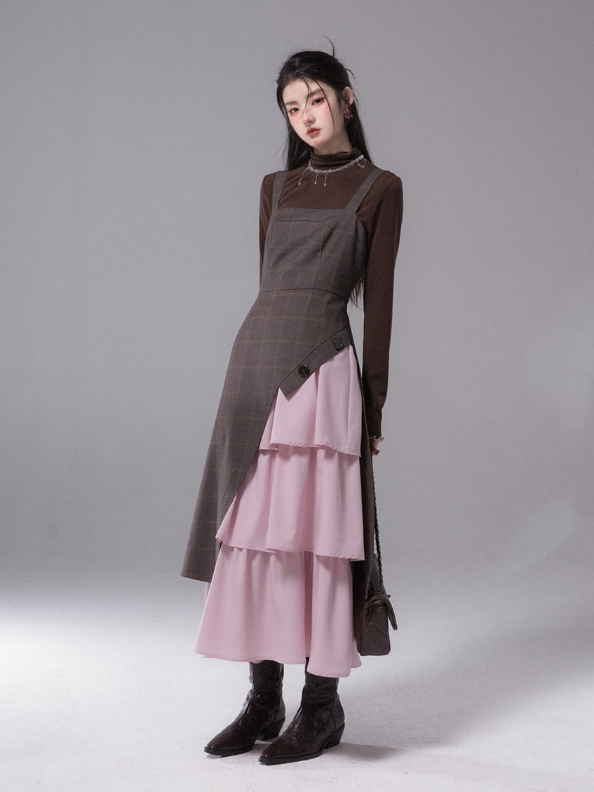 Contrast Color Suspender Dress & Neckline Shirting Bottom Shirt Set-up
