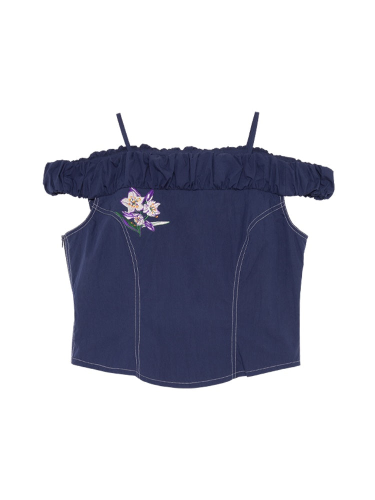 Denim Embroidery Off-Shoulder Pleats Tops&Flare-Slirt