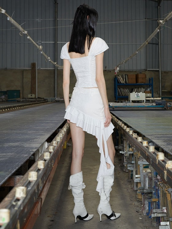 Floral French Sleeve Zip-up Top & Frill Stitch Skirt