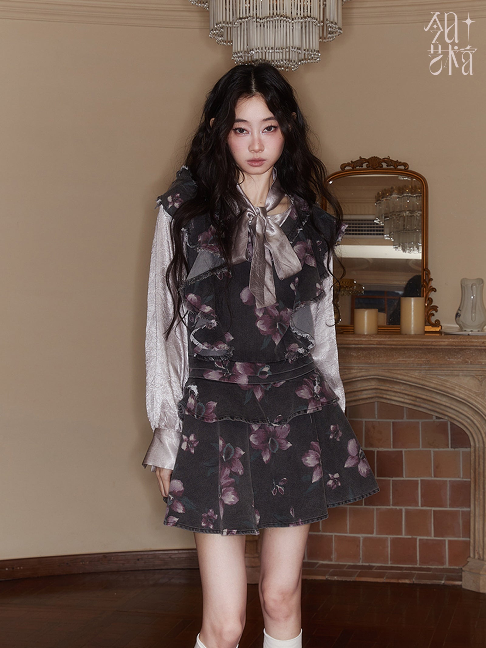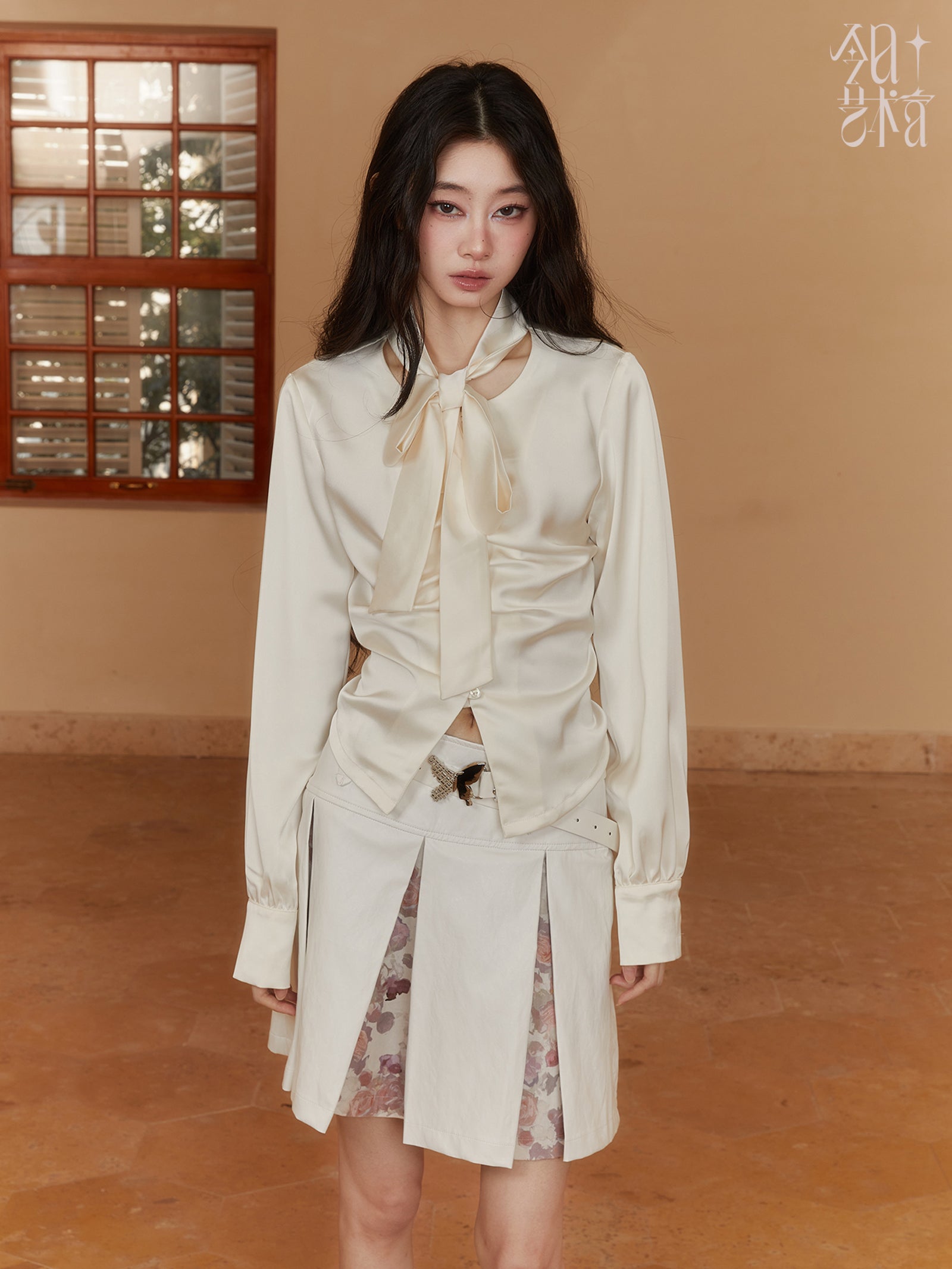 Glossy Ribbon Elegant Gather Embroidery Blouse