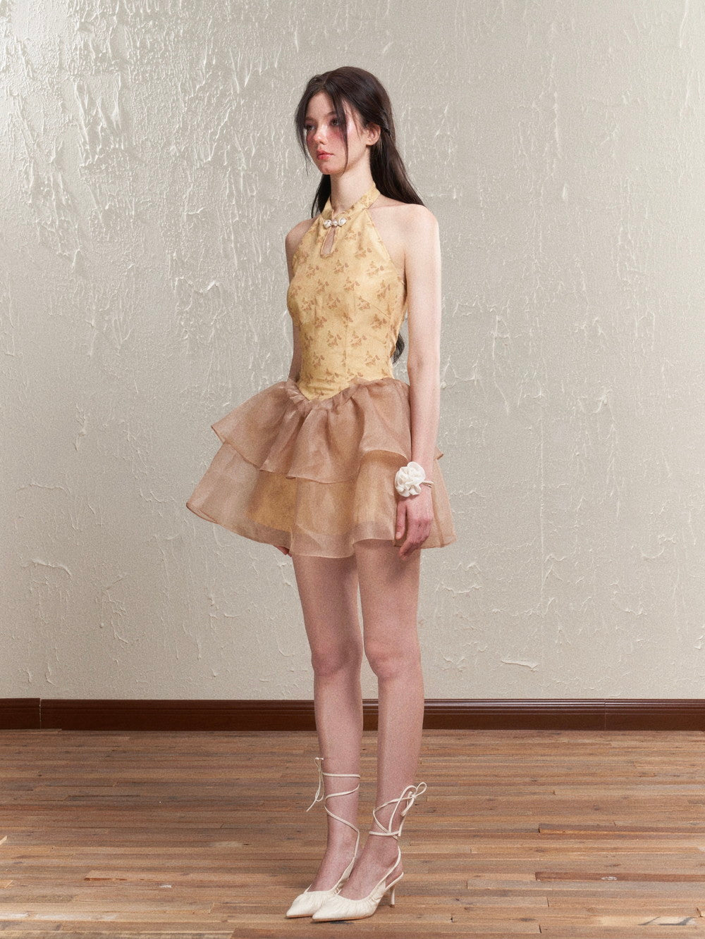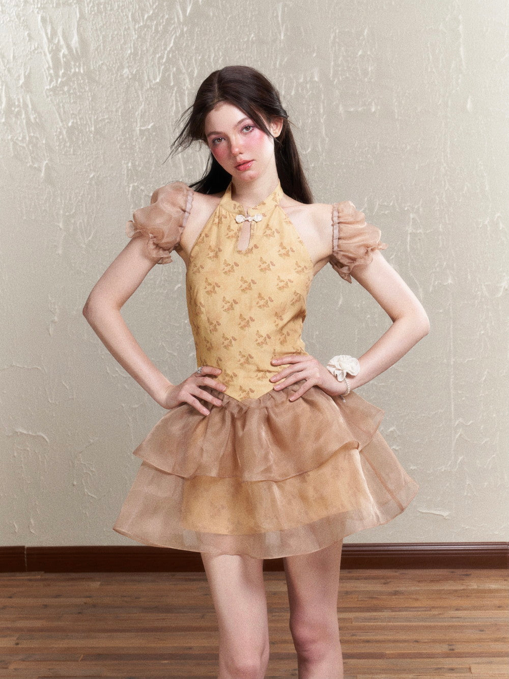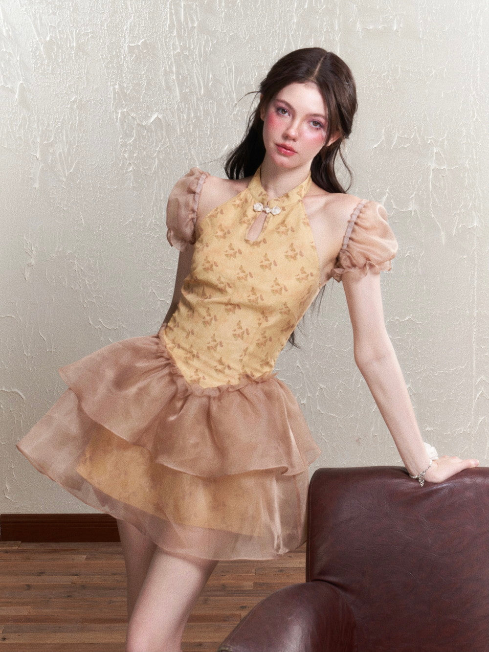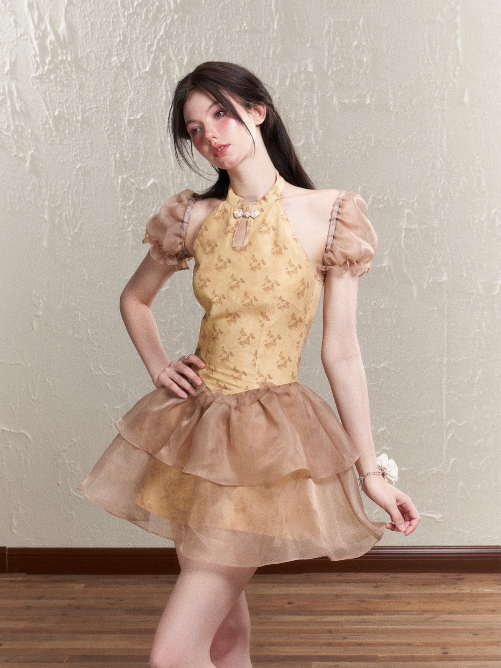Halter-Neck Ciffon Fluffiy Tight Puff-Sleeve One-Piece & Bracelet