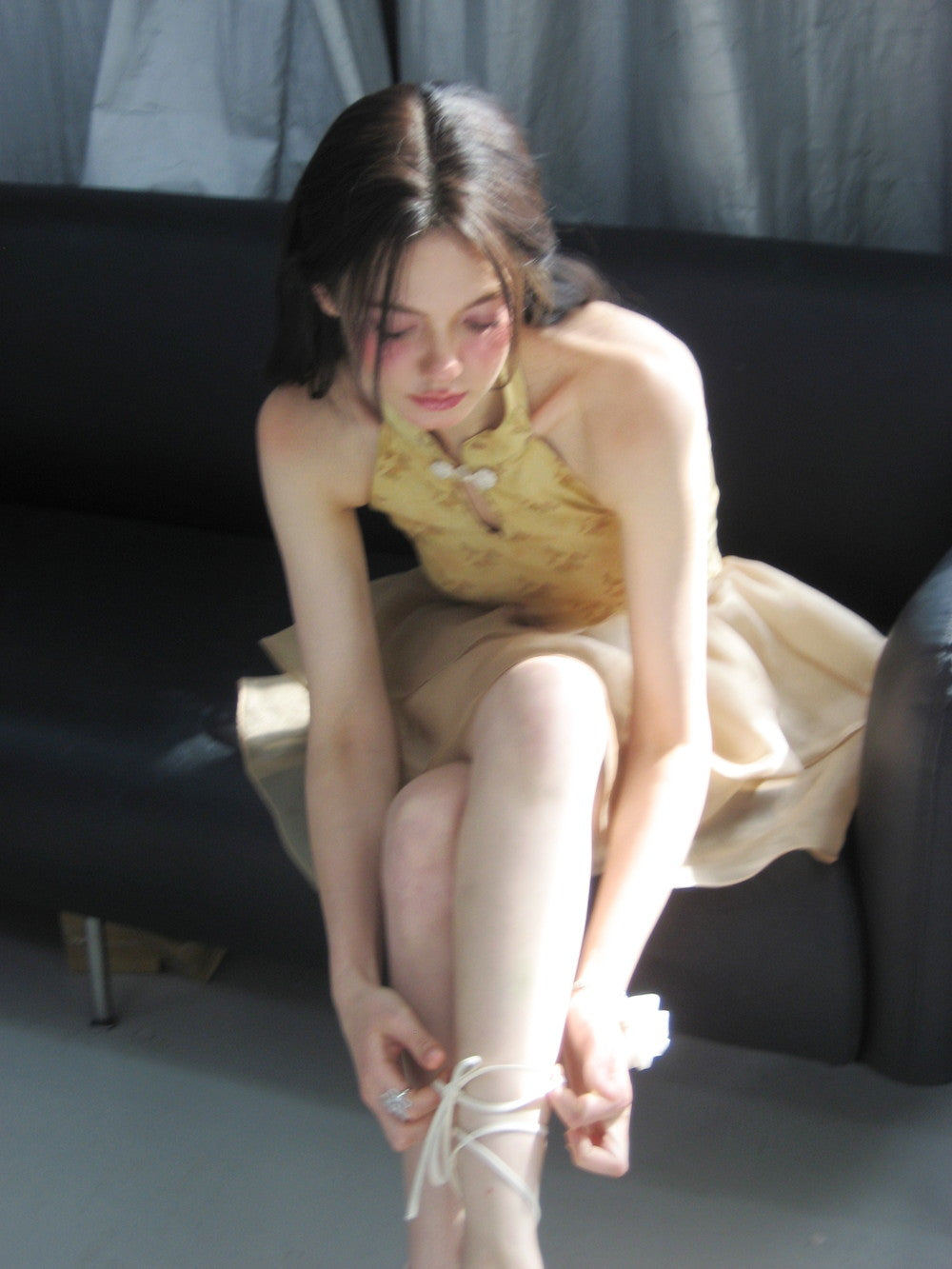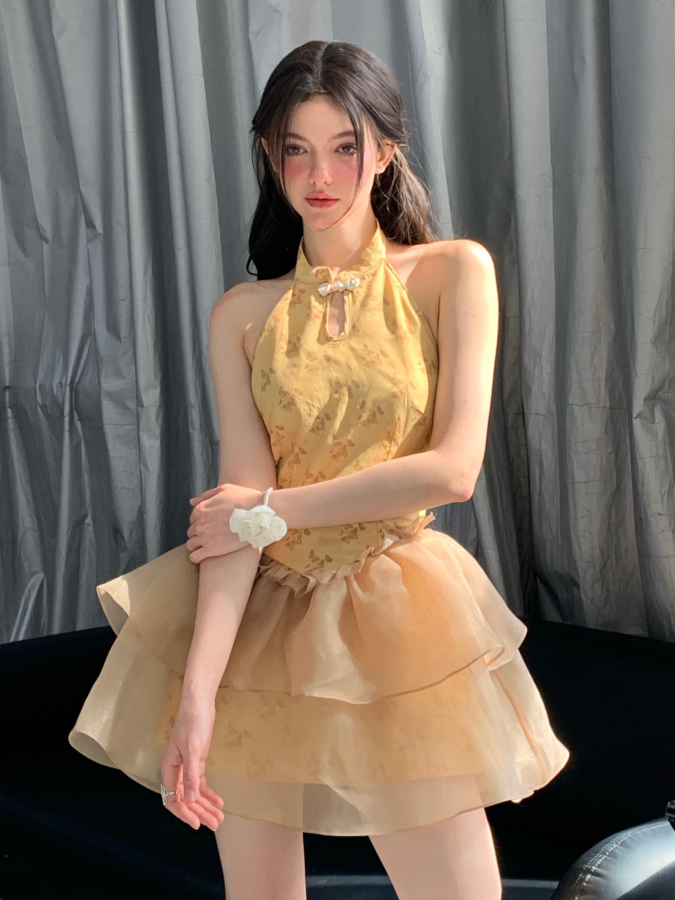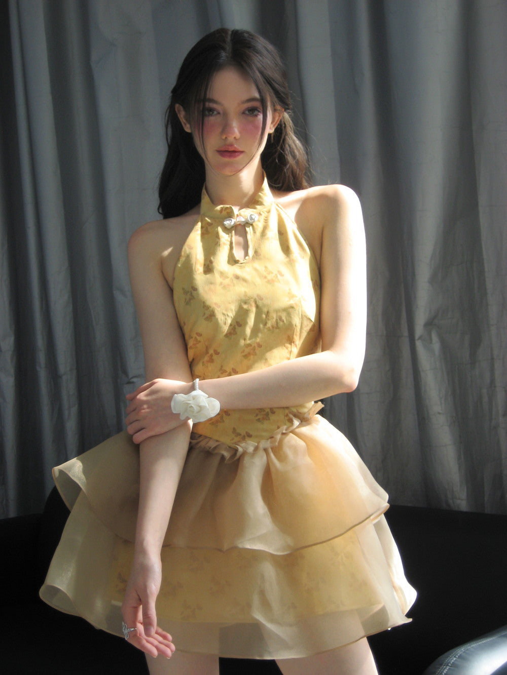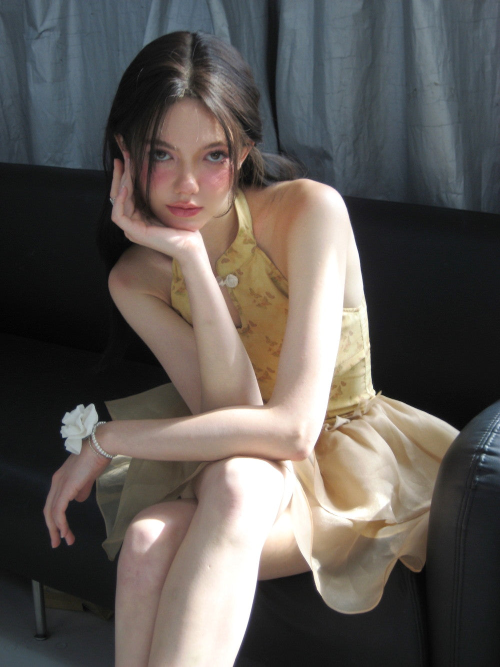 Halter-Neck Ciffon Fluffiy Tight Puff-Sleeve One-Piece & Bracelet