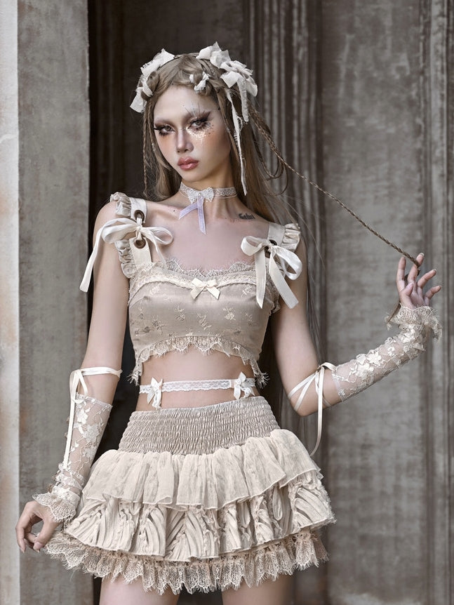 Lace Ribbon Sheer Lace-Up Flower Arm-Cover Glove