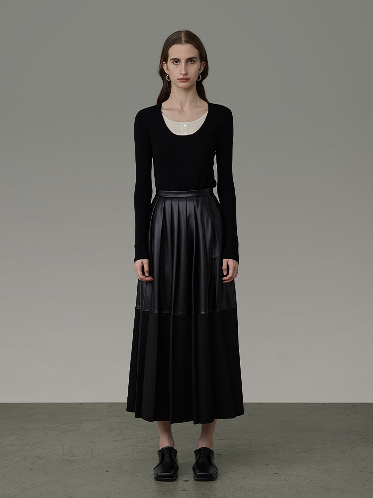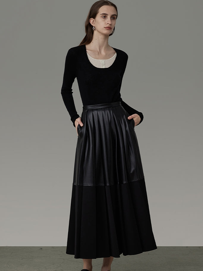 Leather Mix Long Tiered Flare-Skirt