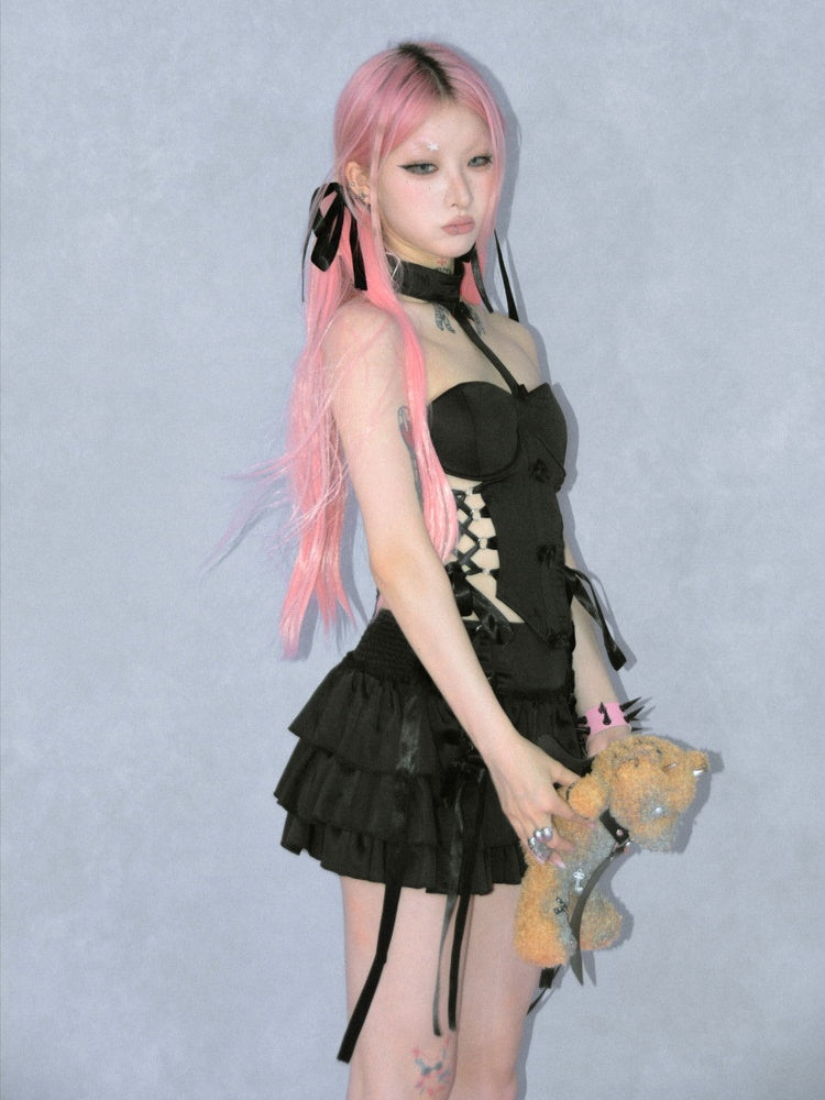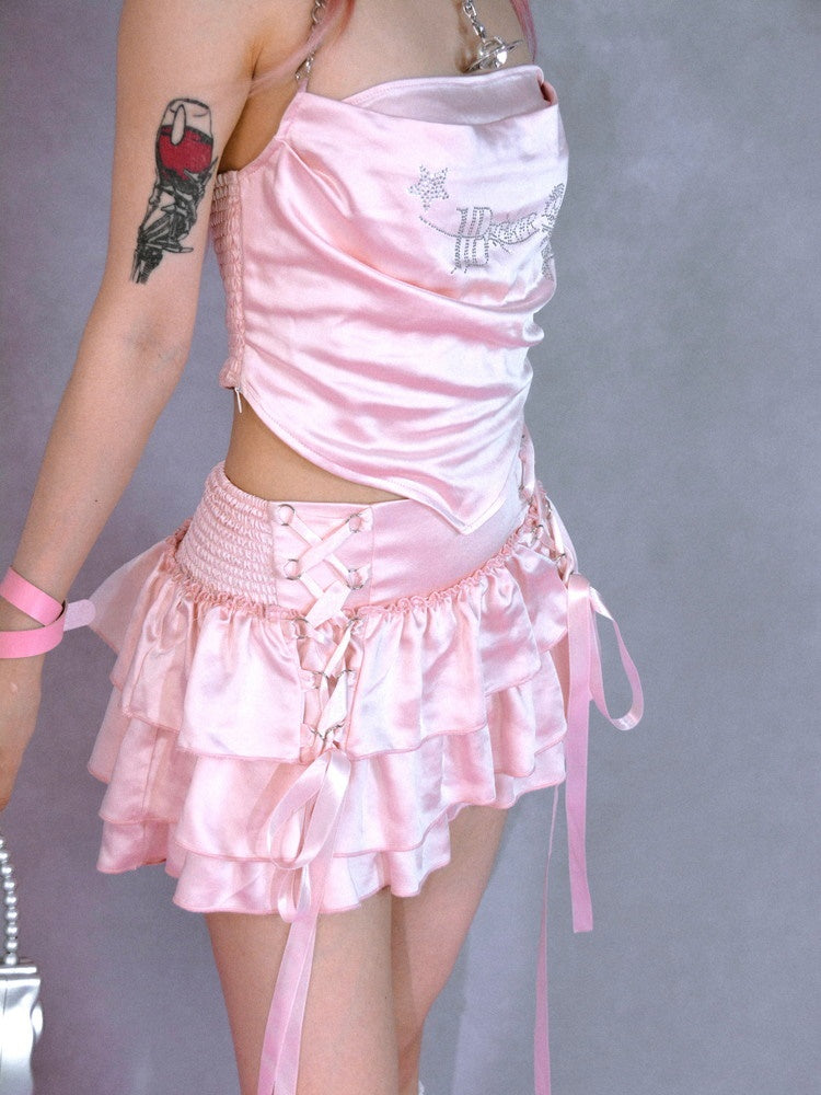Nichi Glossy Halter-Neck Lace-Up Sexy Tops