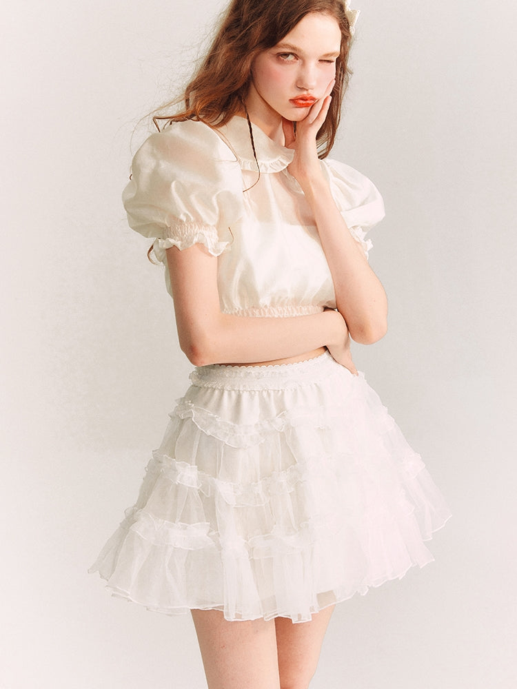 Puff-Sleeve Sheer Frill Girly Short Feminine Blouse