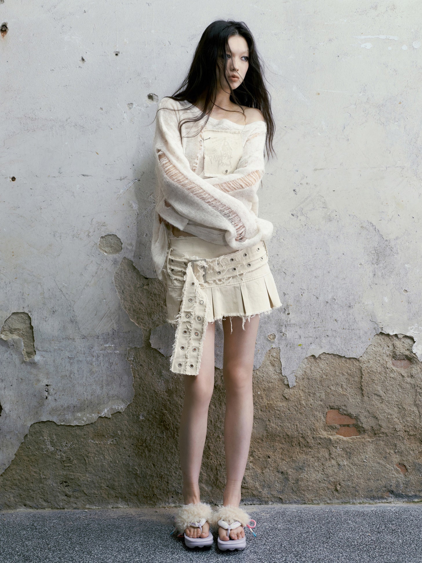 Raw Edge Denim Pleated Skirt
