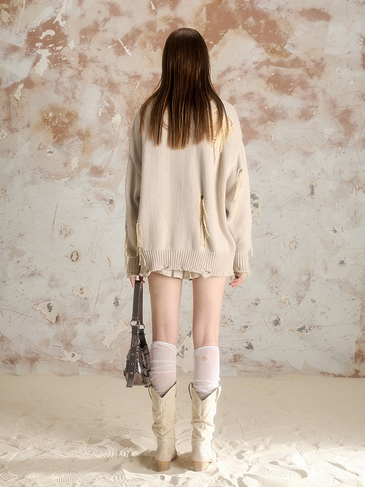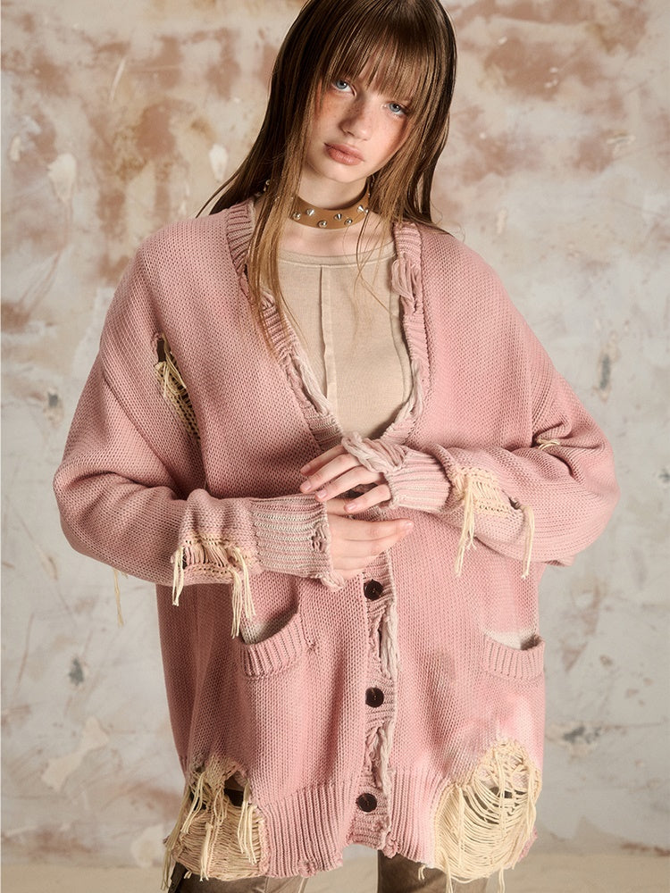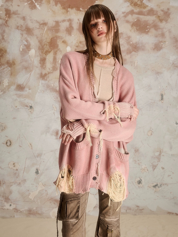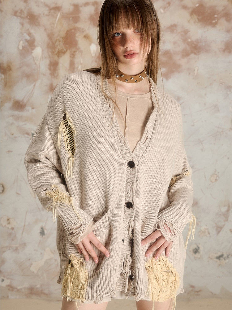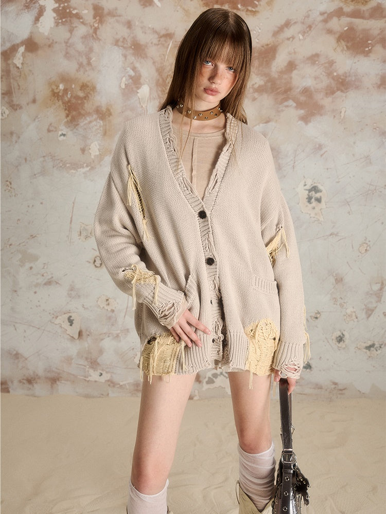 Ripped Long-sleeved V-neck Knitted Cardigan