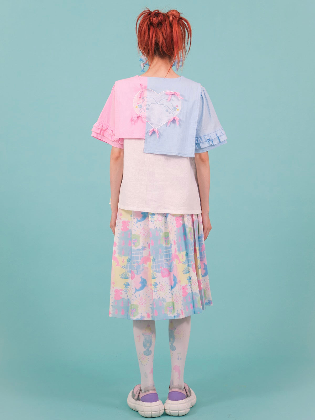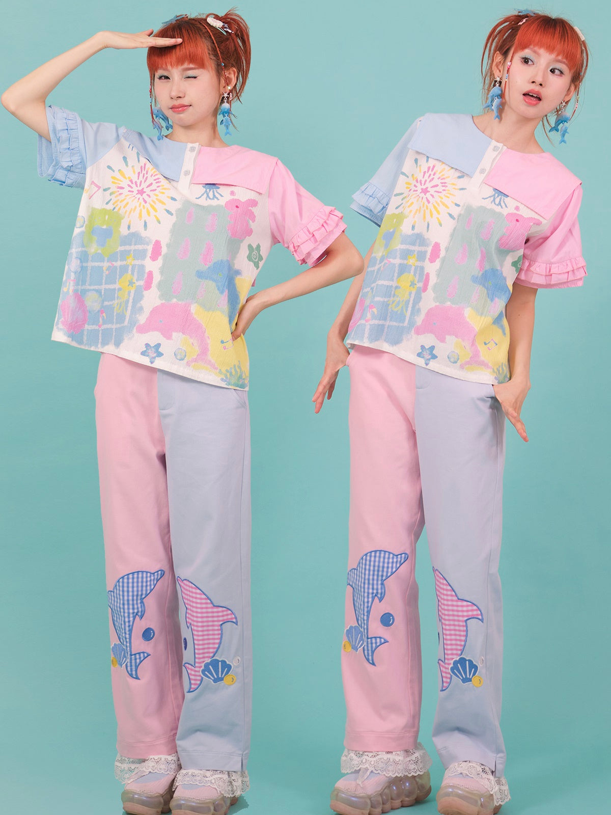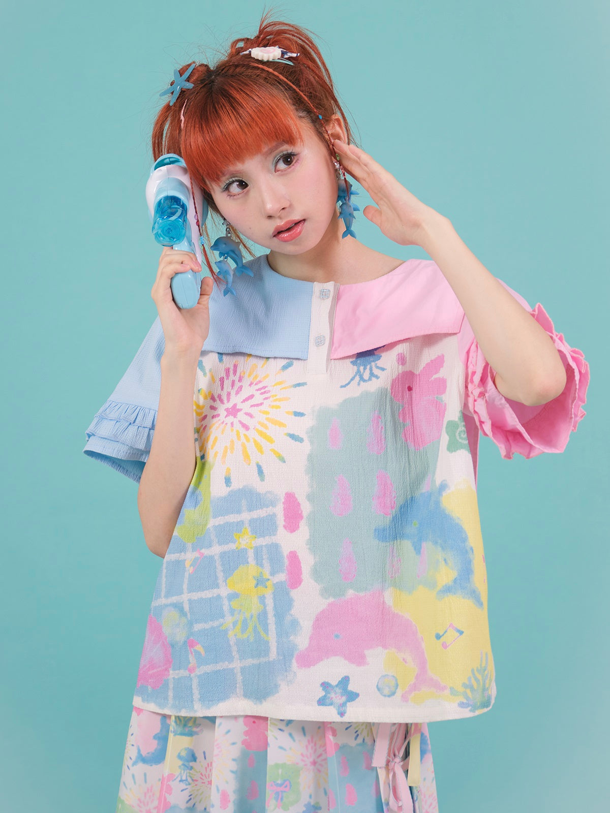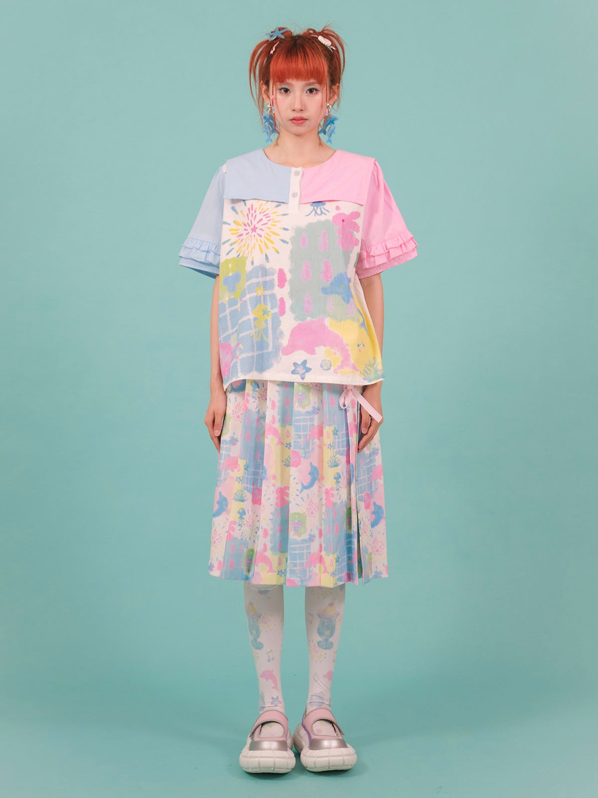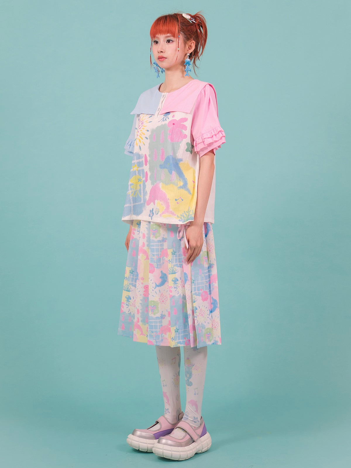 Stitching Navy Collar Print Embroidery Shirt