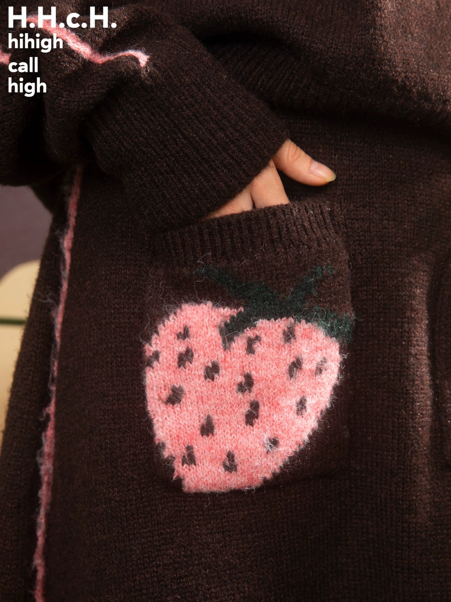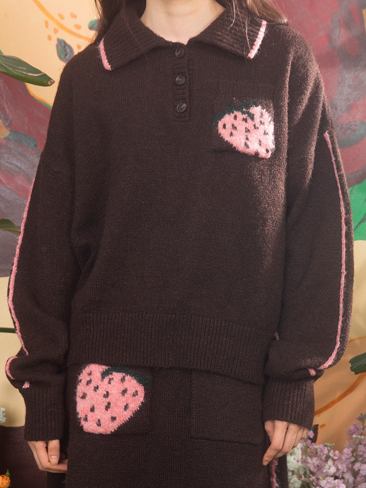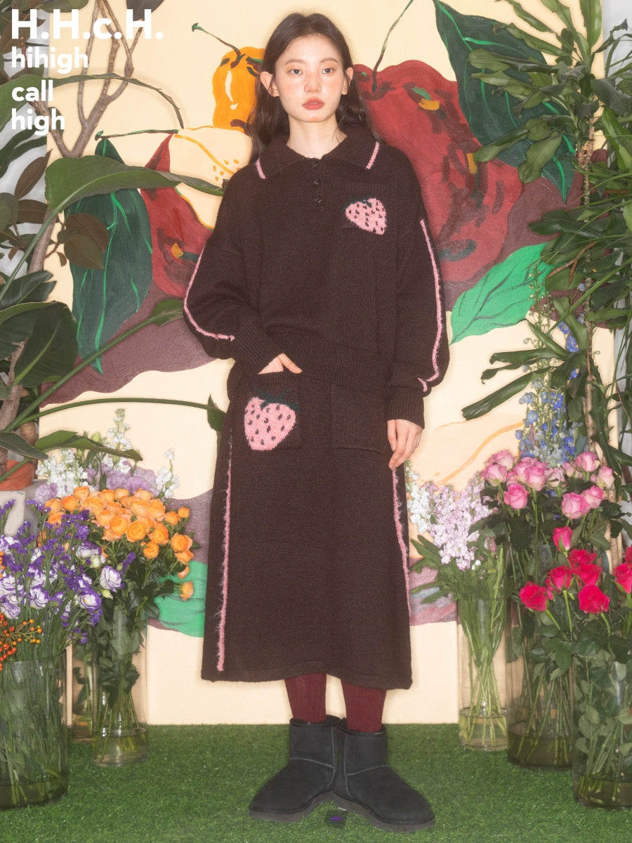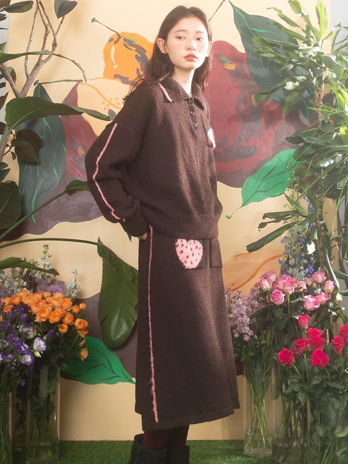 Strawberry Jacquard Half-open Collar Sweater & Mid-length Knitted Skirt