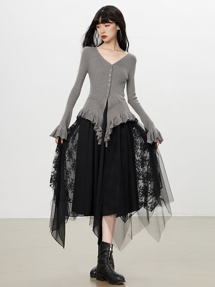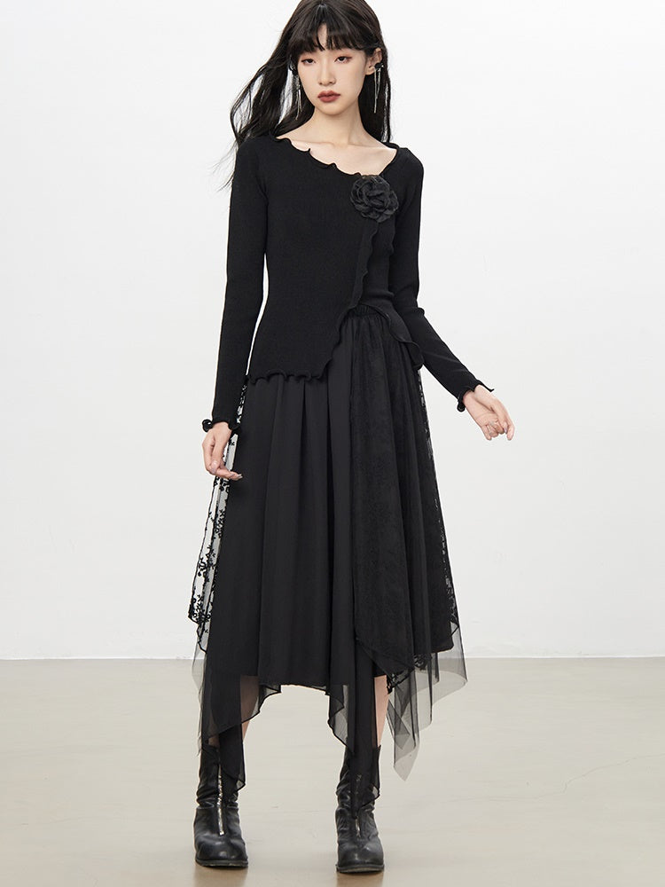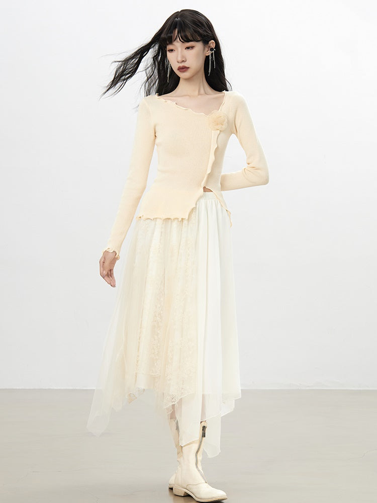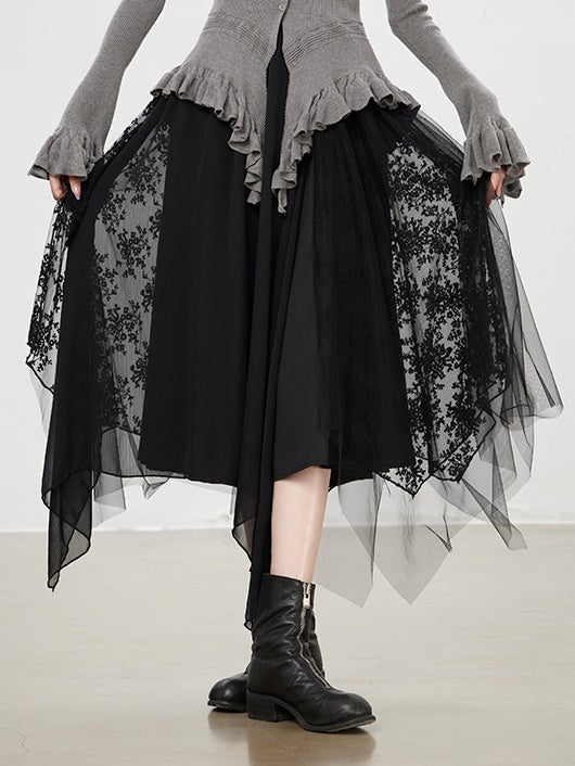 Tulle Ciffon Flower Lace Elegant Flare Long Hem-Skirt