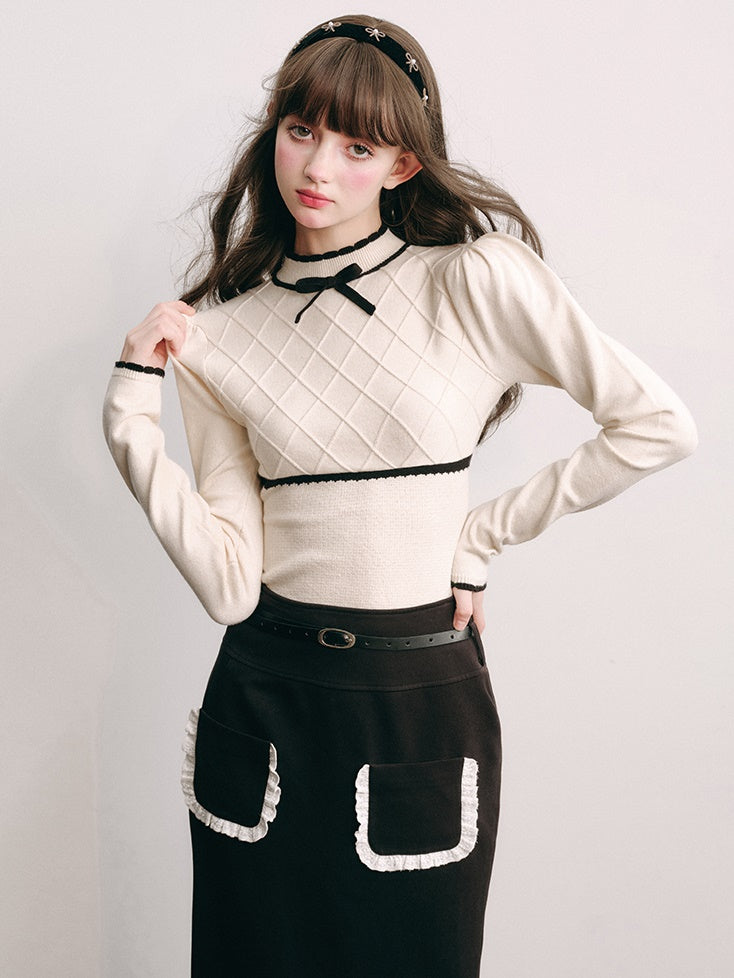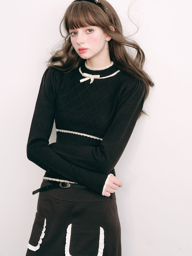 Bottle-neck Puff Sleeve Knitted Top