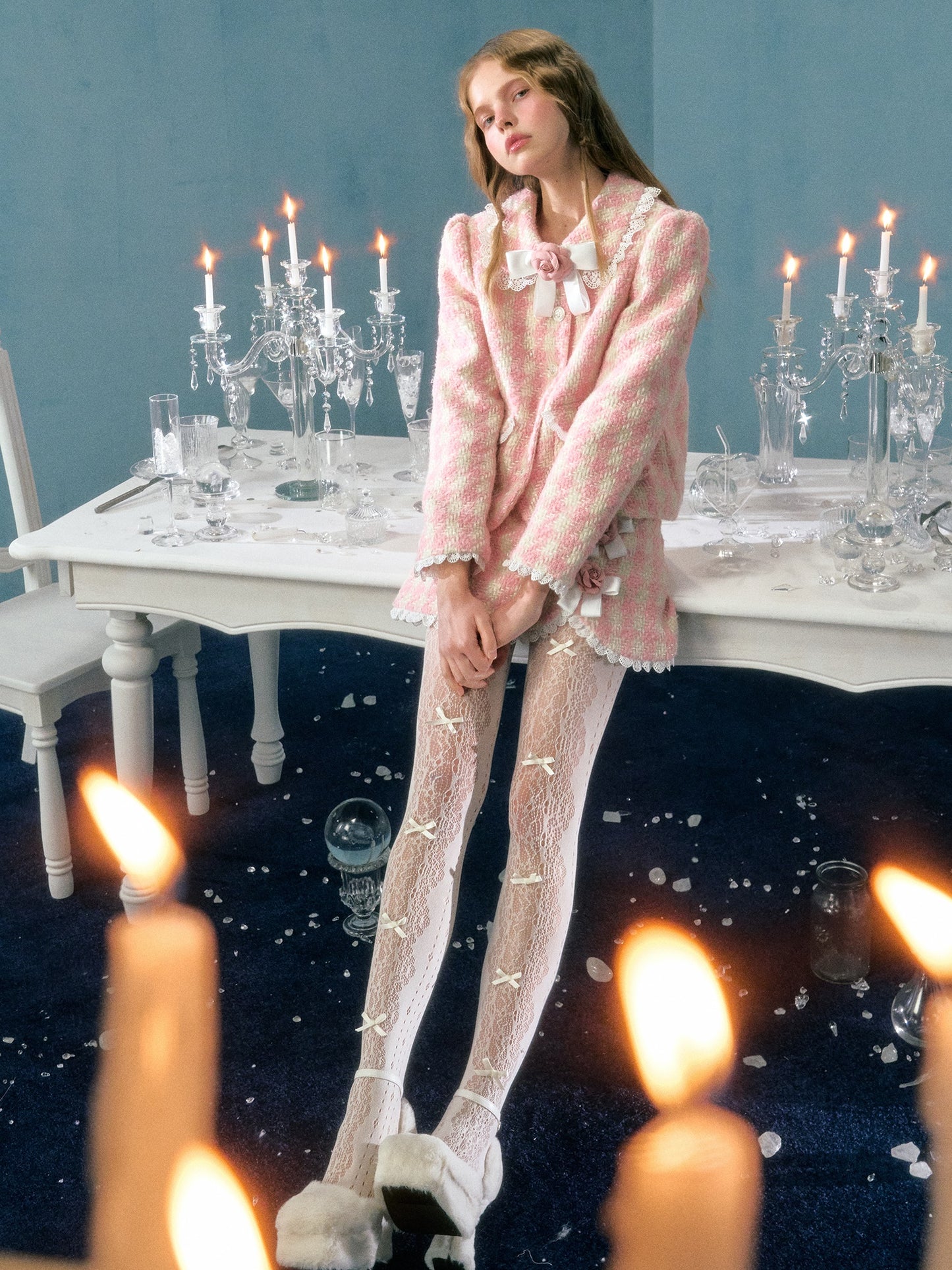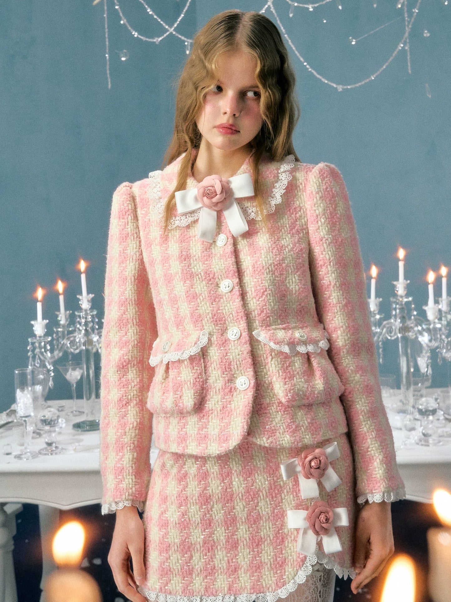 Plaid Bow Flower Brooch Lace Padded Short Jacket & Skirt