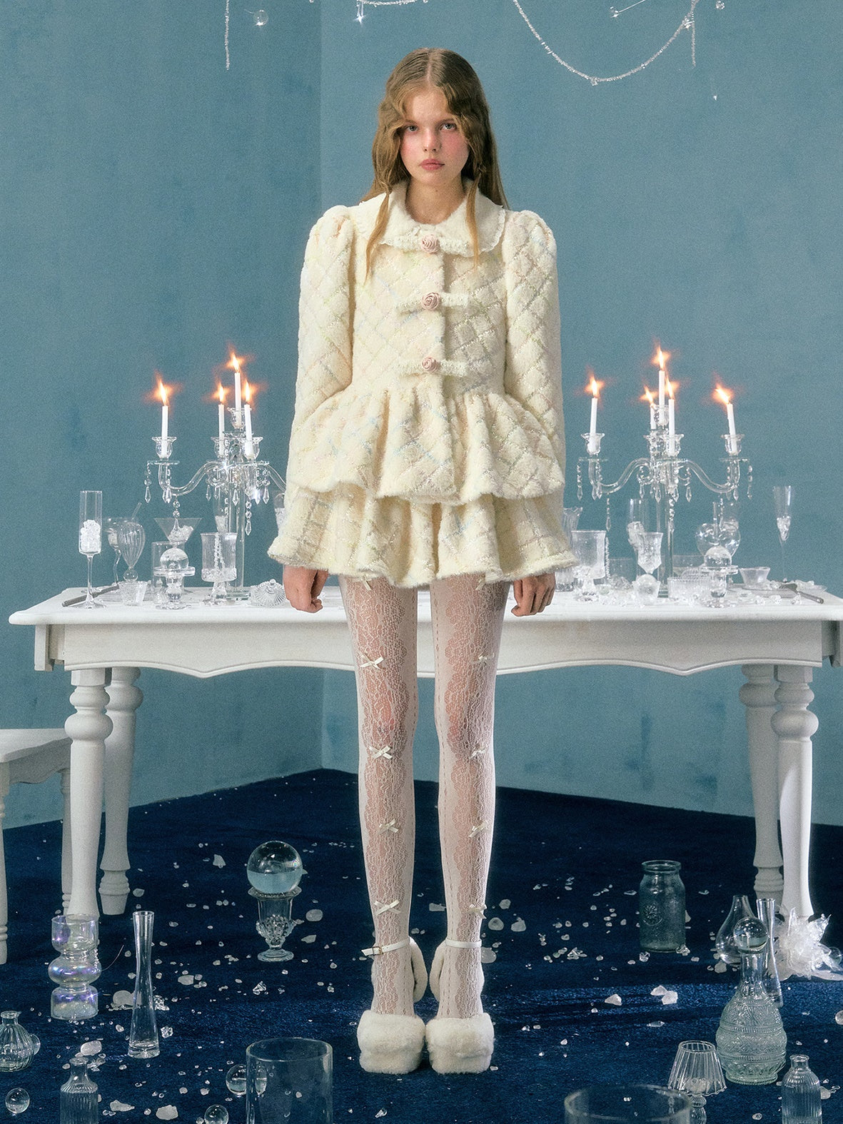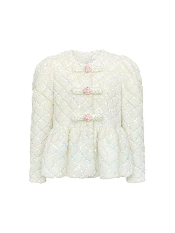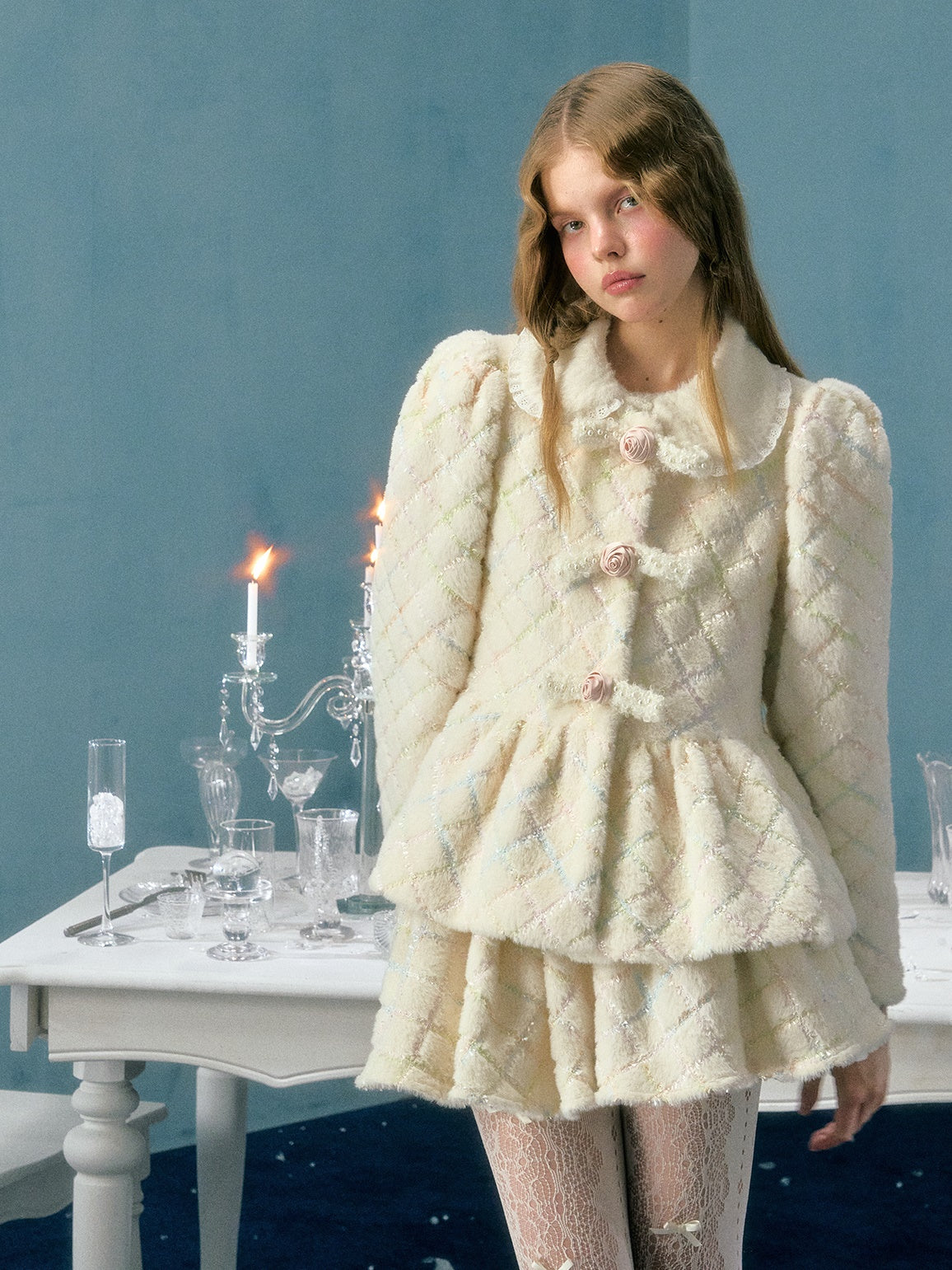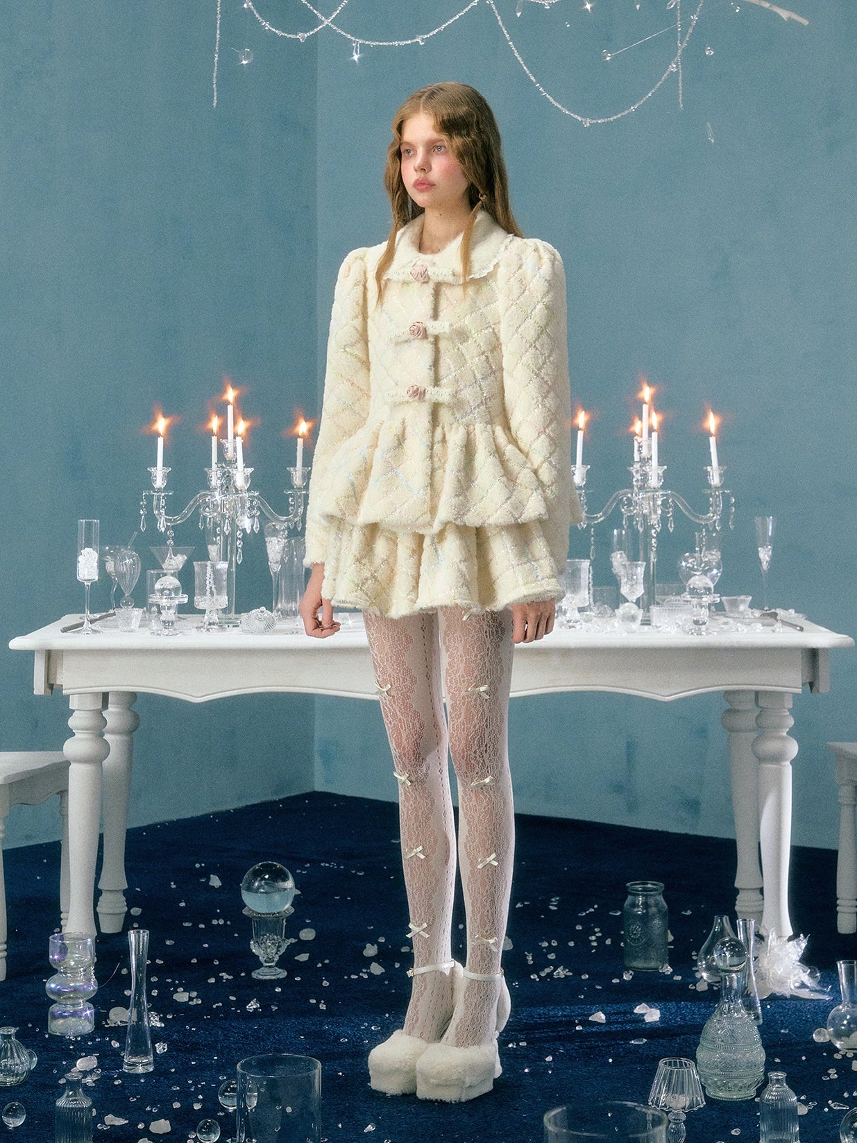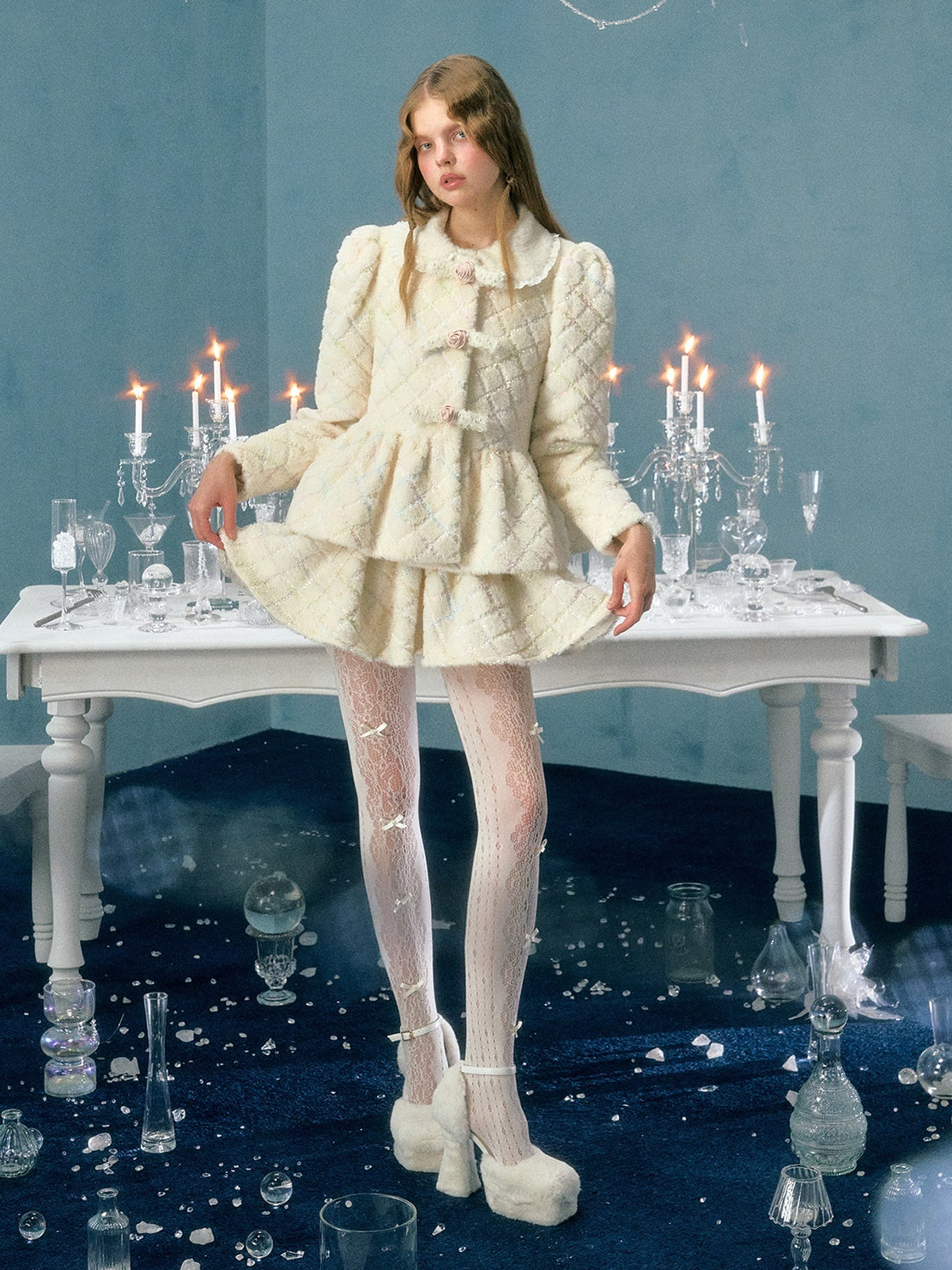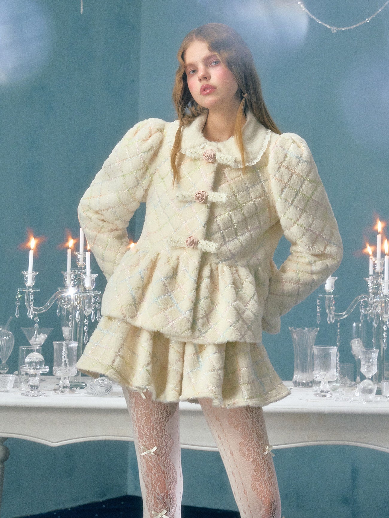 Rose Accent Rhombus Collarless Puff Sleeve Short Coat & Flare Skirt