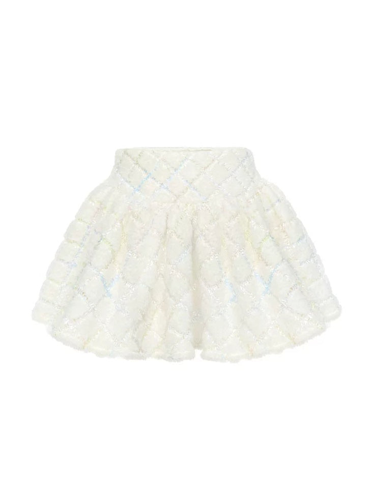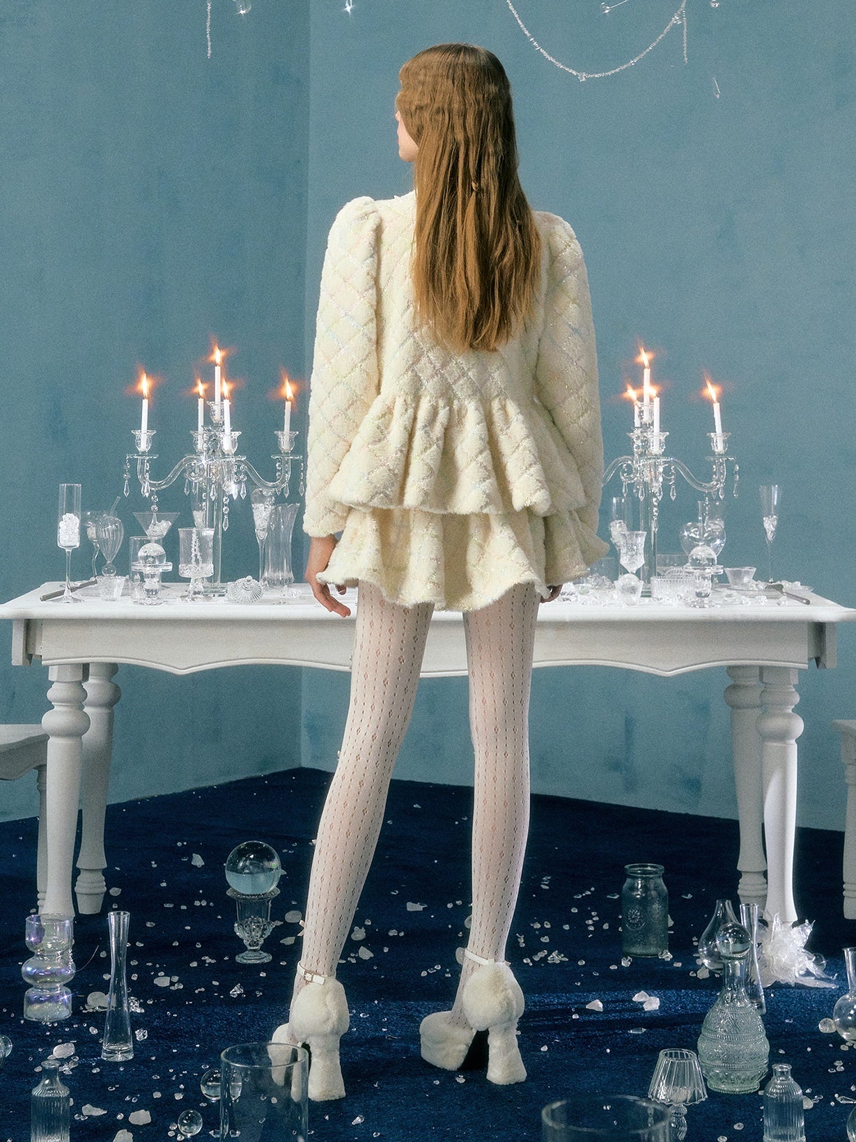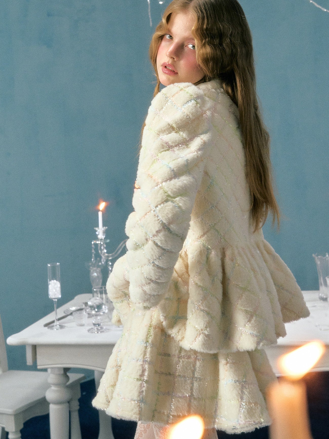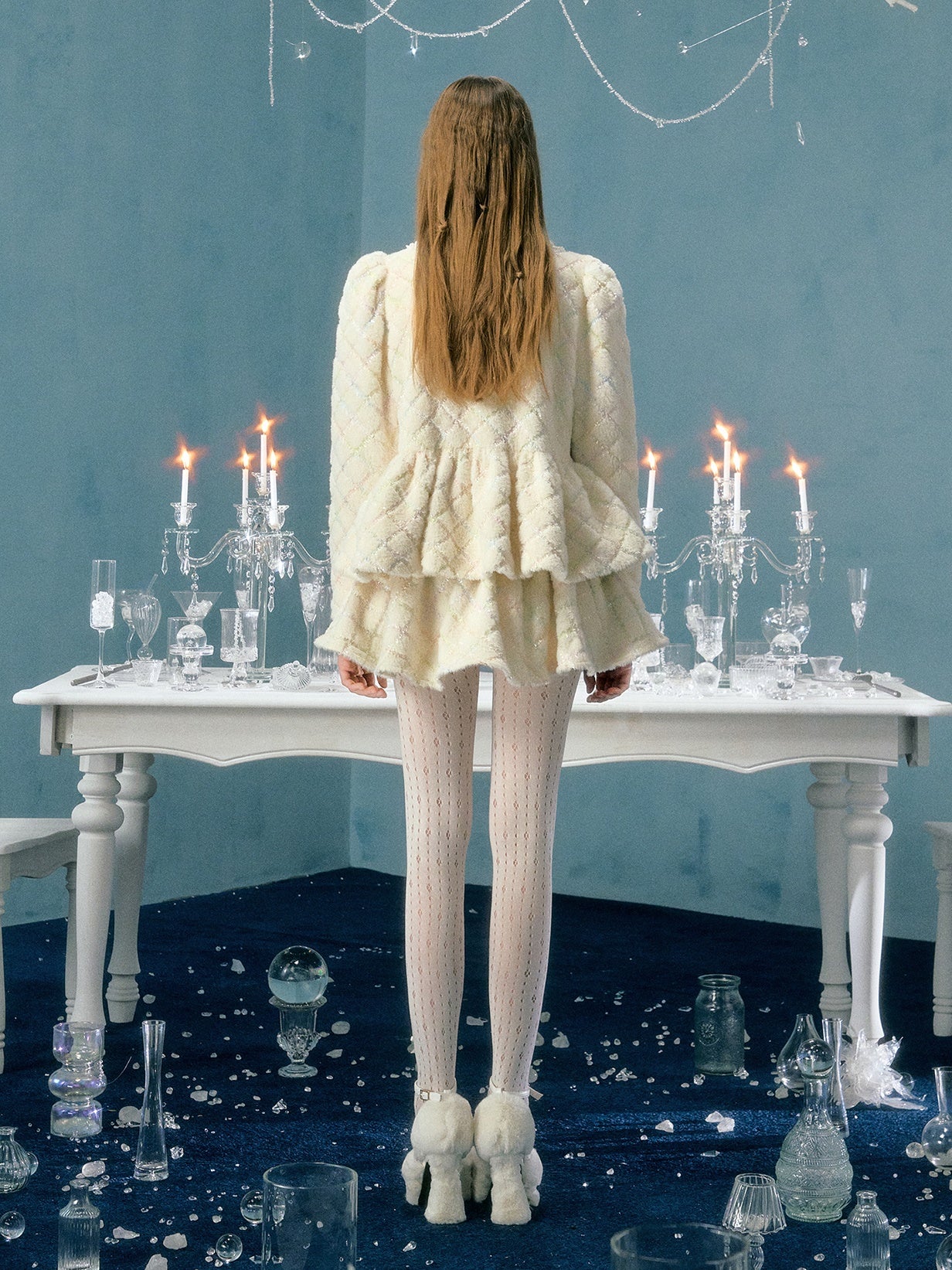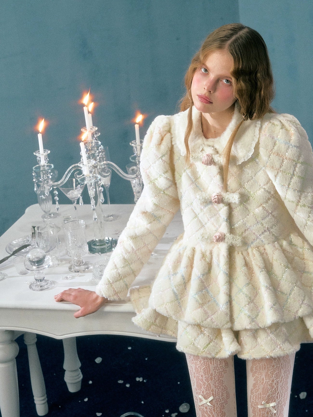 Rose Accent Rhombus Collarless Puff Sleeve Short Coat & Flare Skirt