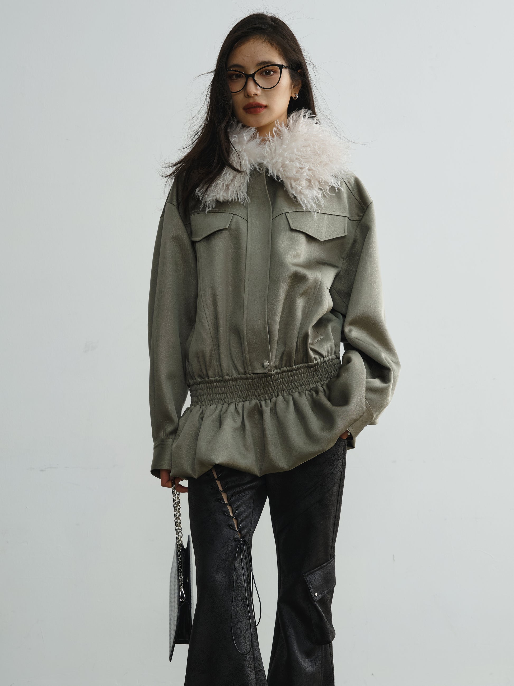 Ruffle Hem Gloss Quilted Fur Collar Jacket