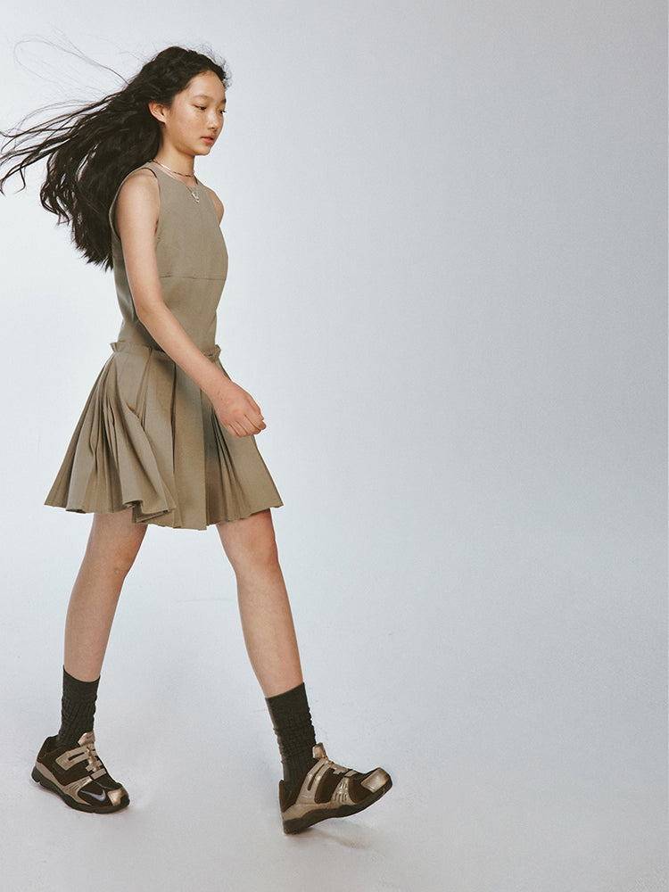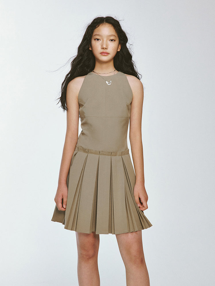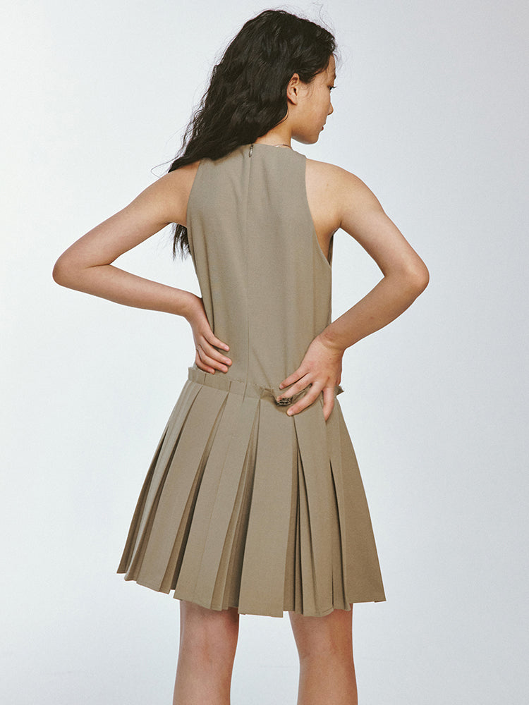 American-Sleeve Box-Pleats Short Plain One-Piece