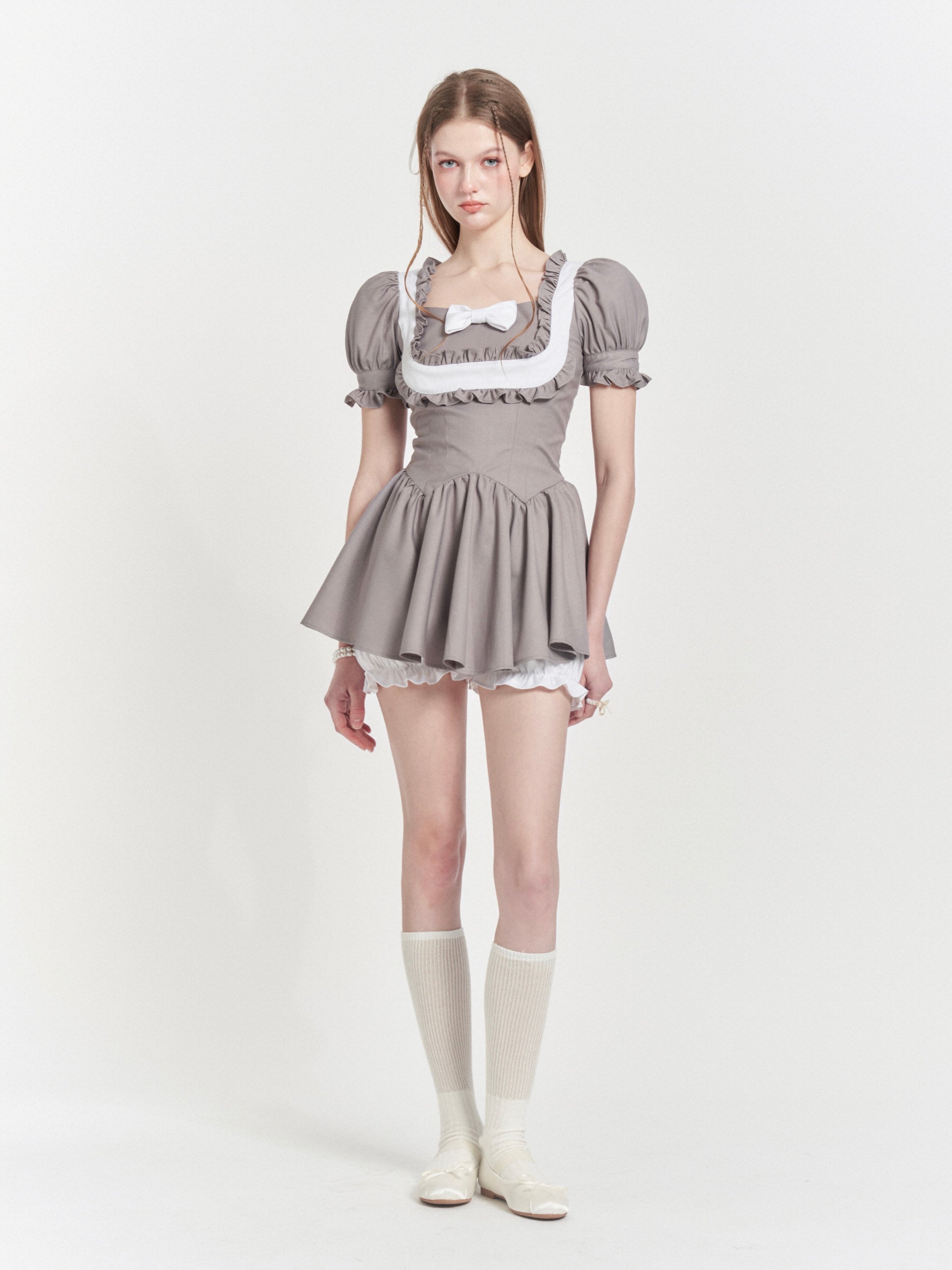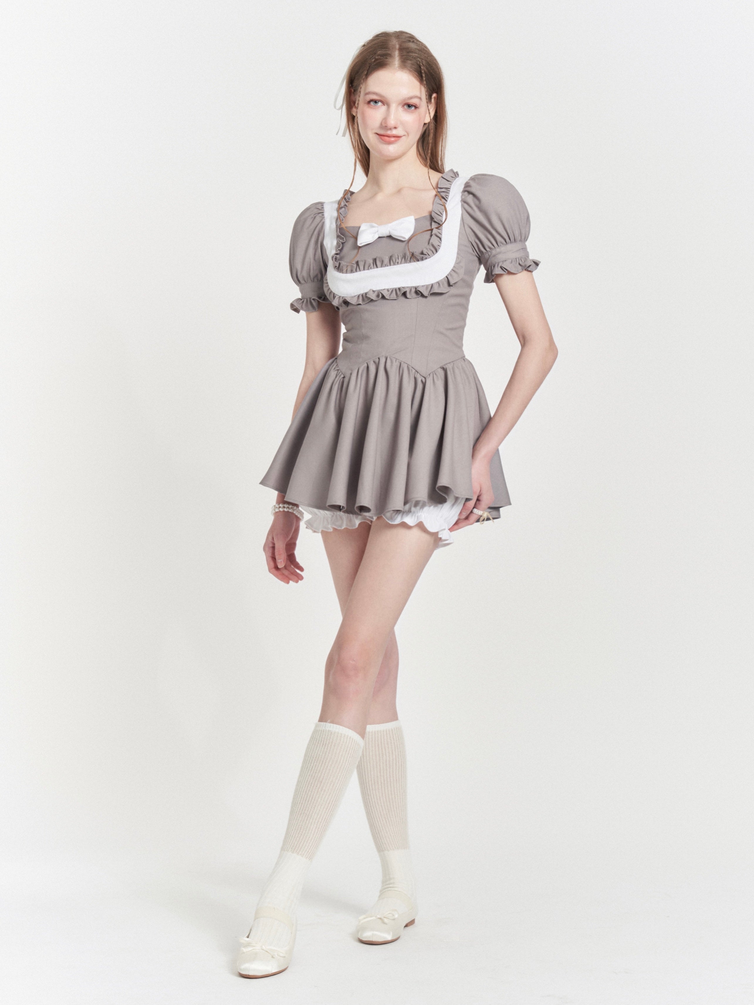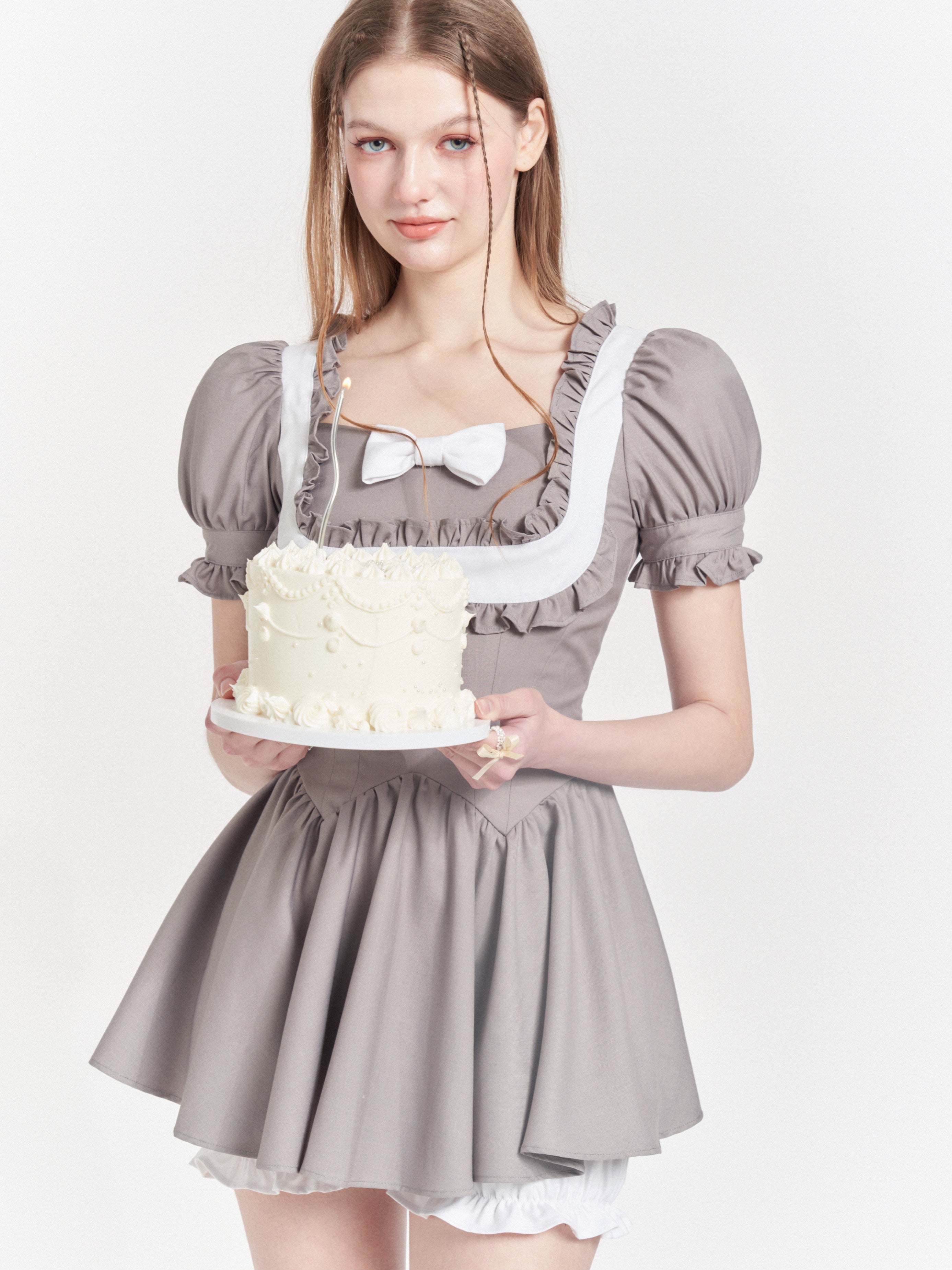 BOW PLEATED LACE SQUARE COLLAR FAKE TWO PIECE Dress