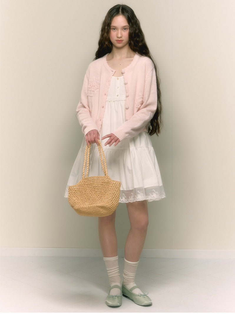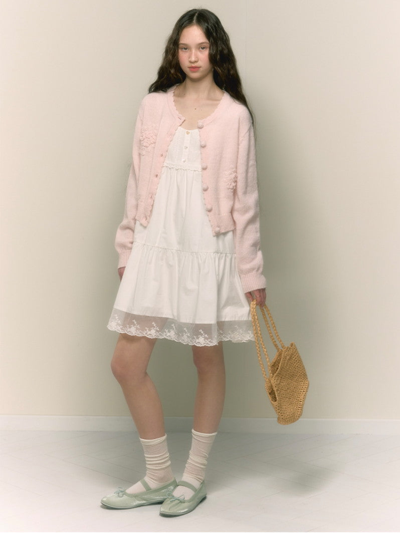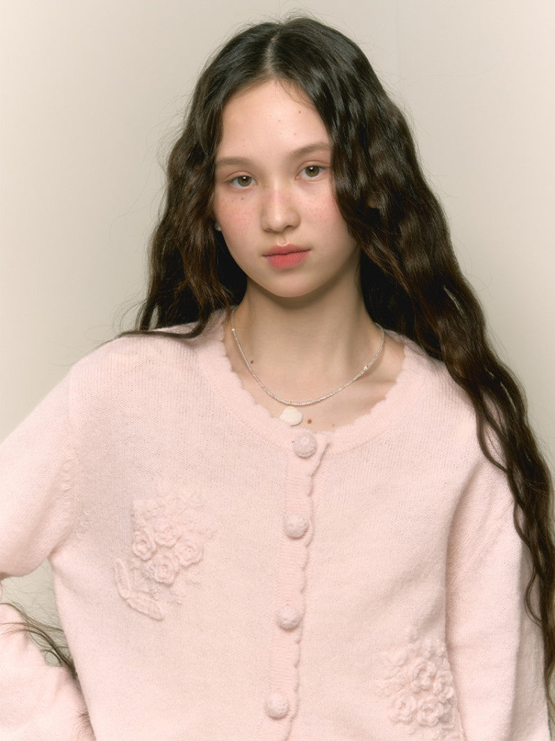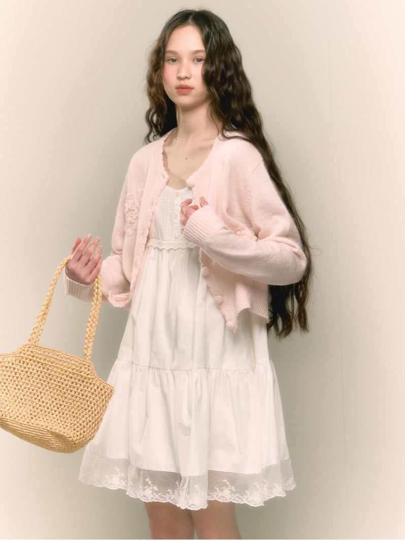 Crew-Neck Feminine Embroidery Pale Flower Cardigan