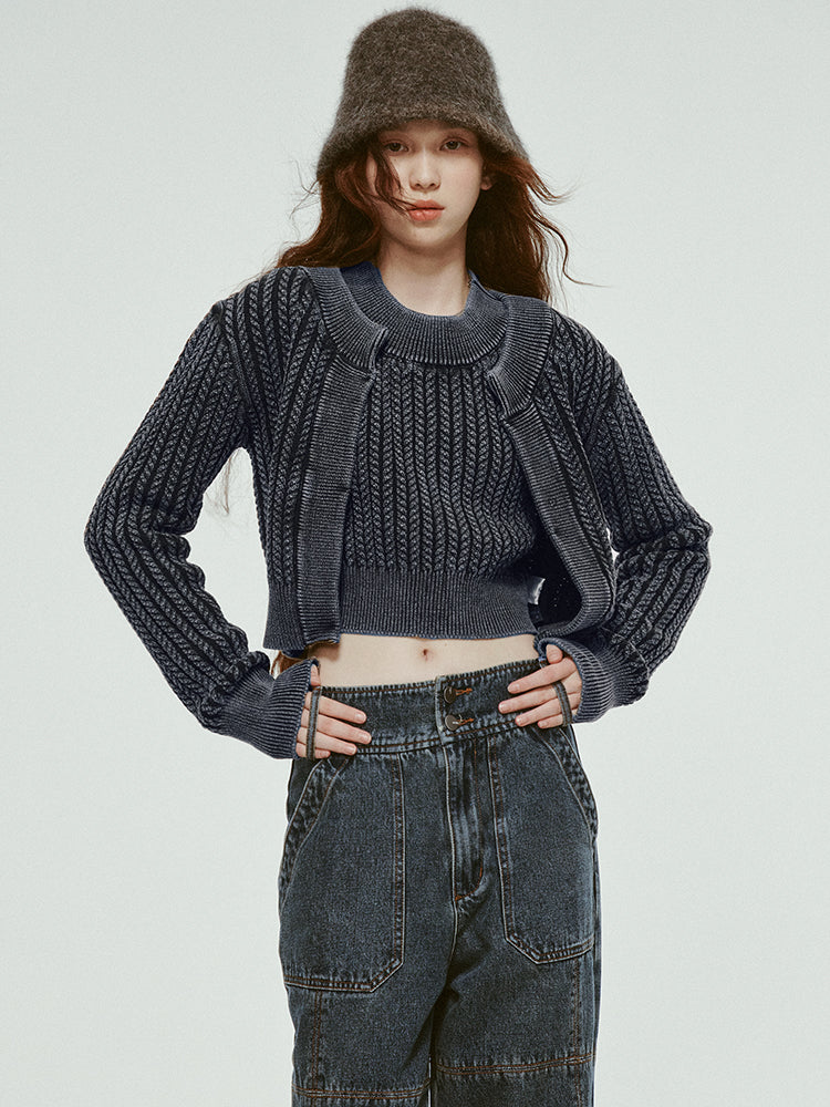 Denim-Blue Short Cable-Knit Retro Round-Neck Cardigan