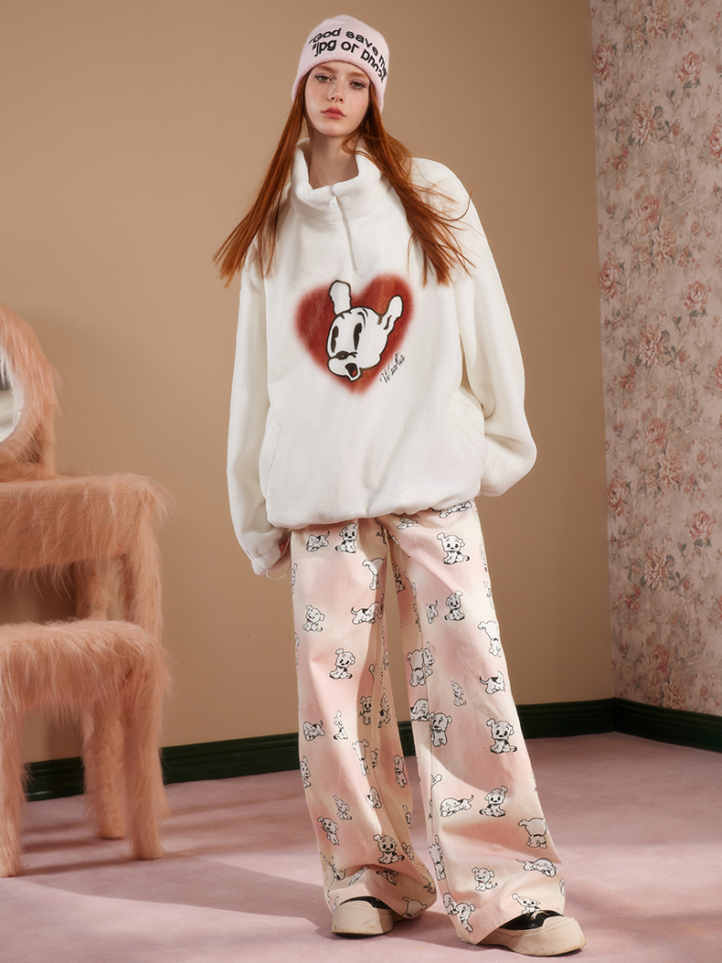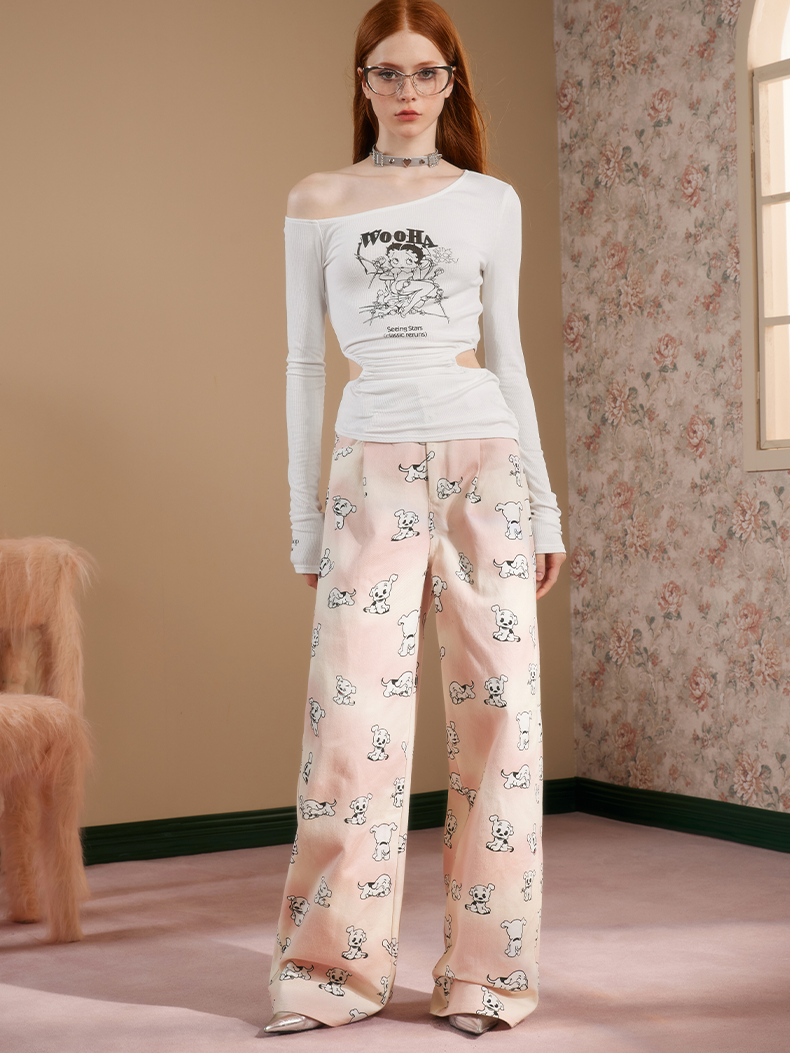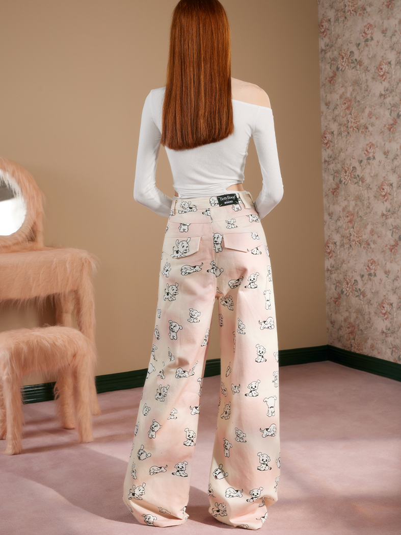 Dog Animal Wide-Leg High-Waist Girly Pants