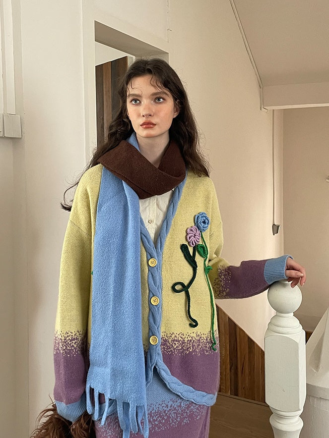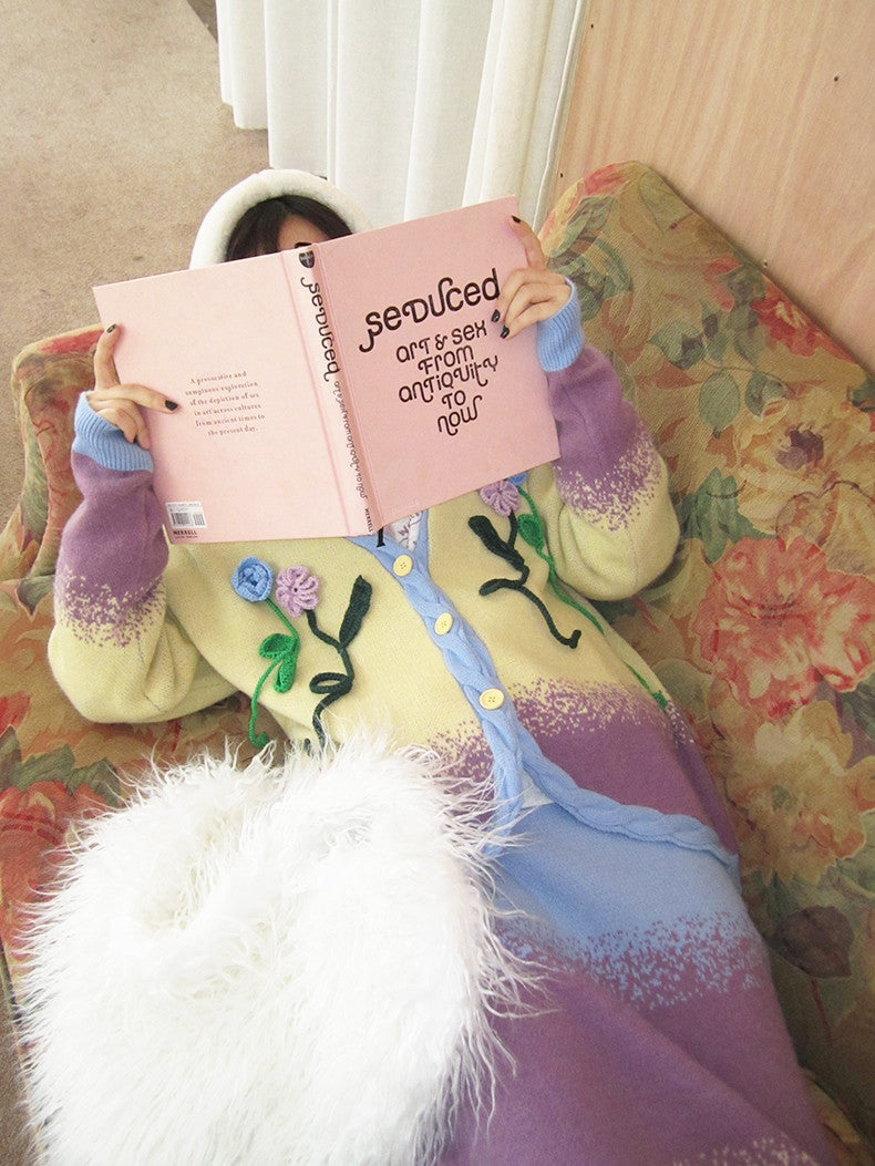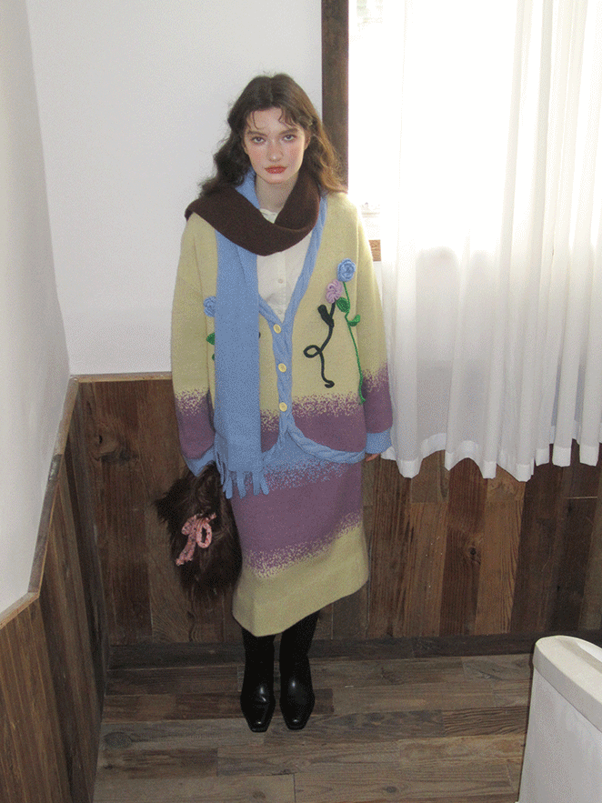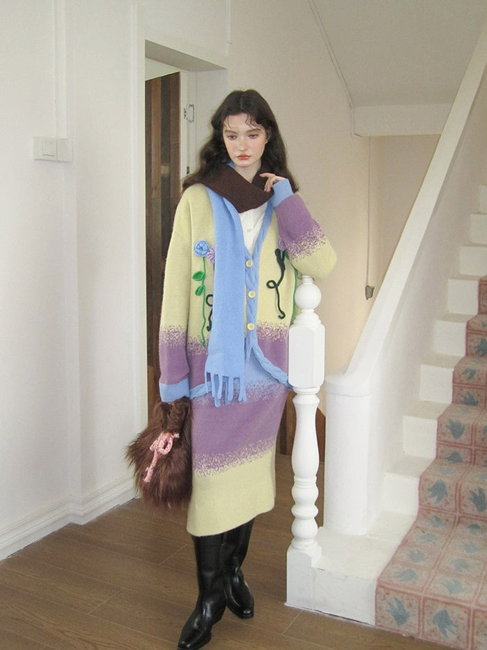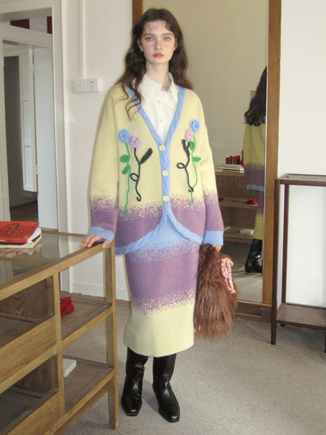 Embroidery Flower-Motif Vintage Retro Gradation Cardigan&Long-Skirt