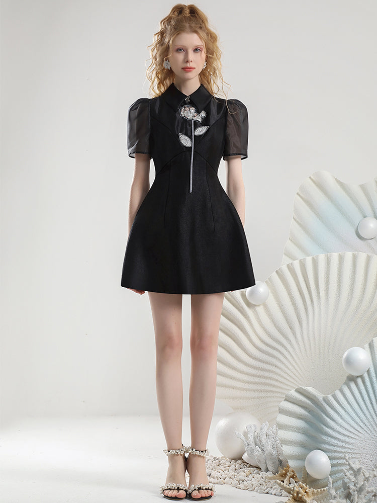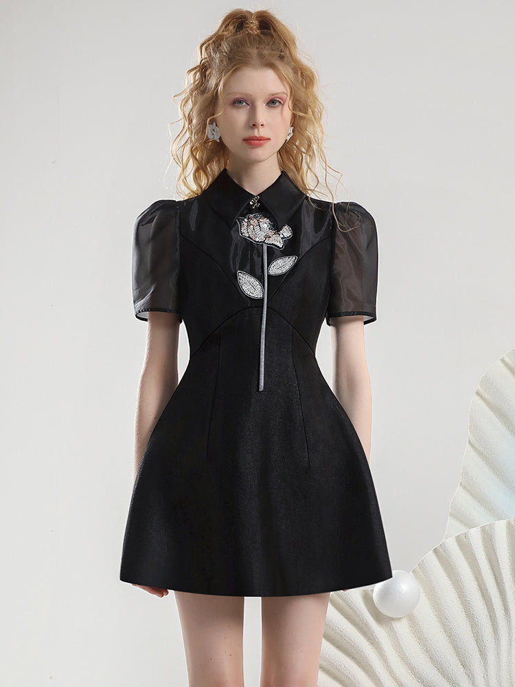 Embroidery Flwoer Flare Sheer-Sleeve One-Piece