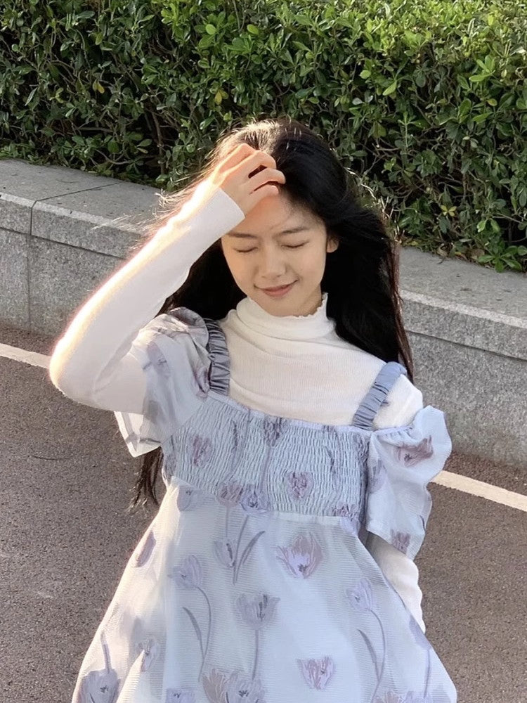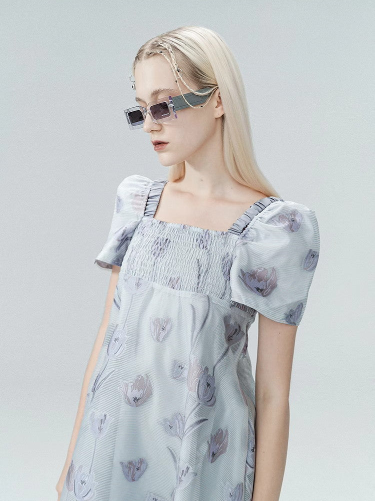 Flare Ciffon Puff-Sleeve Flower Sheer Square-Neck Dress