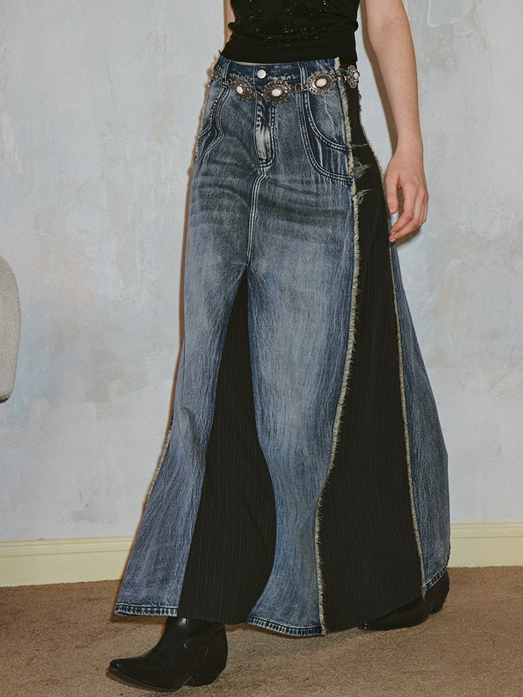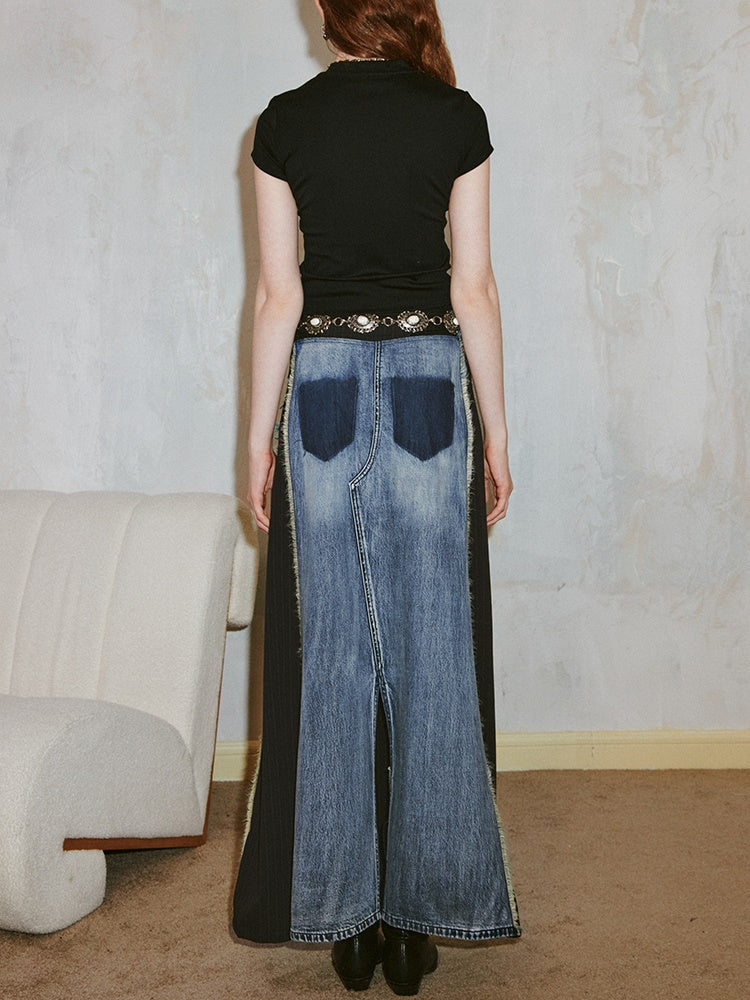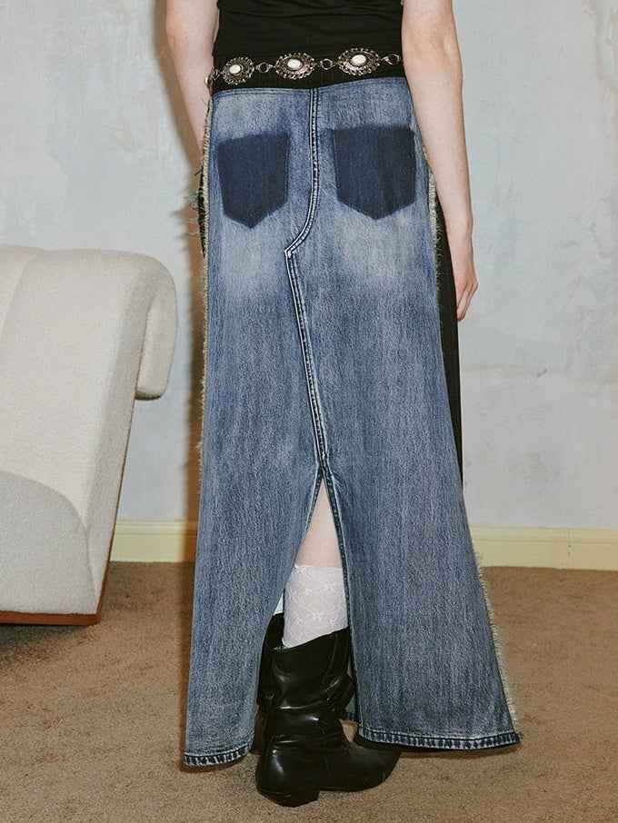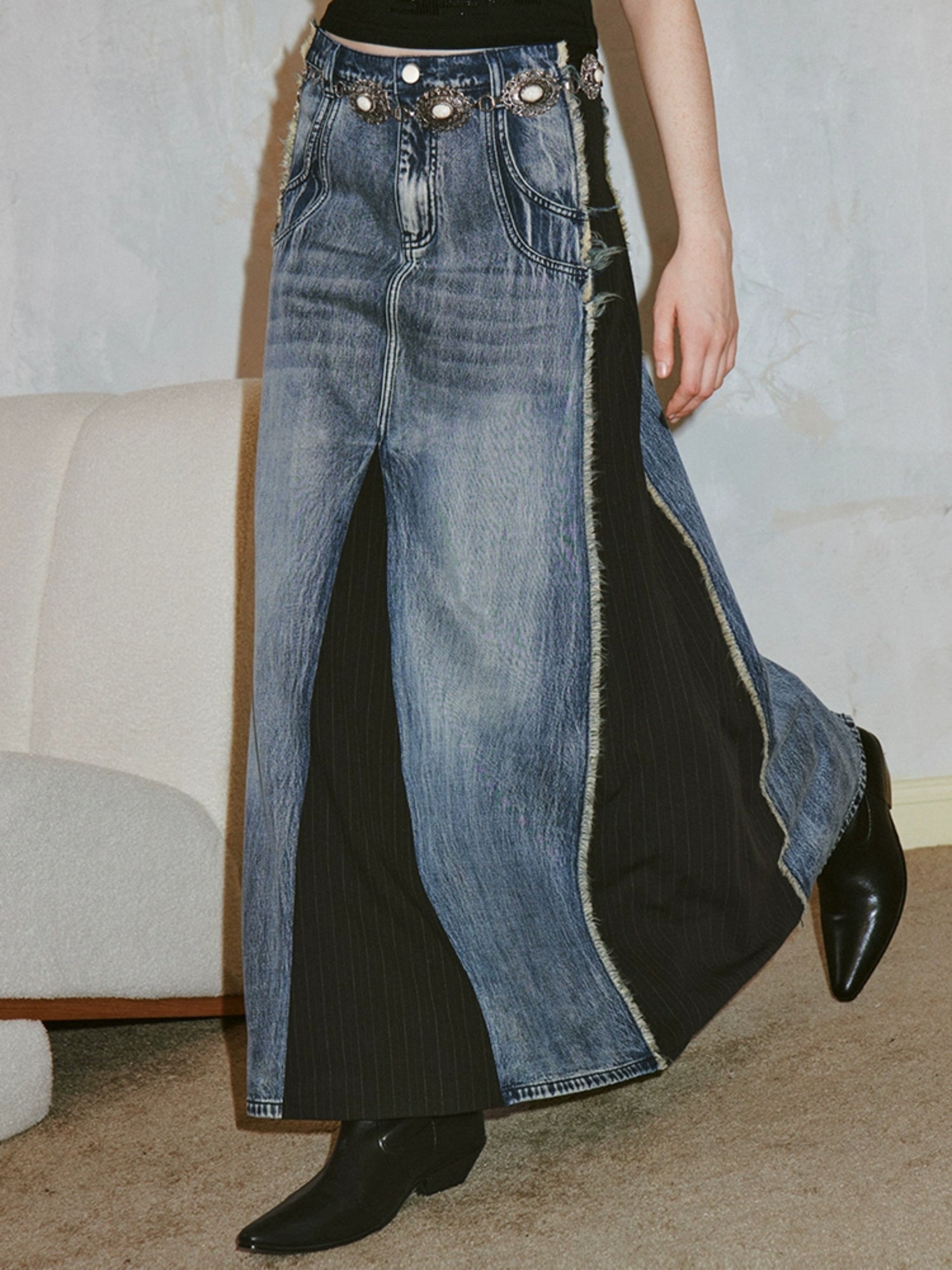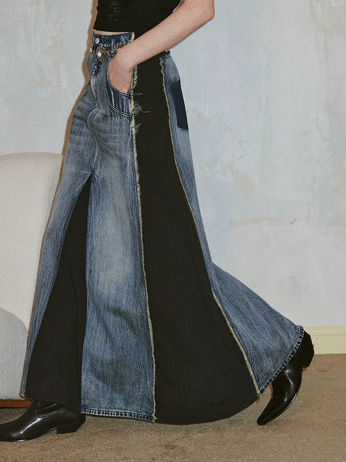 Geometric Cut Washed Raw Edge Denim Patchwork Skirt