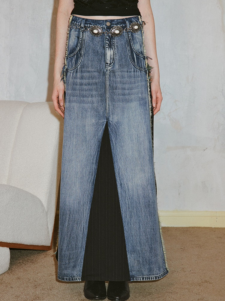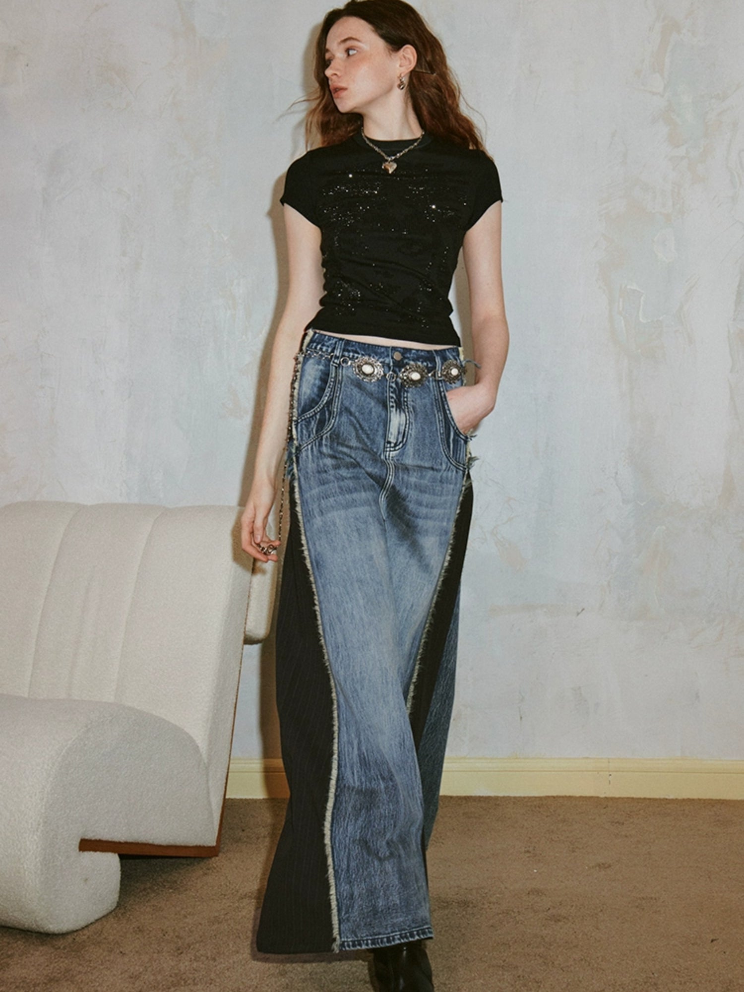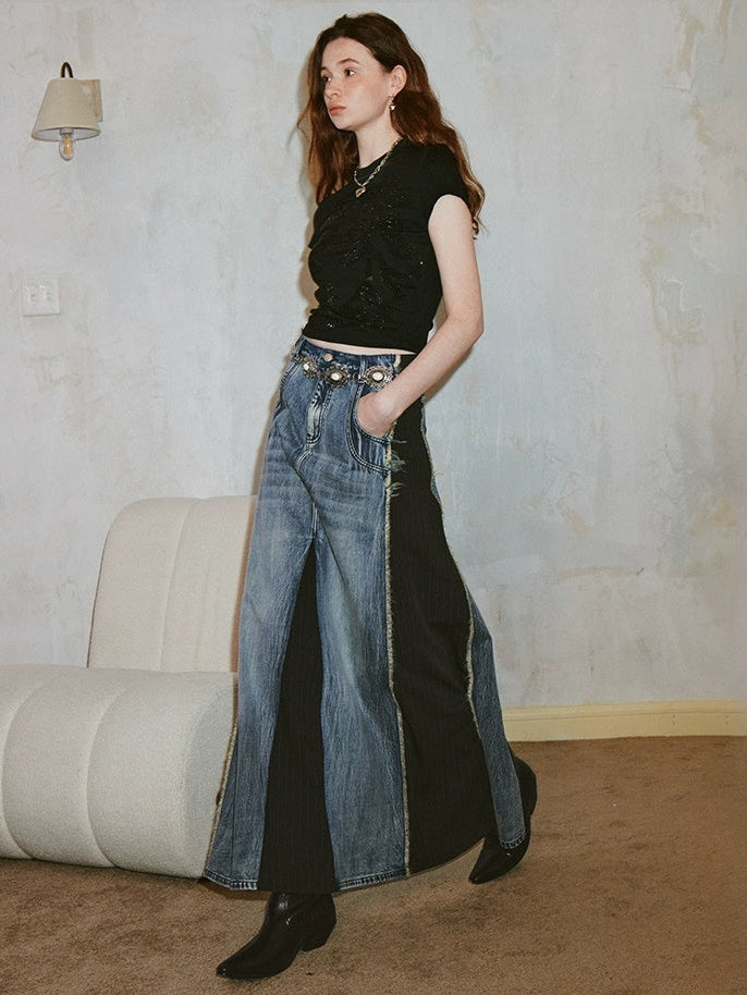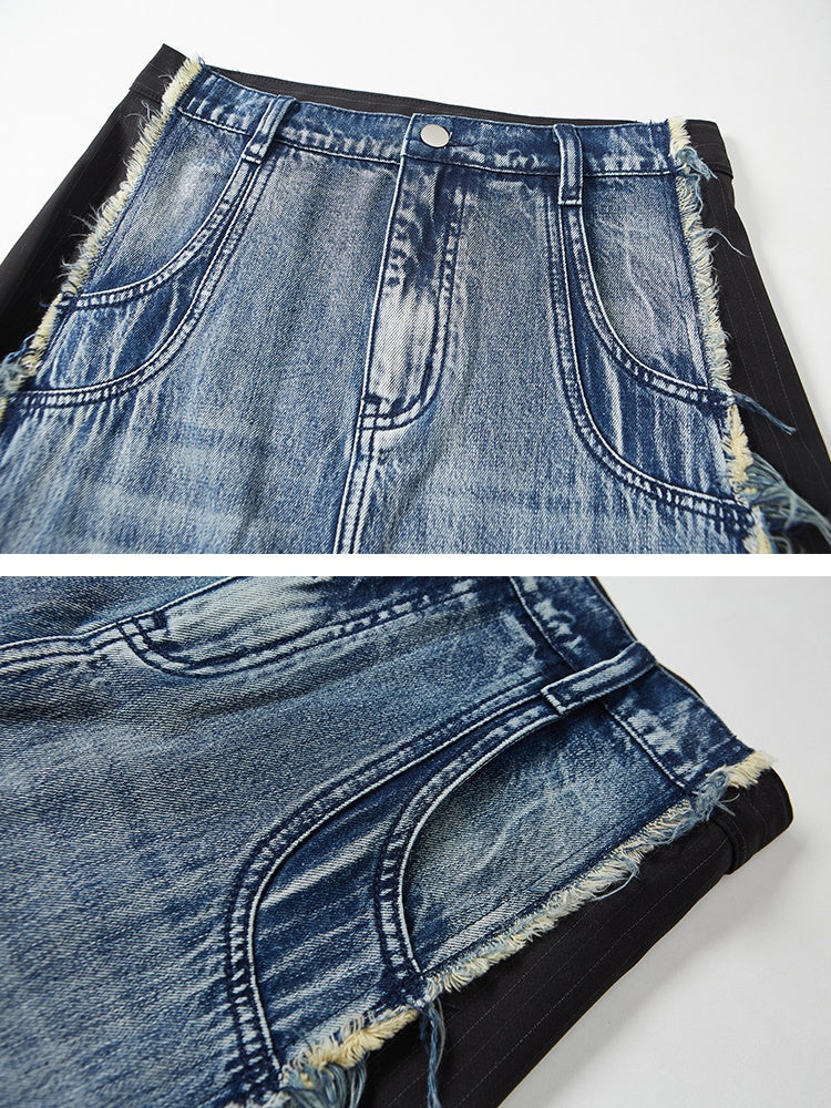 Geometric Cut Washed Raw Edge Denim Patchwork Skirt