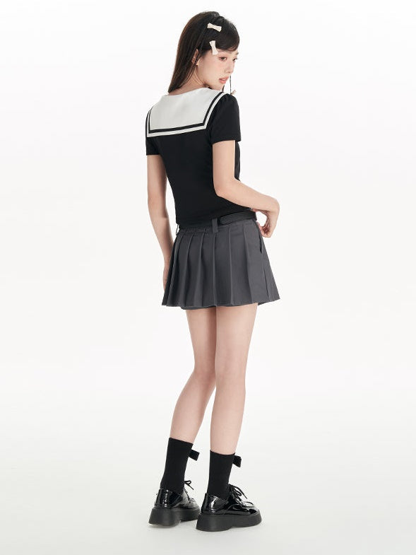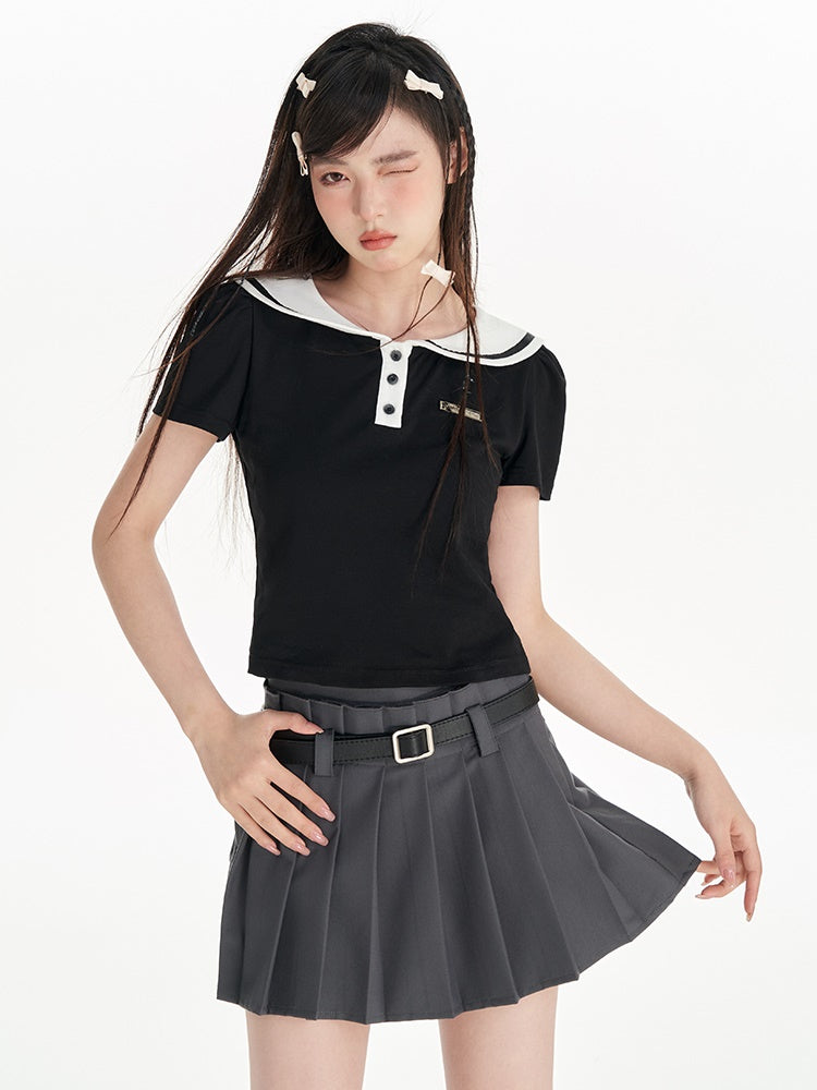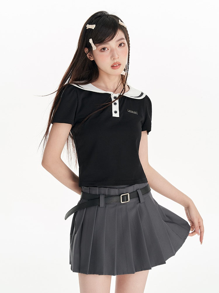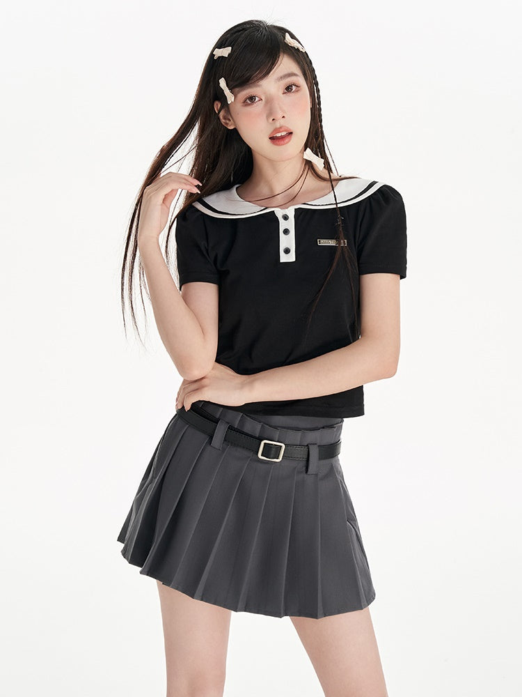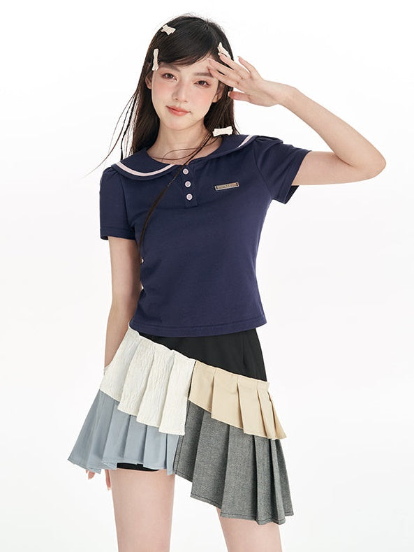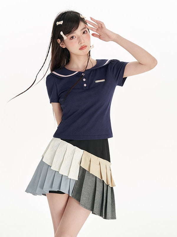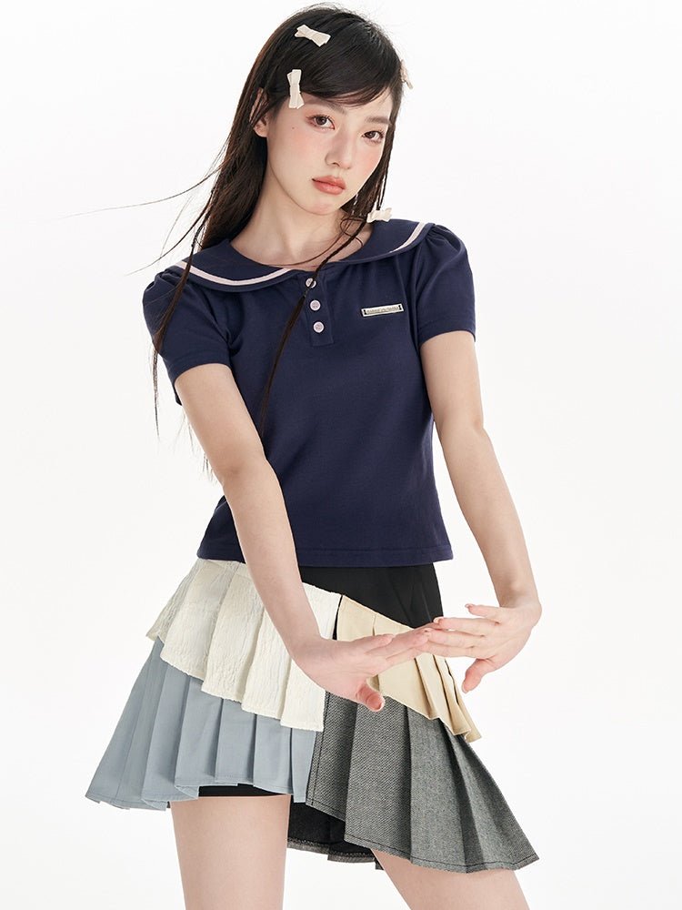 Navy Collar Puff Sleeve T-Shirt