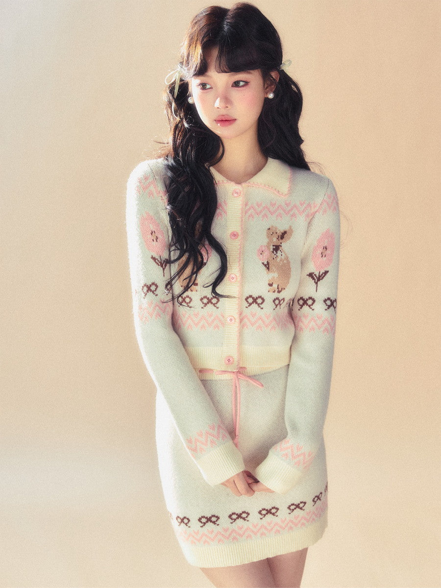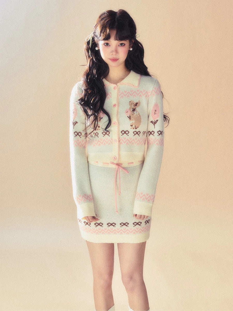 Knit Bear Retro Cute Drawstring Set-Up Tops&Mini-Skirt