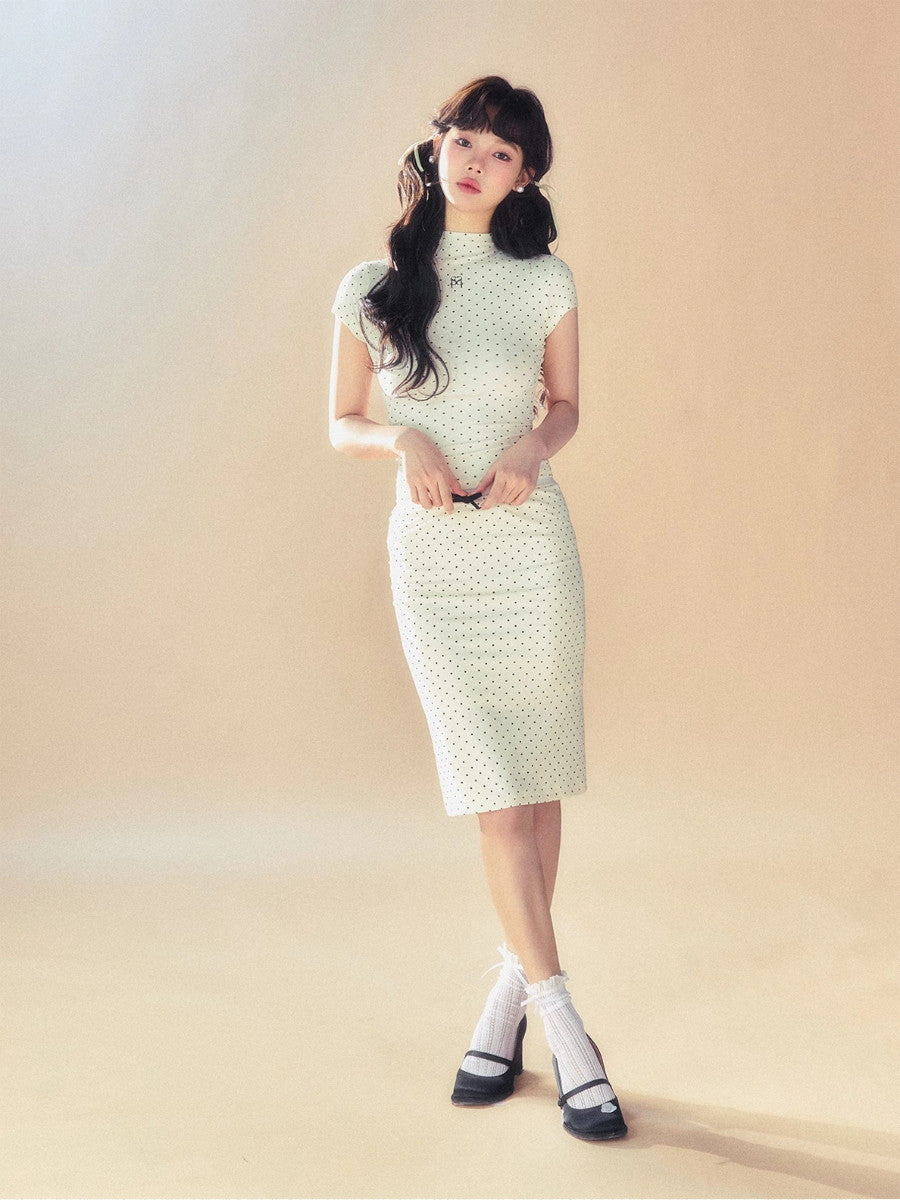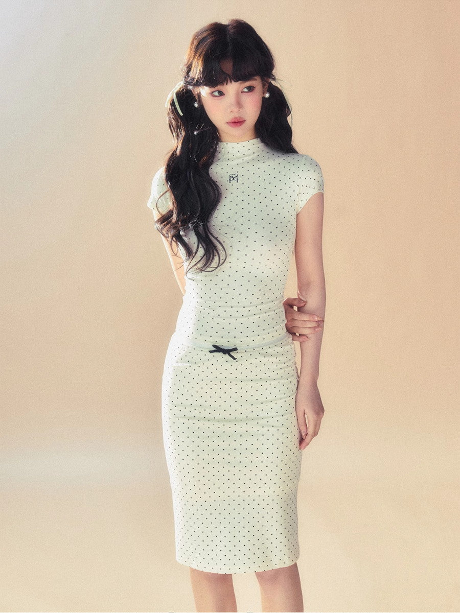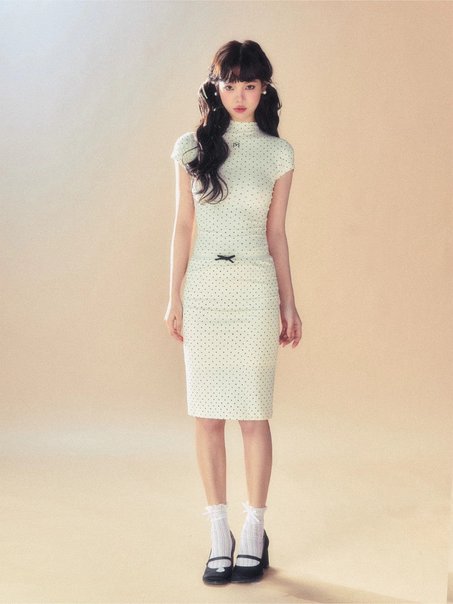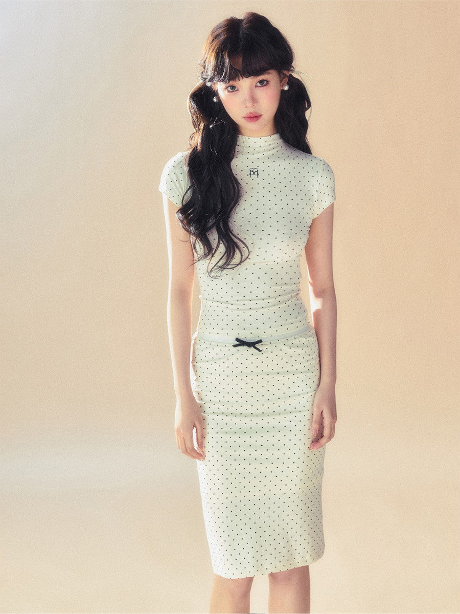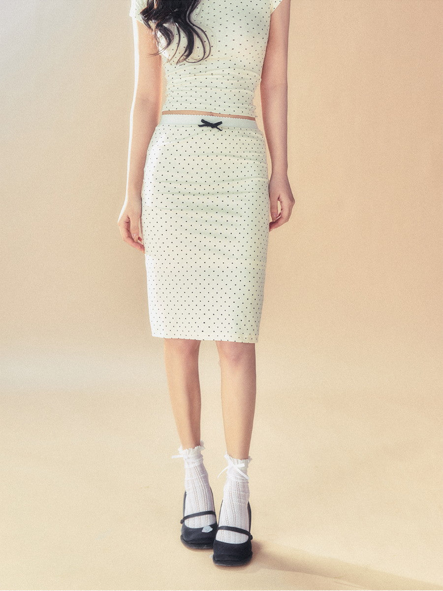 Knit Stretch Dot Ribbon Girly Tight Casual Retro Middle Pencil-Skirt