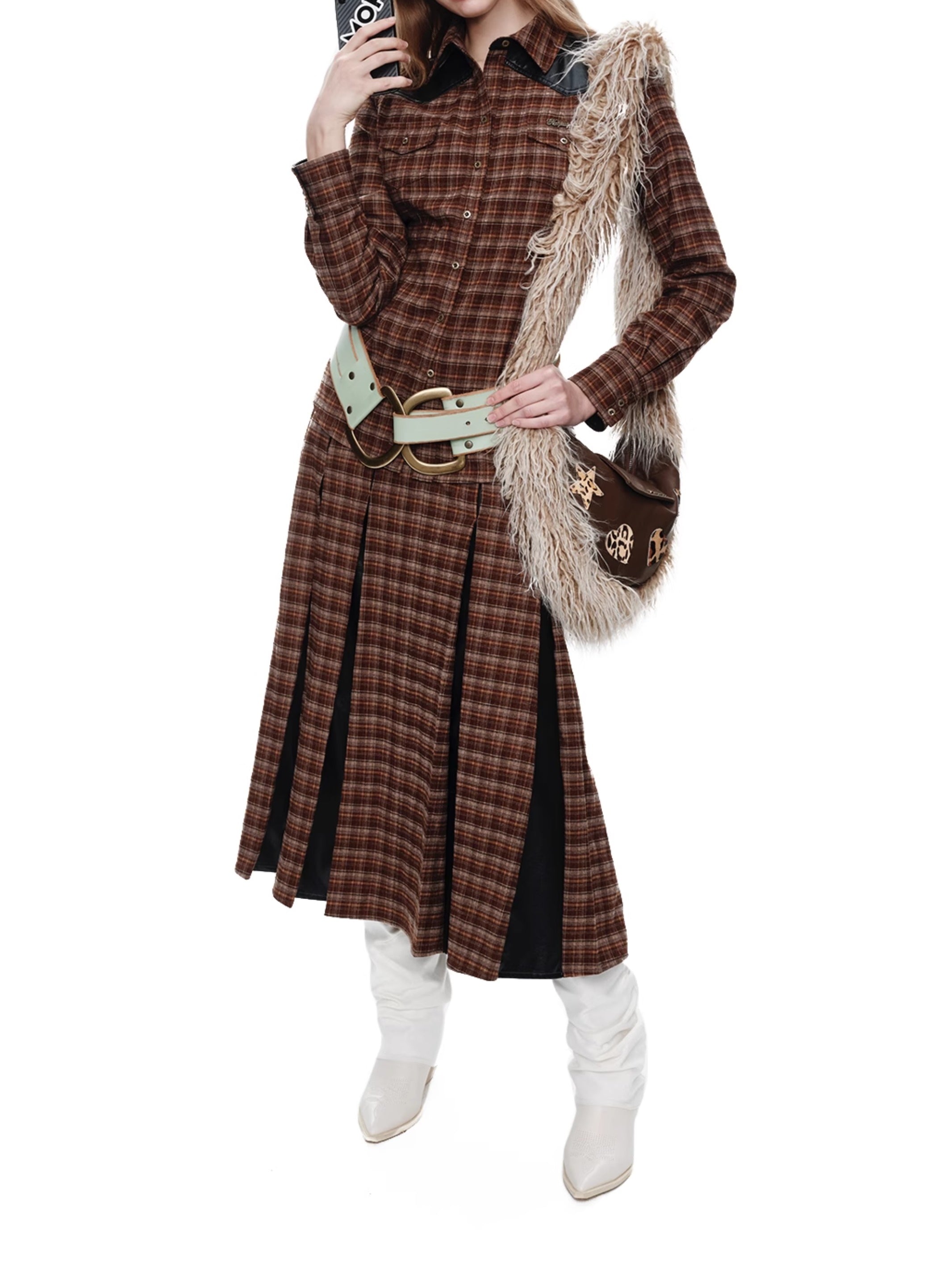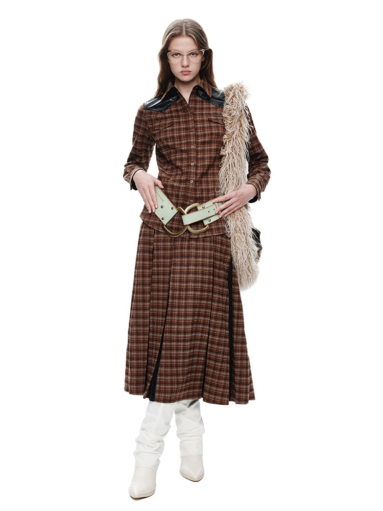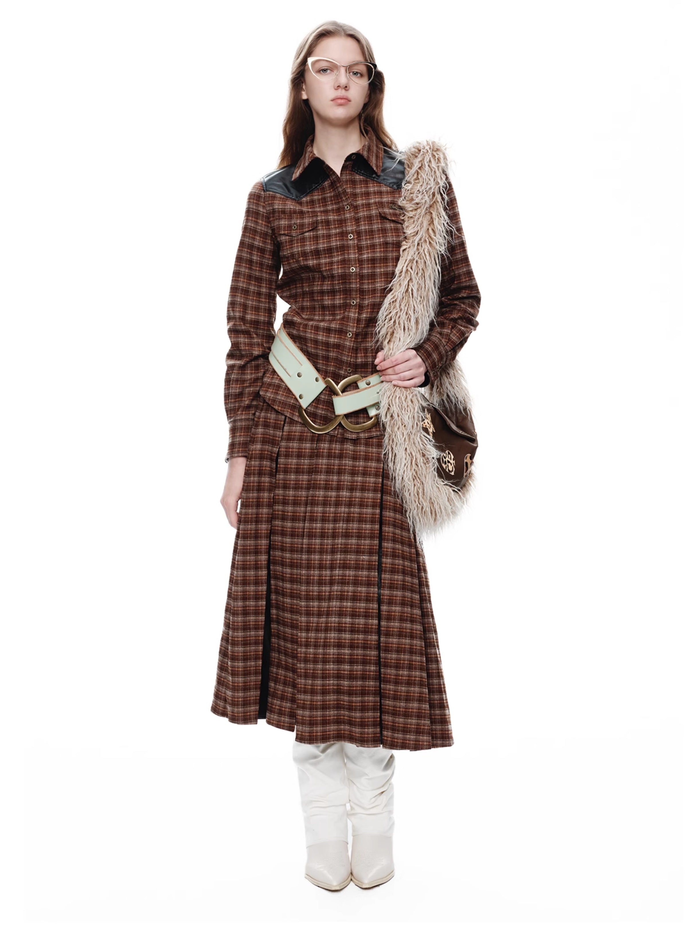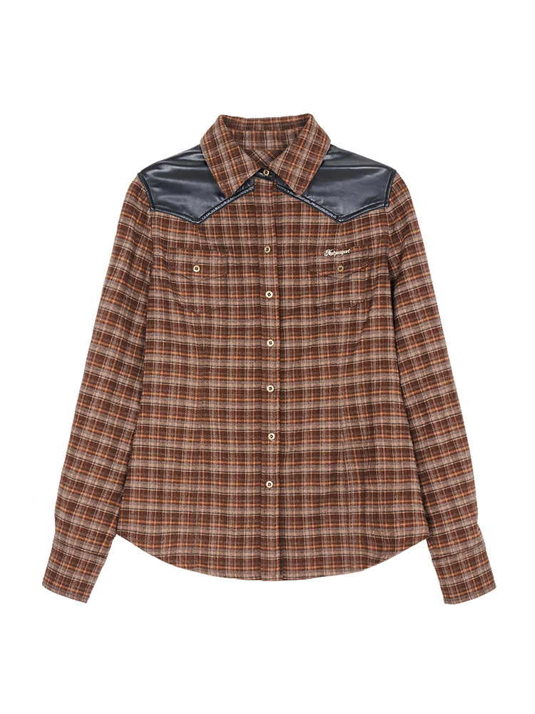 Leather-Mix Checked Retro Casual Flannel-Shirt