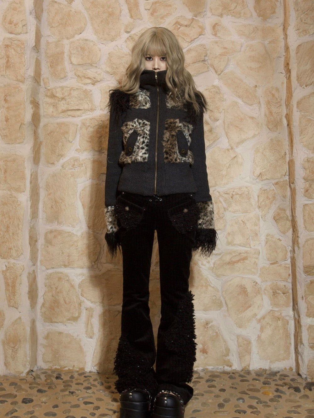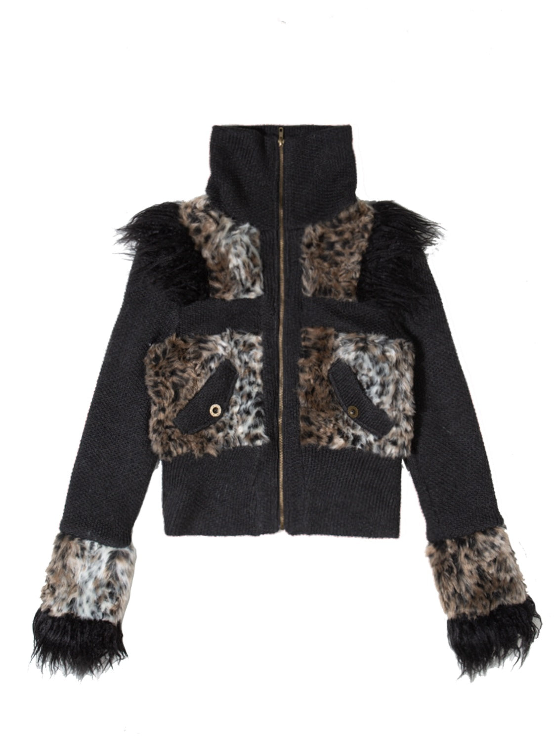 Leopard High-Neck Zip Casual Boa Knit