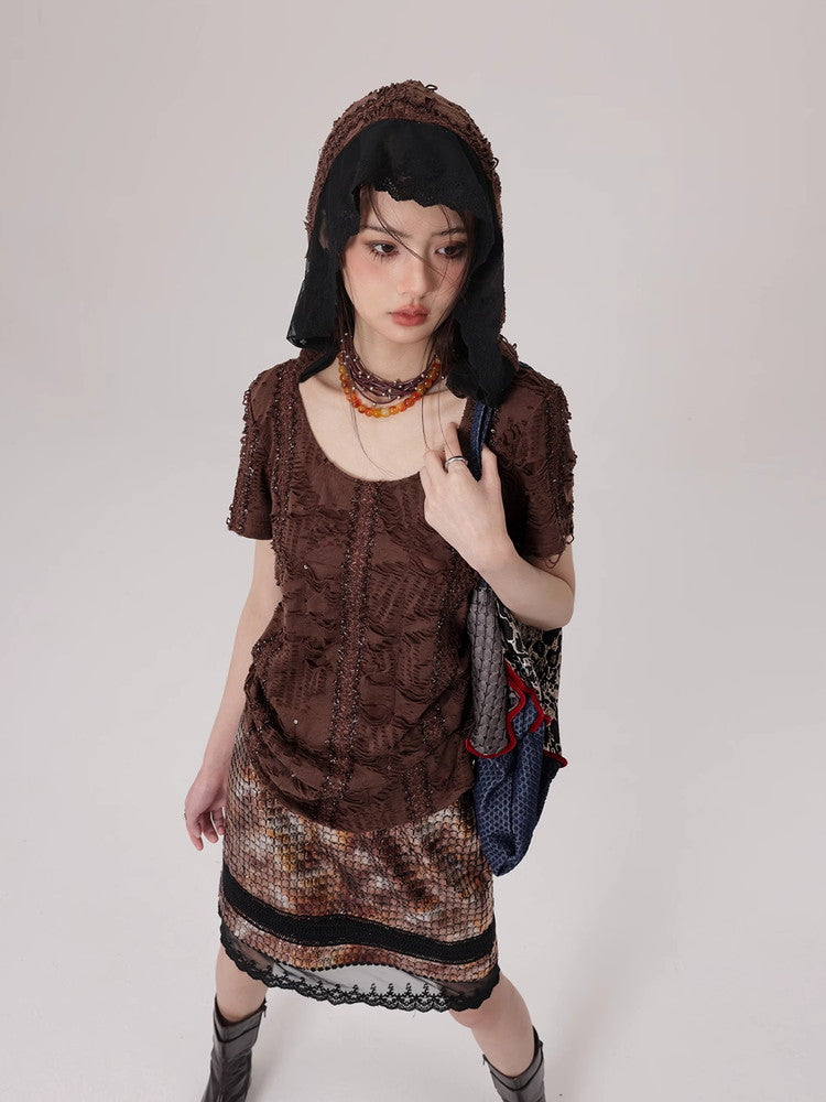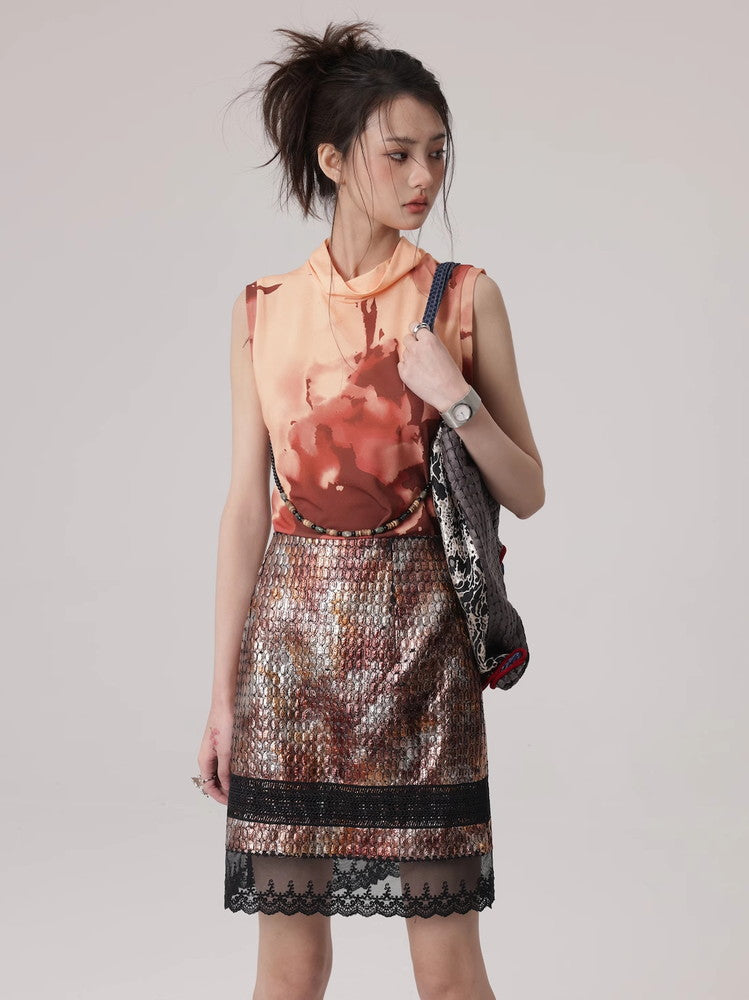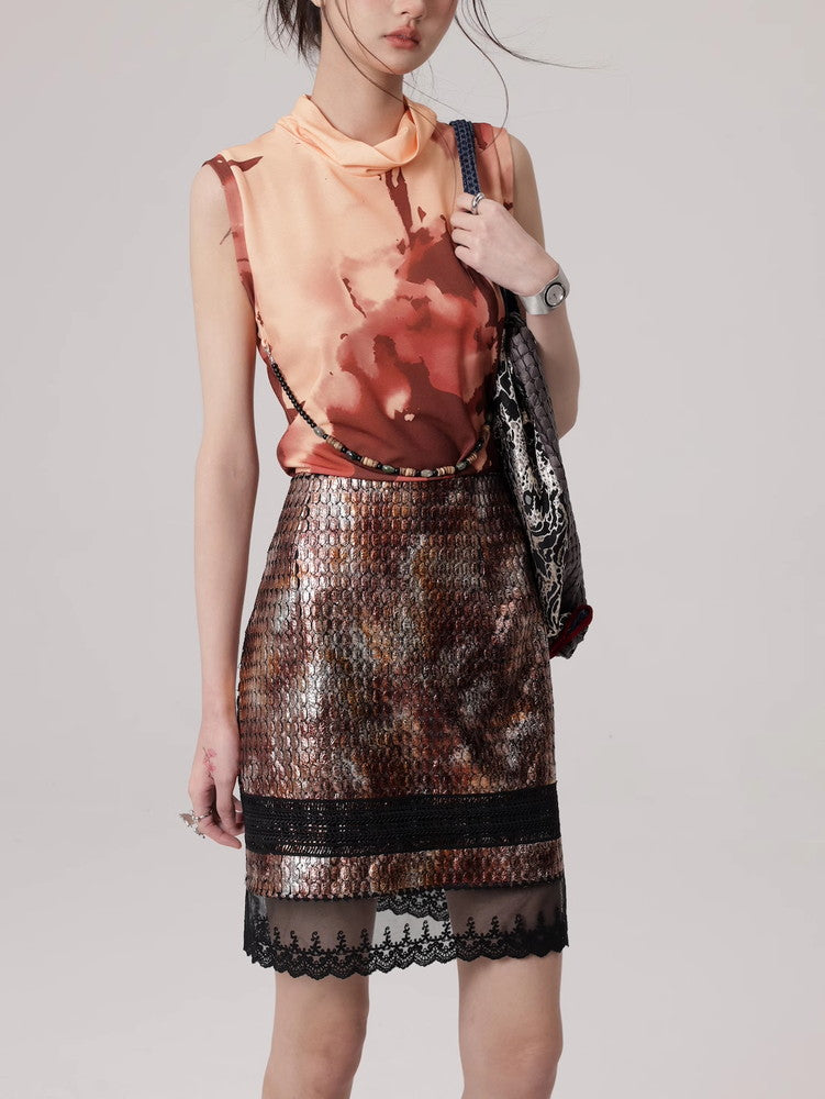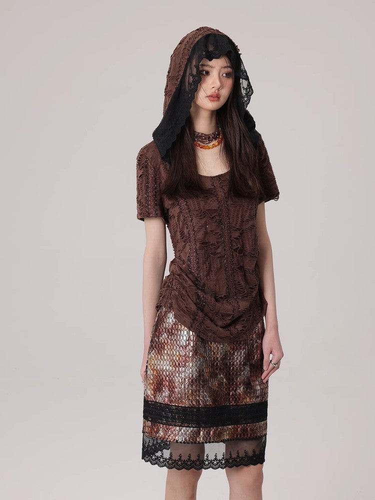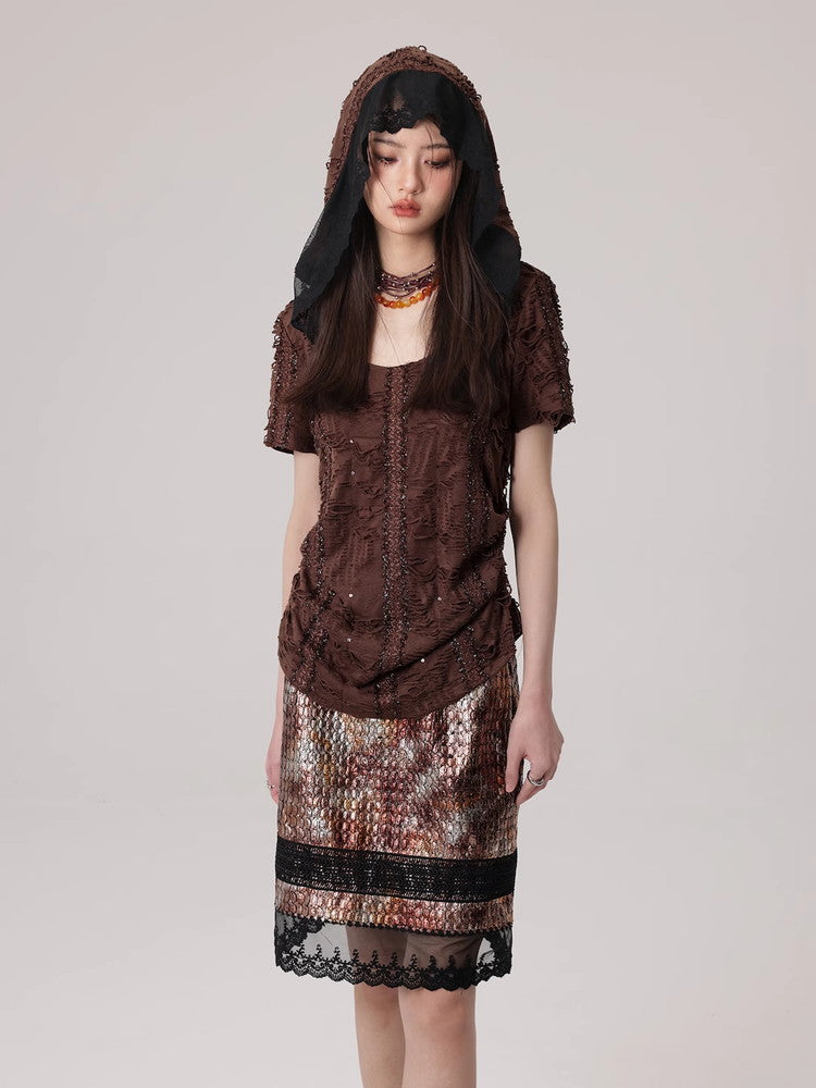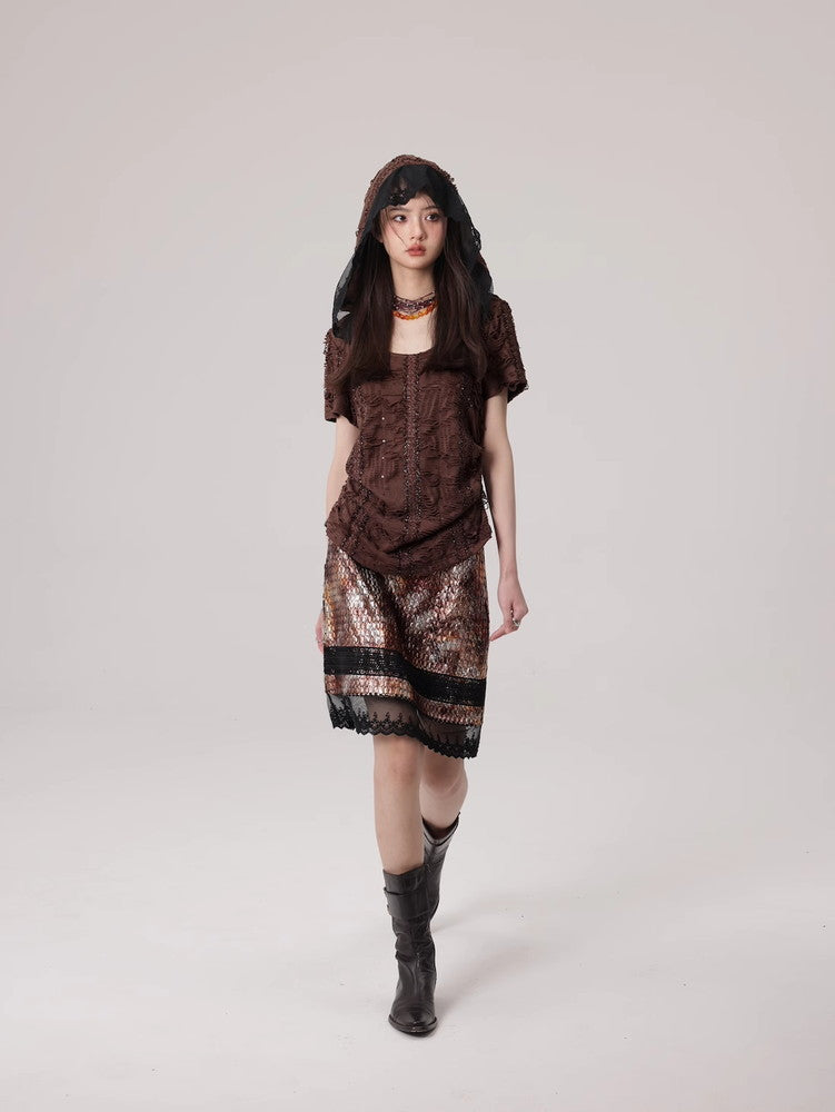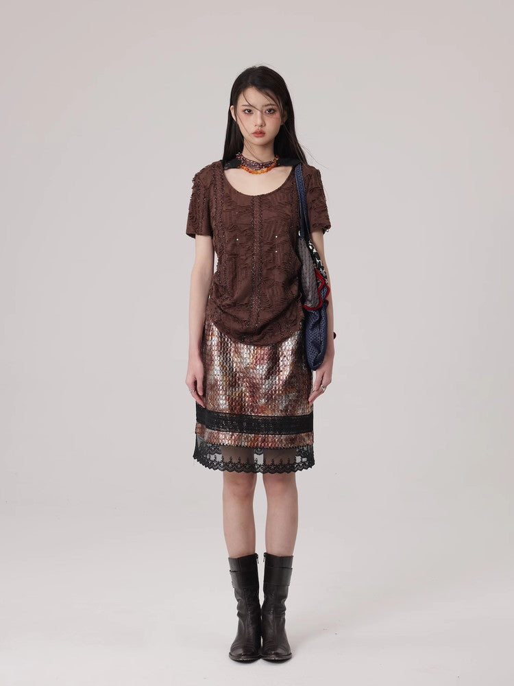 Mesh Lace Flower Crocodile Embroidery Metallic Skirt