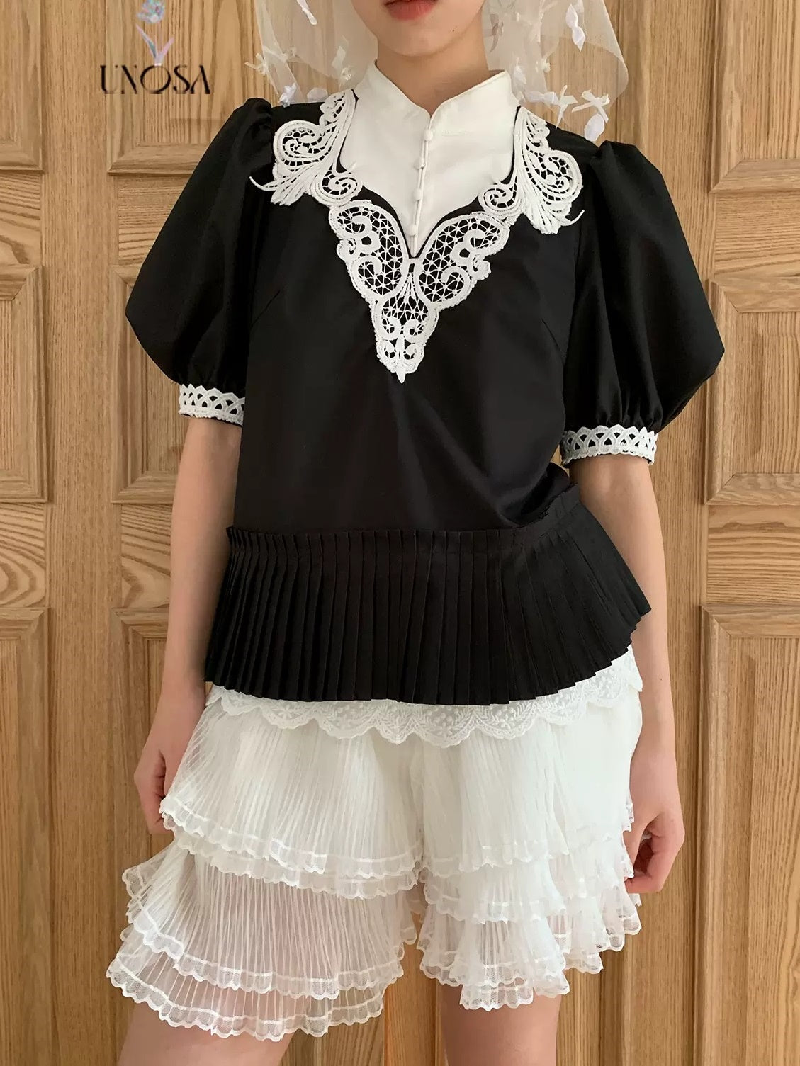 Monotone Lace Stitching Chinese Collar Puff Sleeve Shirt