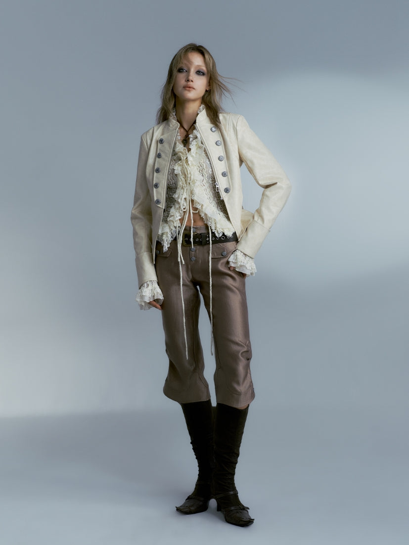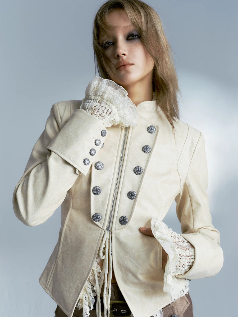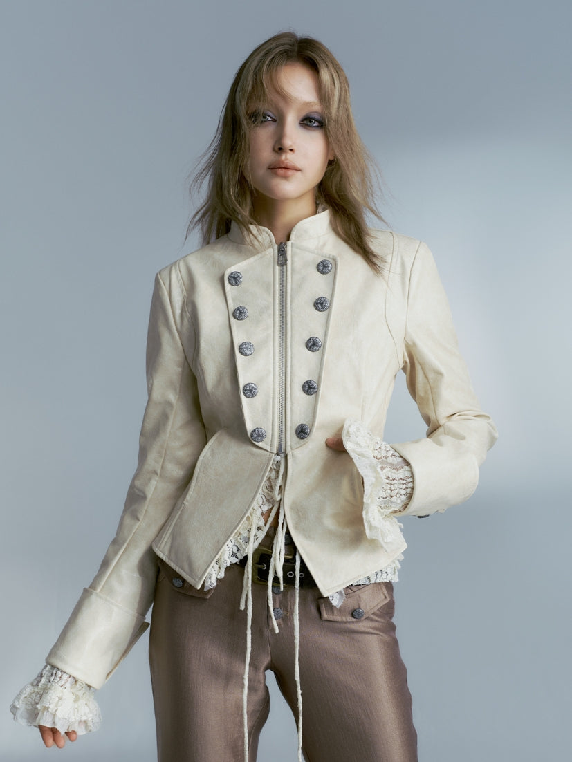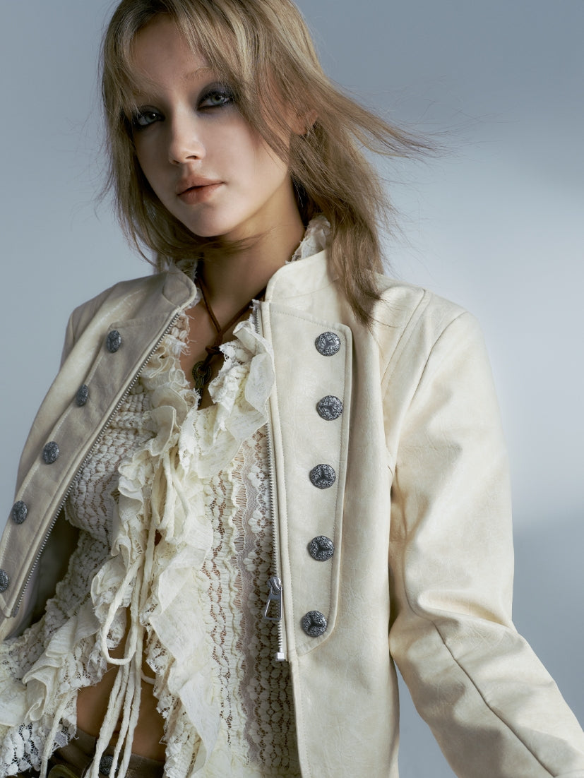 Nichi Mao-Collar Retro Zip Short Leahter-Jacket