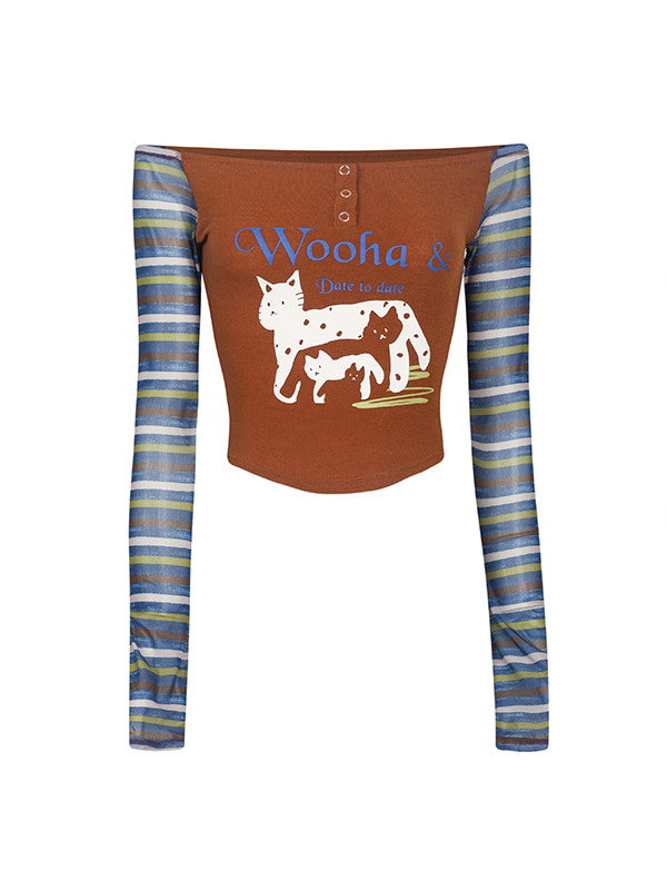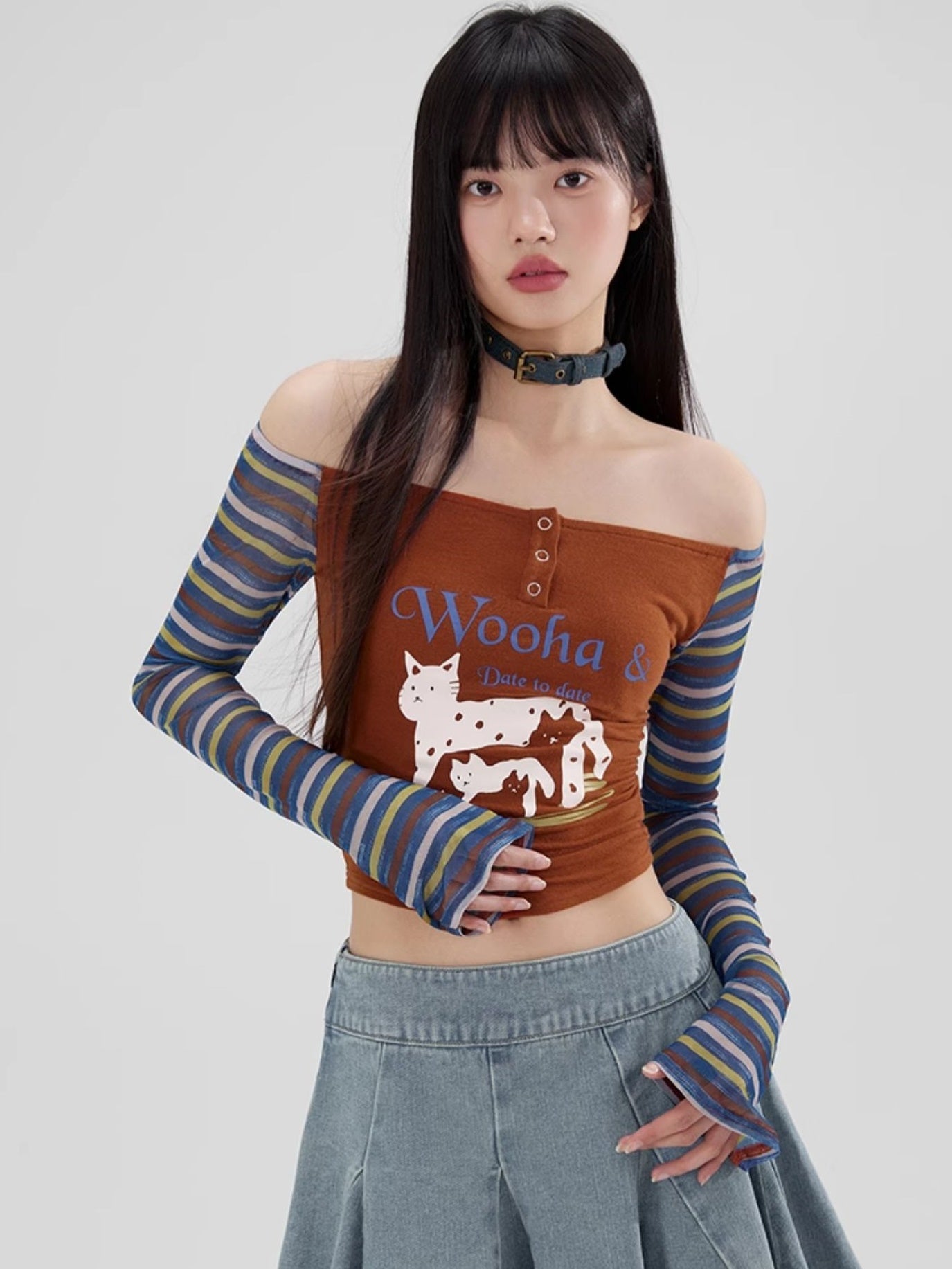 Off-Shoulder Border Animal Cat Fancy Unique Casual Tops