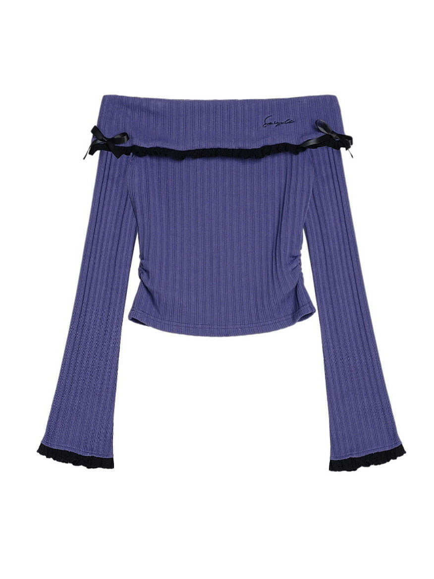 Off-Shoulder Ribbon Gather Embroidery Dark Knit