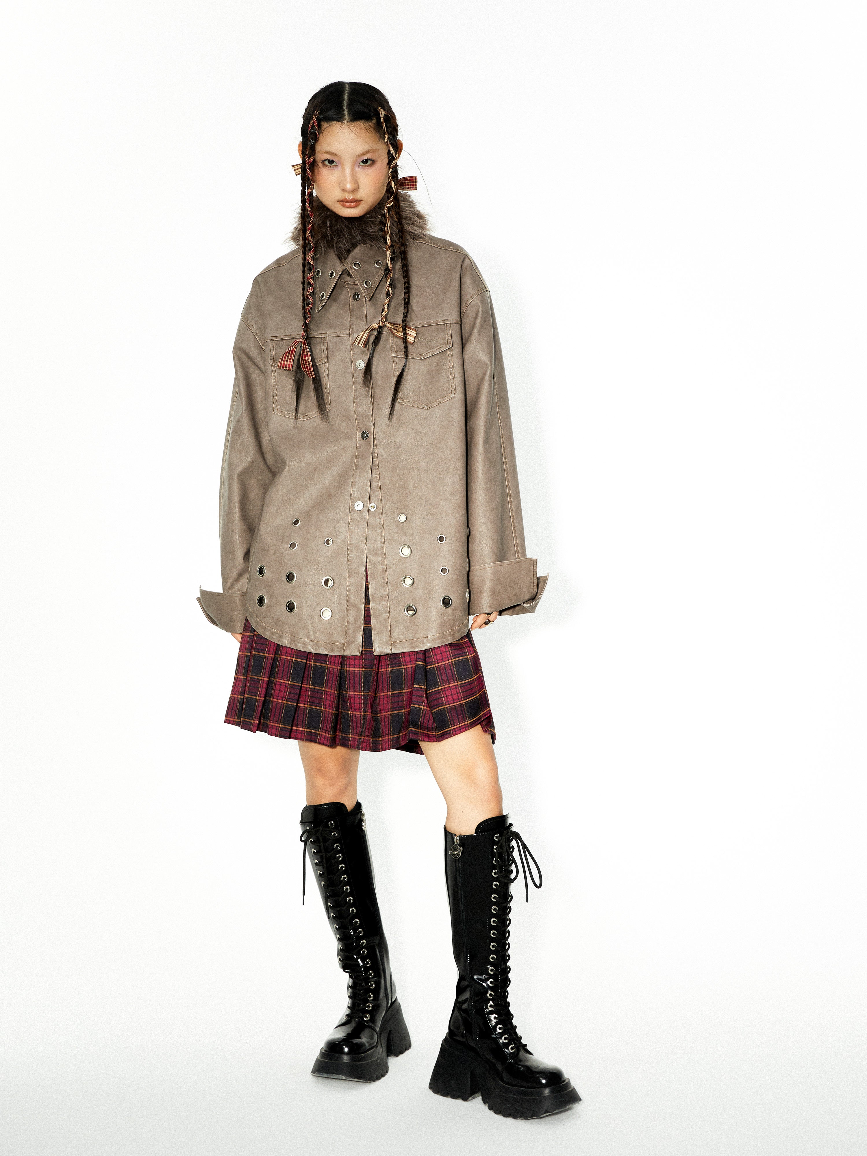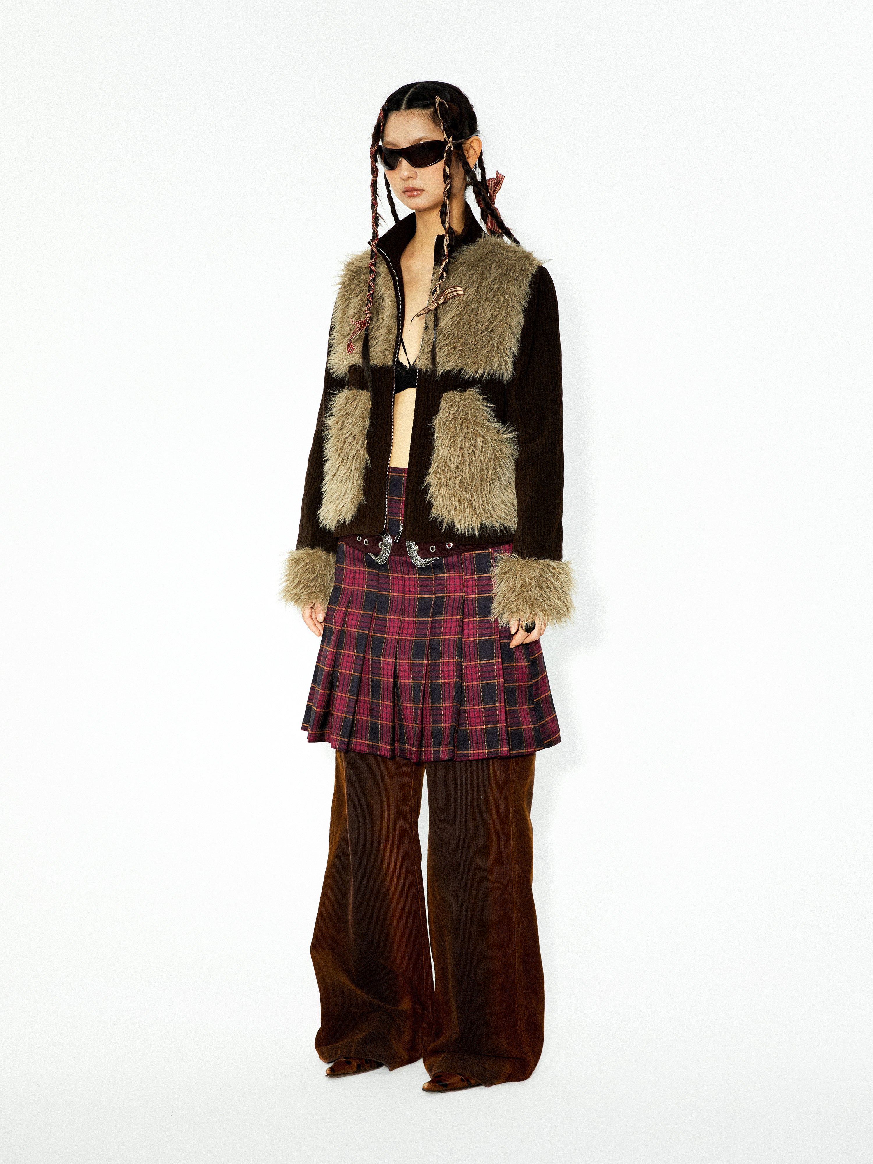 Plaid Stitching ZIP-Up Jacket & Metal Decoration Pleated Skirt